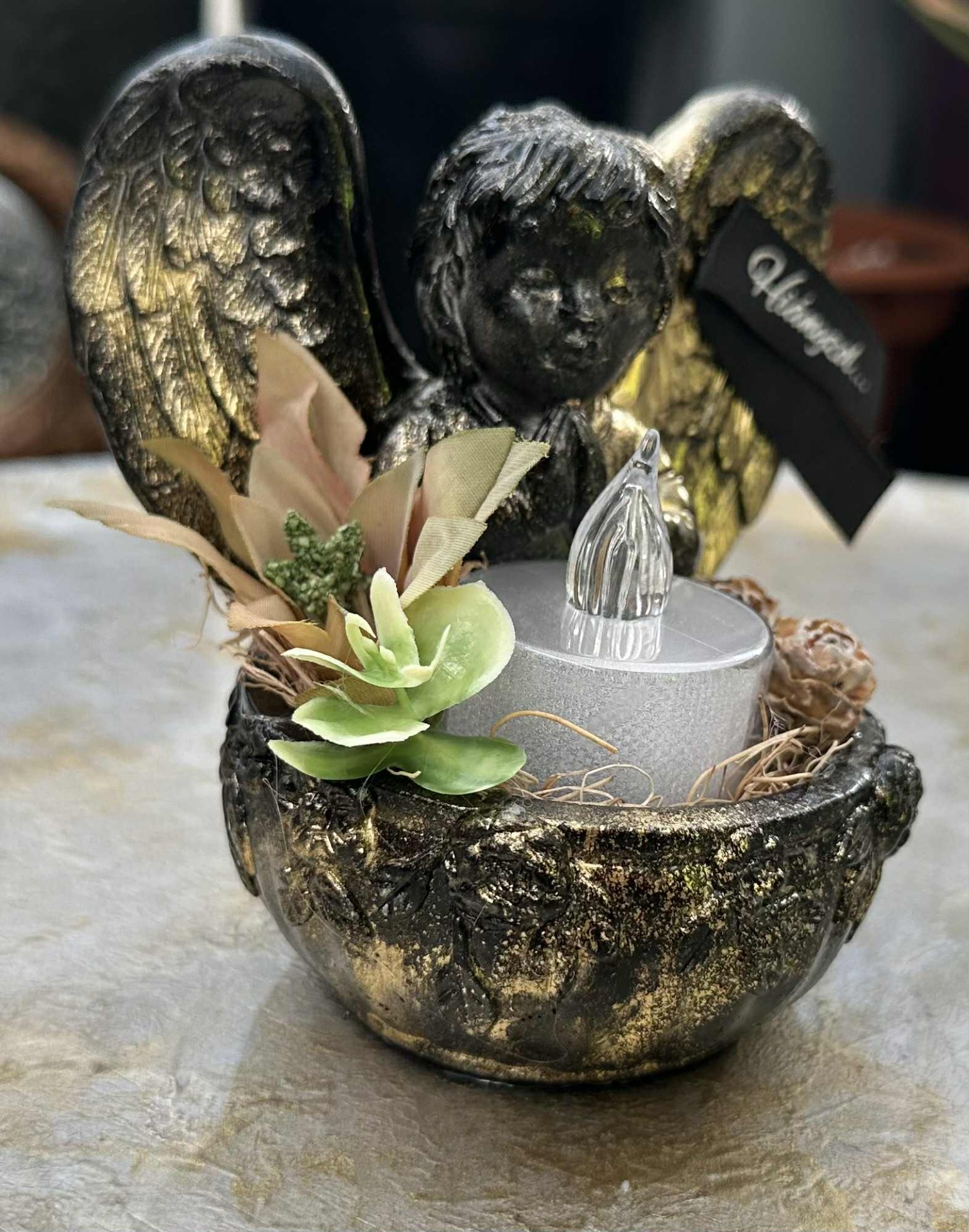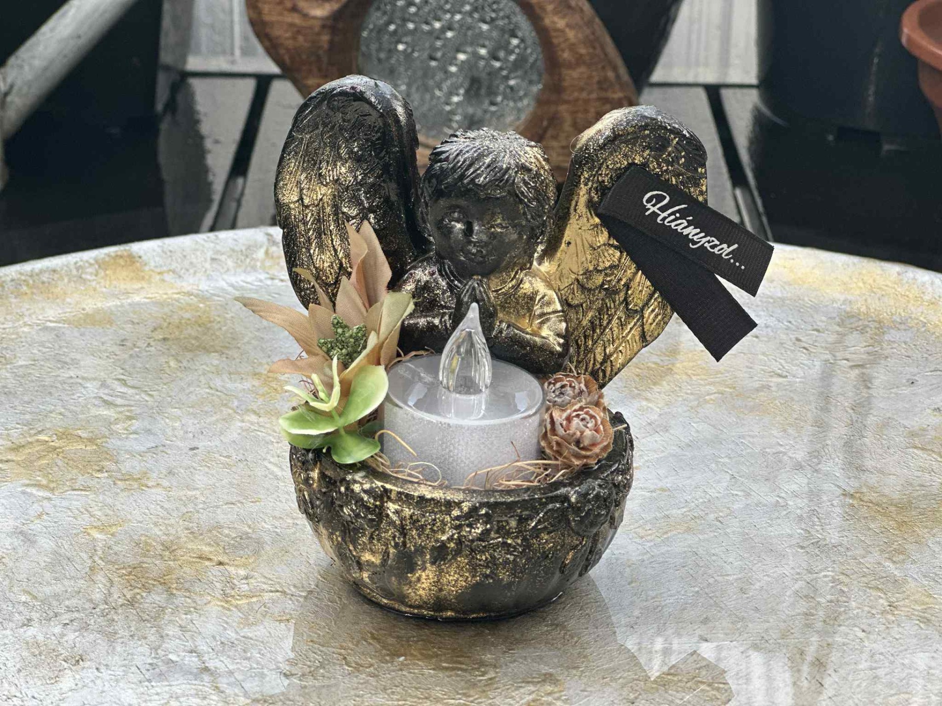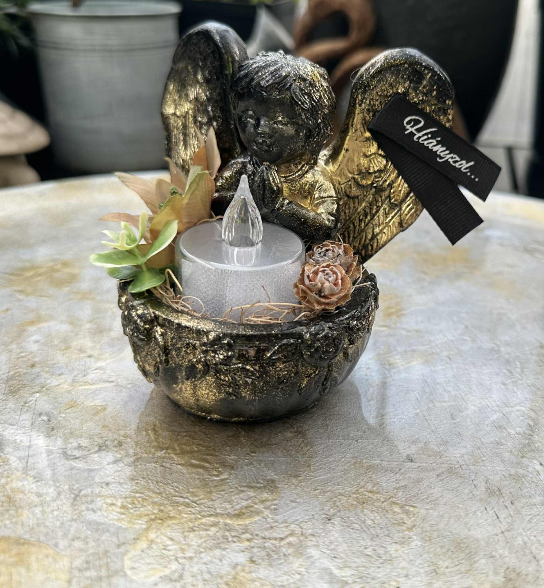 Fagyálló imádkozó angyalka, fekete, arany színösszeállítással, szárazvirág beültetésekkel, mécses világítással.