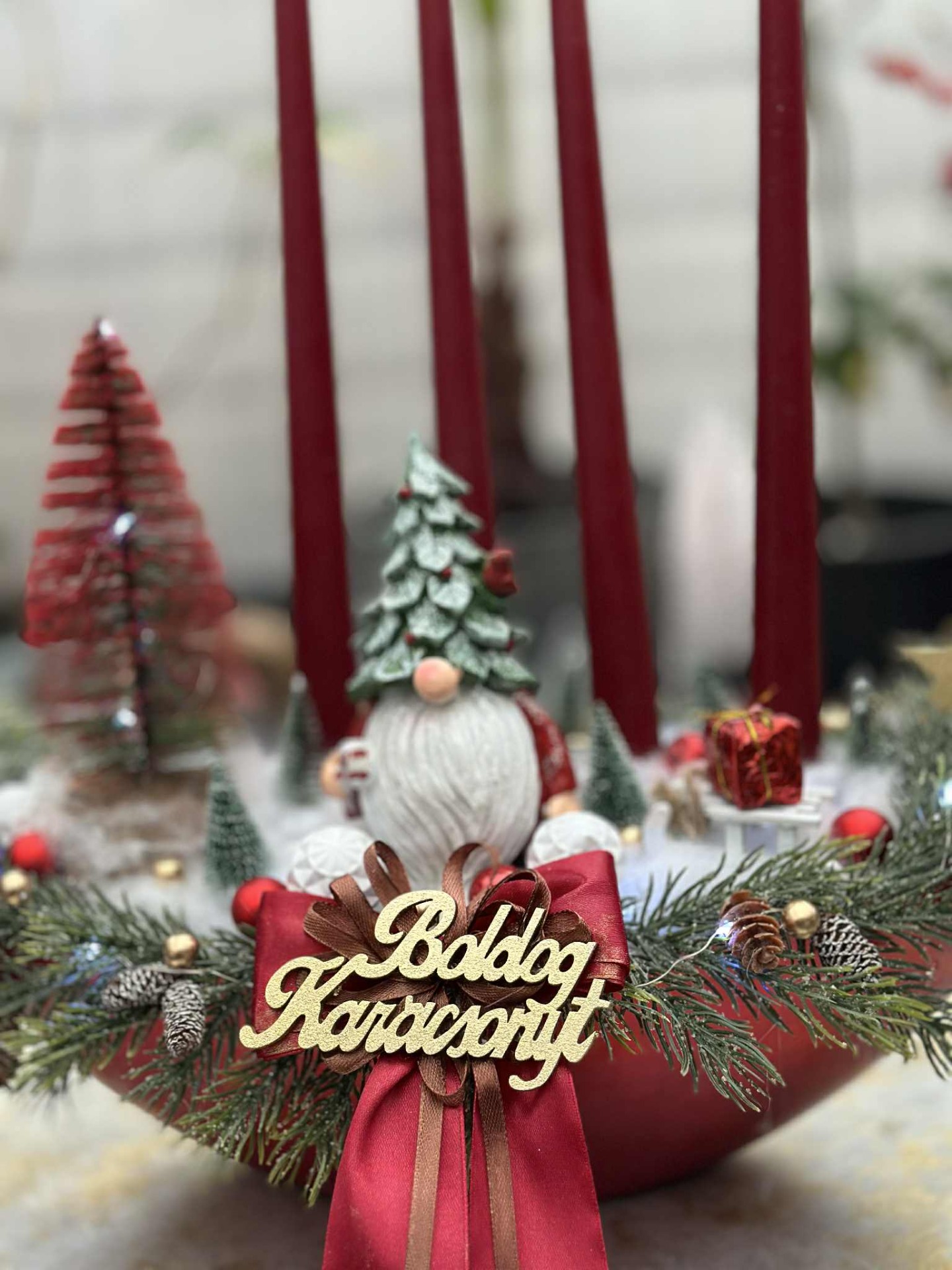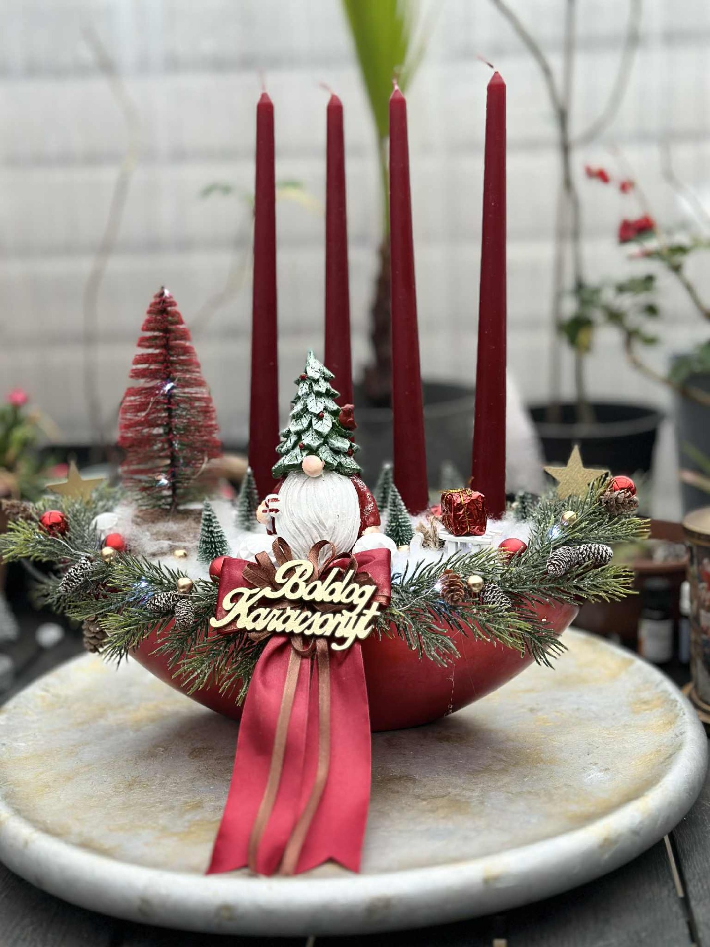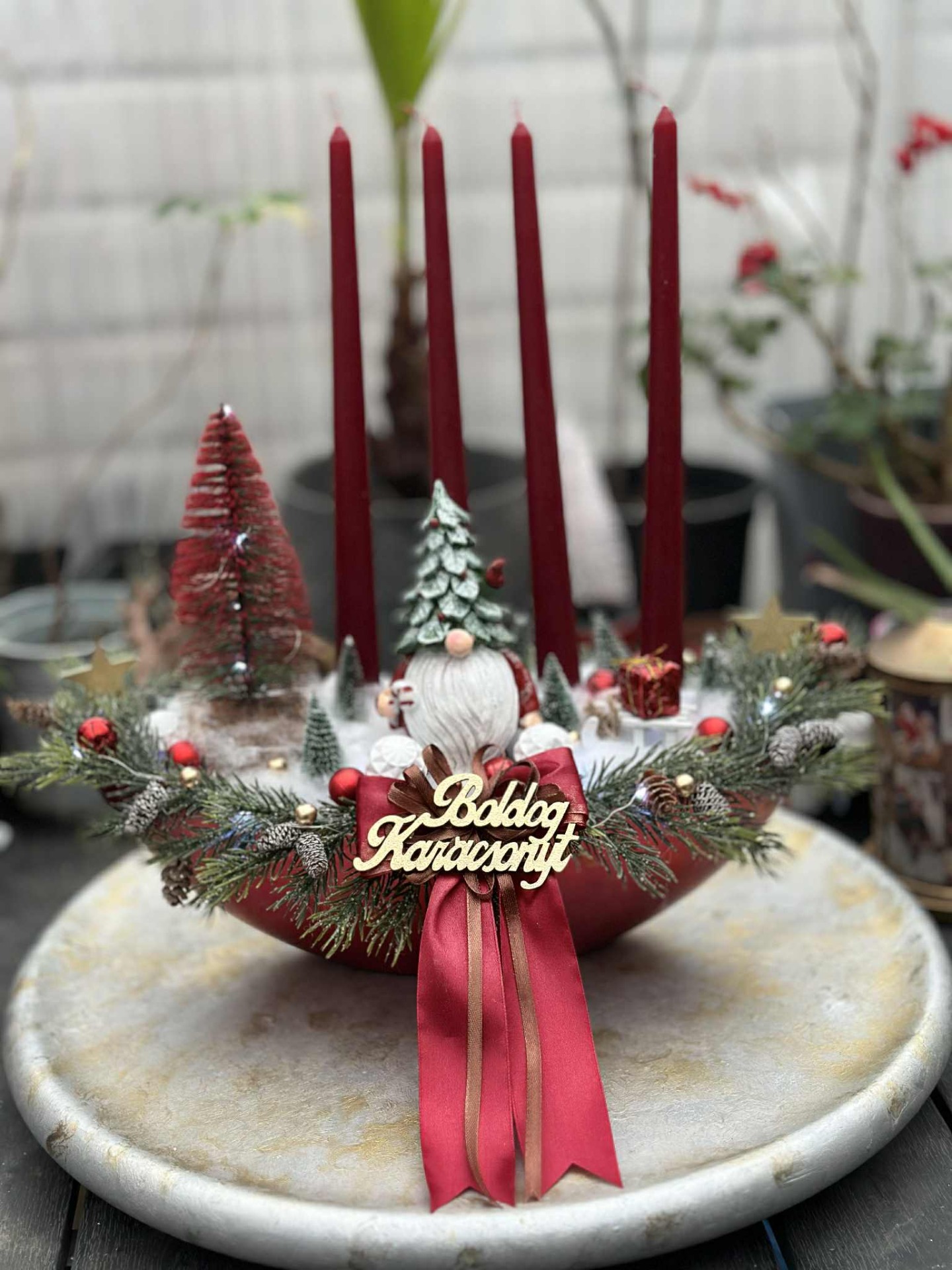 Adventi tál , manóval, kis madárral, hidegfehér színű világítással, bordó, zöld, fehér barna színösszeállítással, műfenyő ágakkal, "Boldog Karácsonyt" fafelirattal.