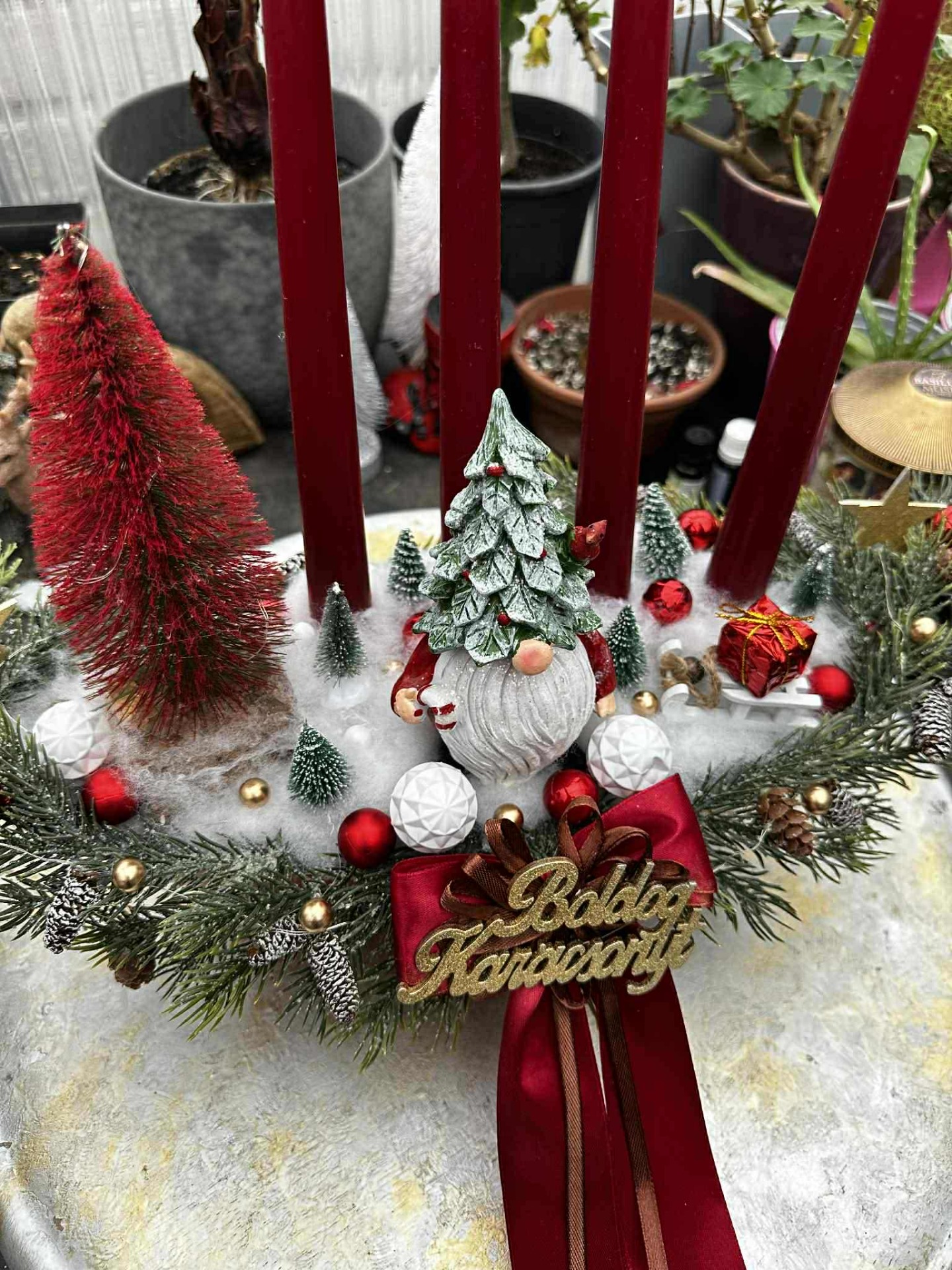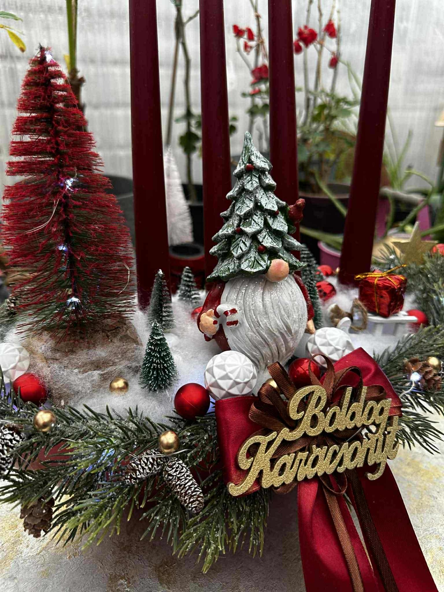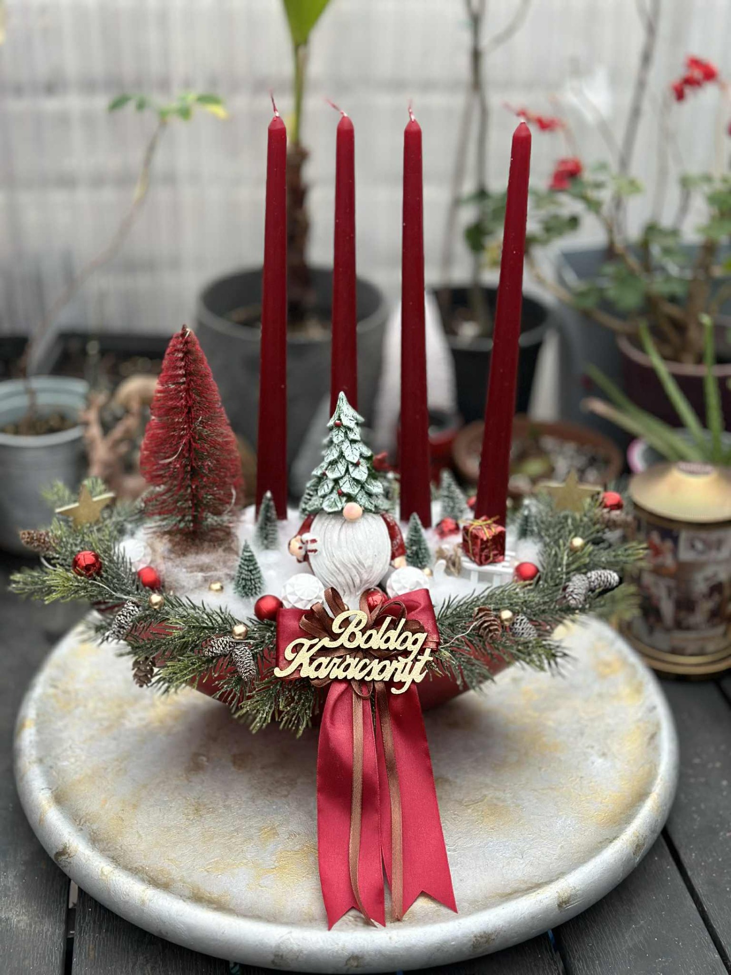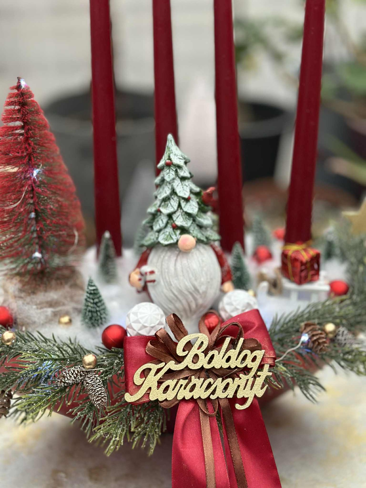 Adventi tál , manóval, kis madárral, hidegfehér színű világítással, bordó, zöld, fehér barna színösszeállítással, műfenyő ágakkal, "Boldog Karácsonyt" fafelirattal.