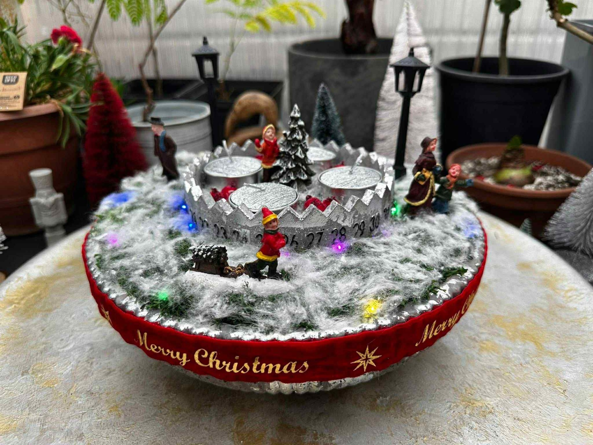 Adventi fagyálló tál, benne adventi naptár fagyálló tál, téli mese kompozíció, színes világítással.