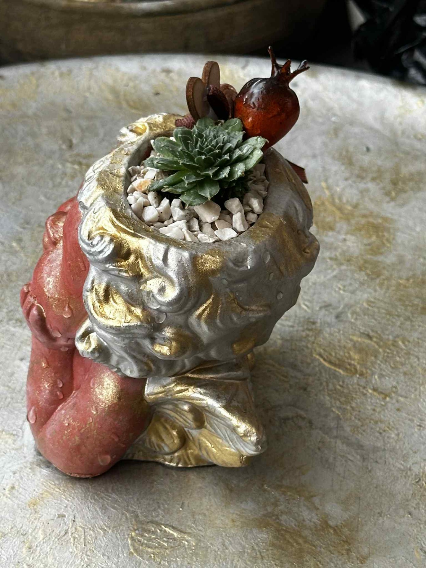 Fagyálló angyalka kaspó, élő pozsgással beültetve, dekorációval, dekorkővel megszórva, rose gold, arany, ezüst színösszeállítással.
