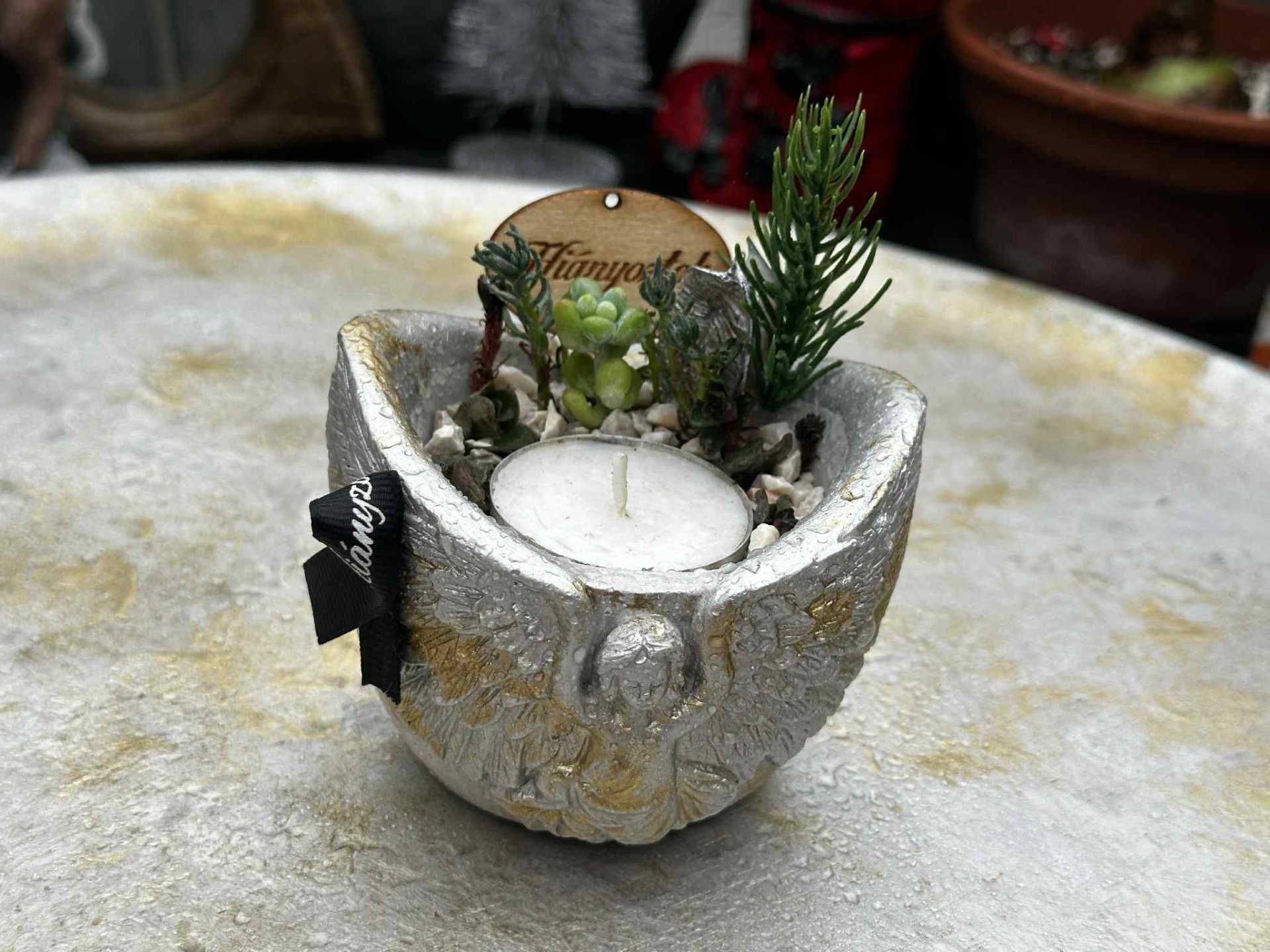 Fagyálló, angyalkás kaspó, nagy szárnyakkal, élő pozsgással beültetve, fehér dekorkővel megszórva, "Hiányoztok" fa táblával, teamécsessel, kis dekorációval és "Hiányzol" szalaggal, ezüst, arany színösszeállítással.