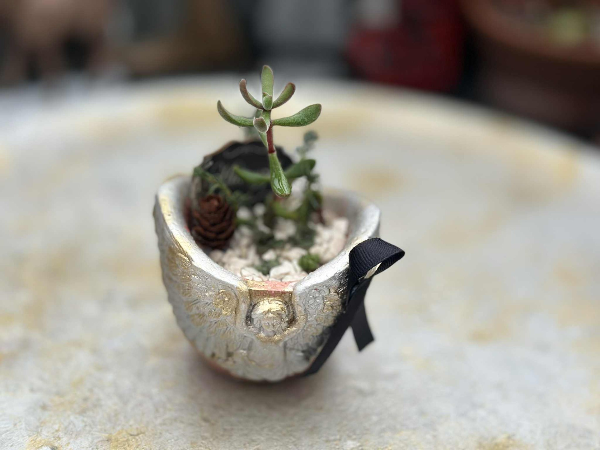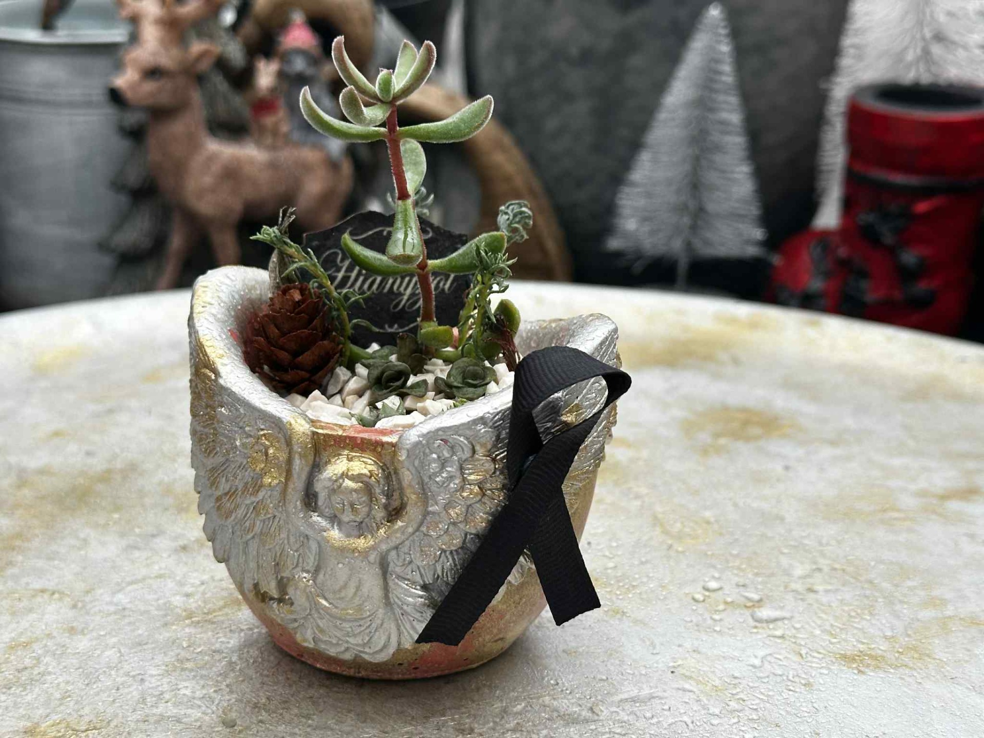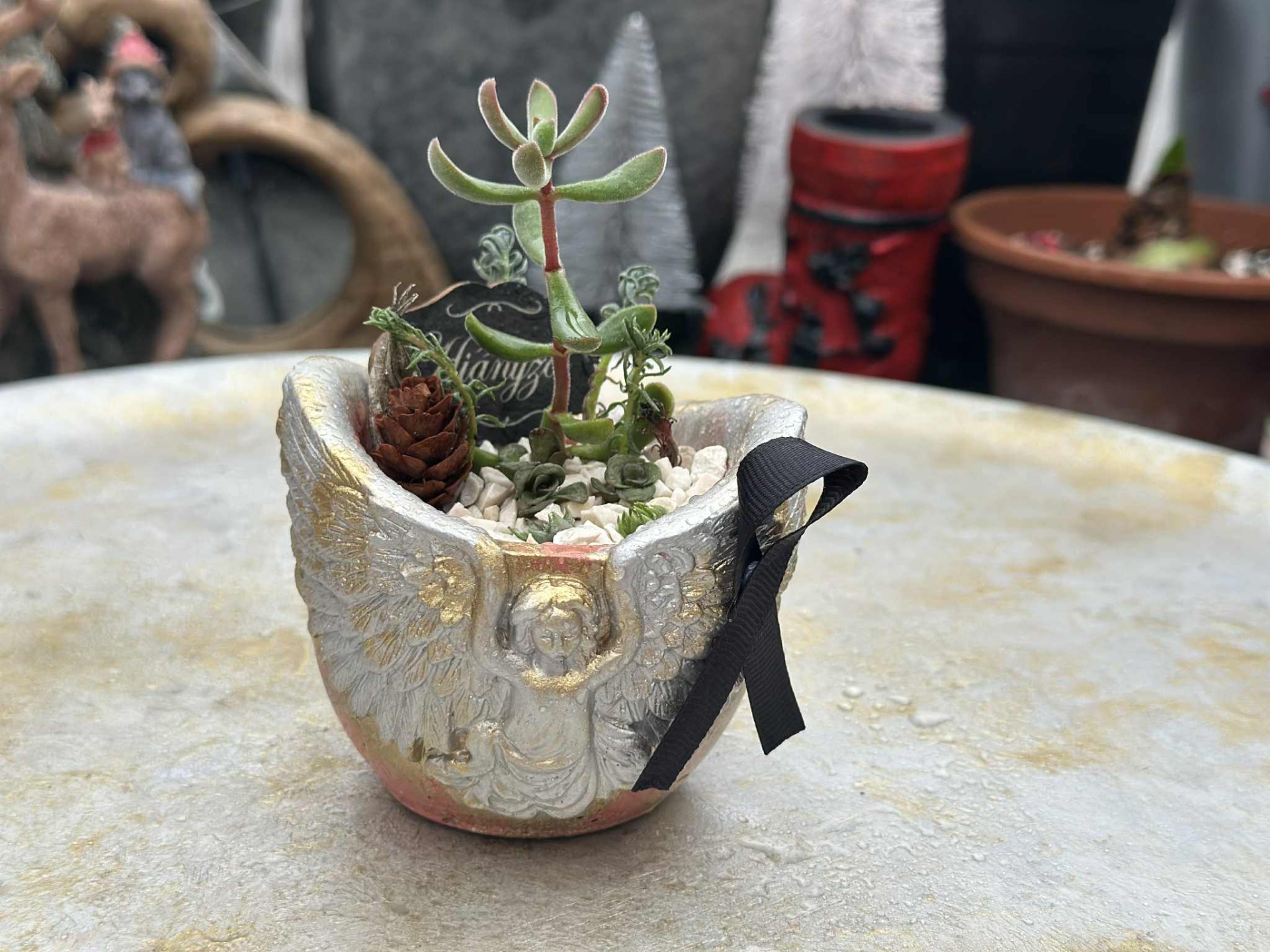 Fagyálló, angyalkás kaspó, nagy szárnyakkal, élő pozsgással beültetve, fehér dekorkővel megszórva, "Hiányzol" fa táblával, kis dekorációval és dekor szalaggal, rosgold, ezüst, arany színösszeállítással.
