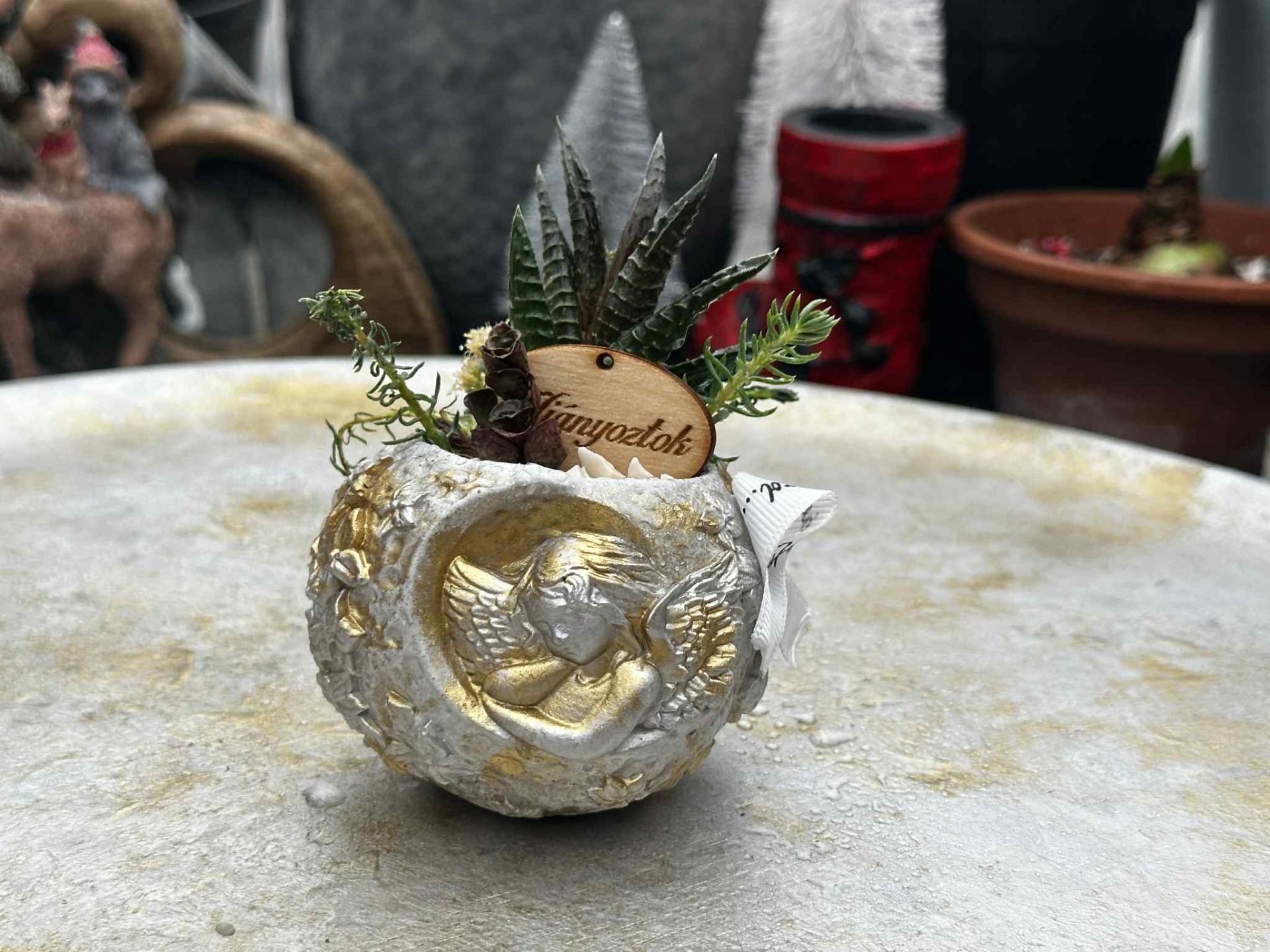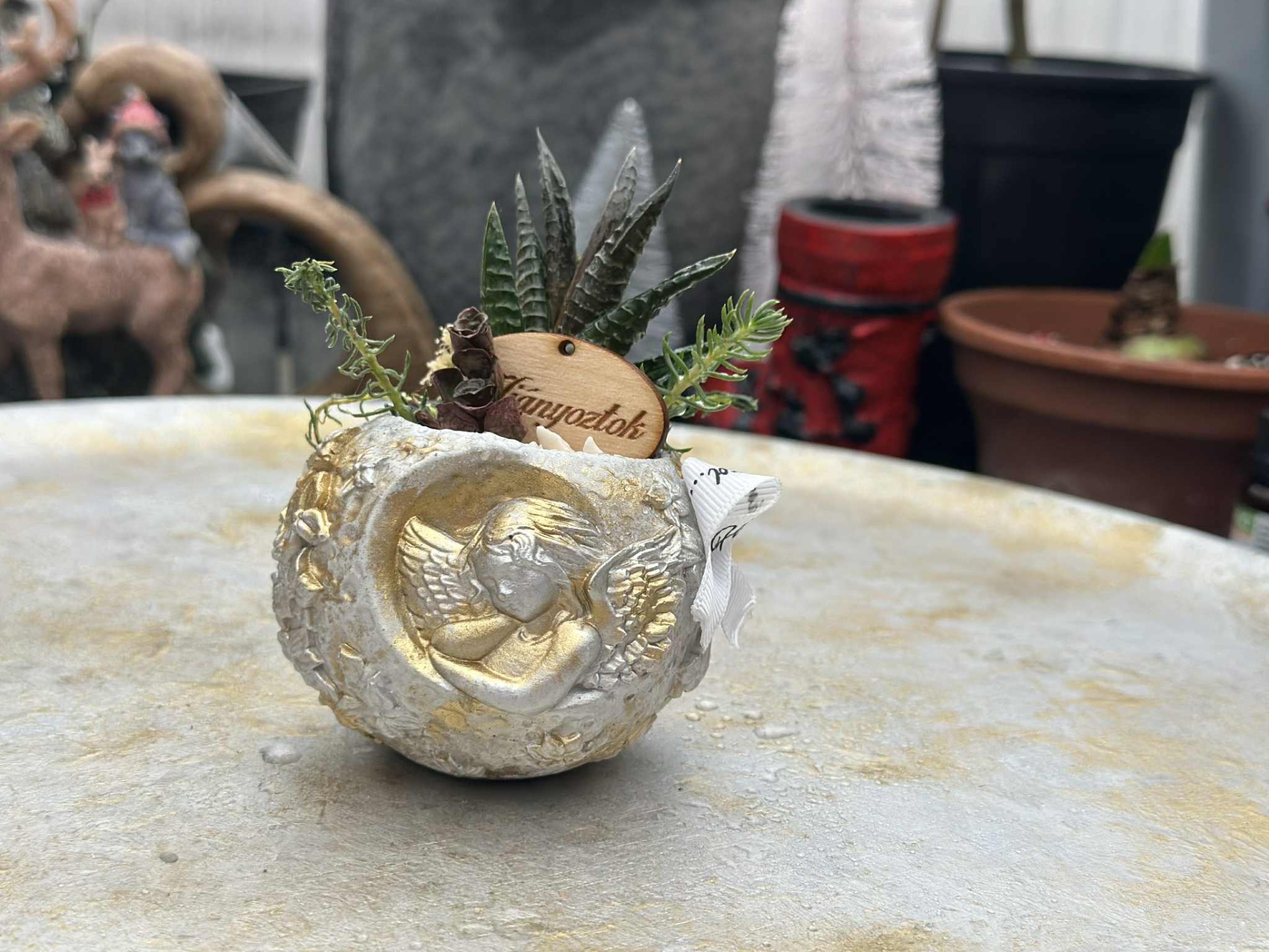 Fagyálló angyalos dombornyomott kaspó, ezüst, arany színösszeállítással. Élő pozsgással beültetve, dekorkővel, "Hiányoztok" táblával.