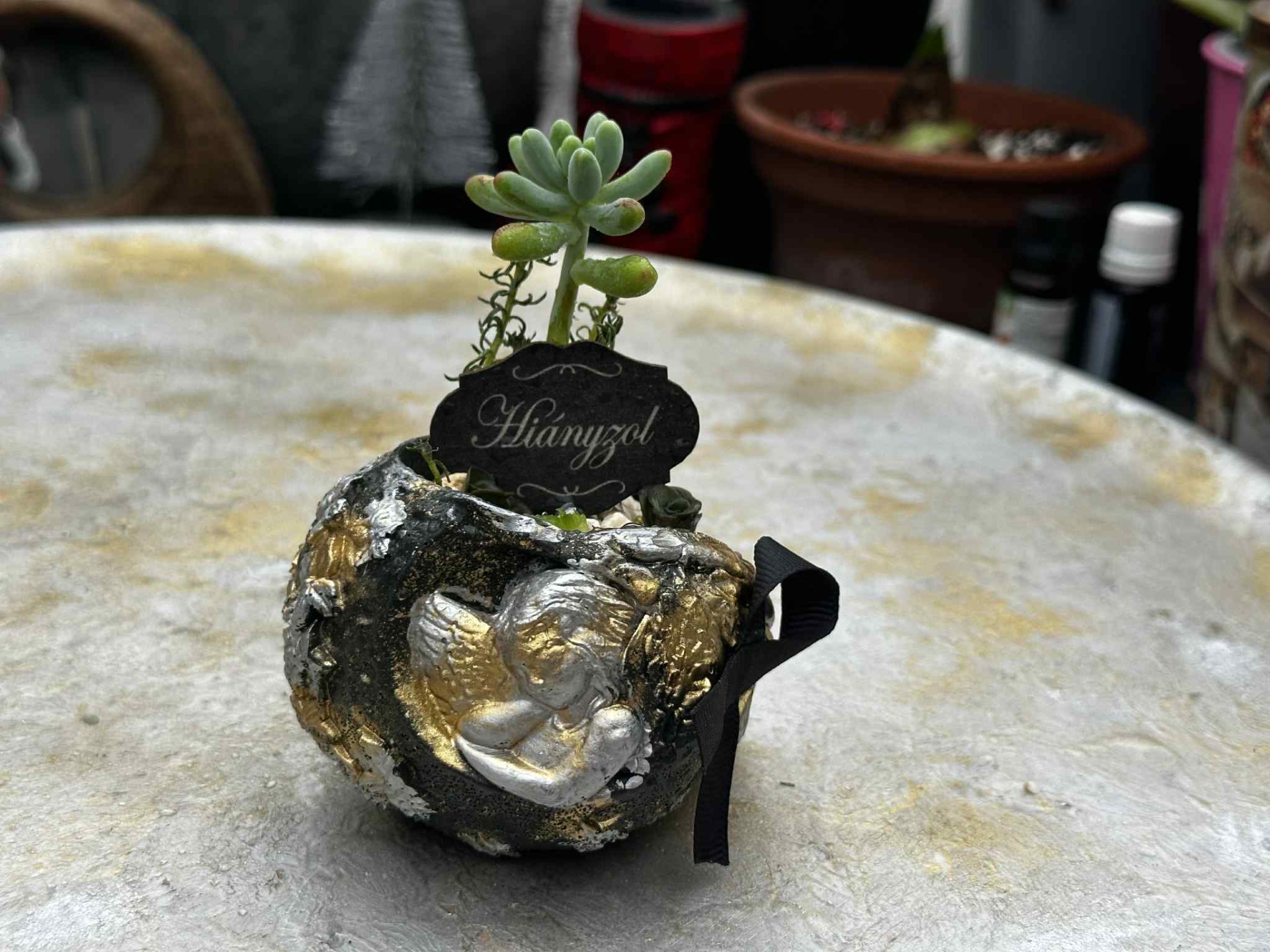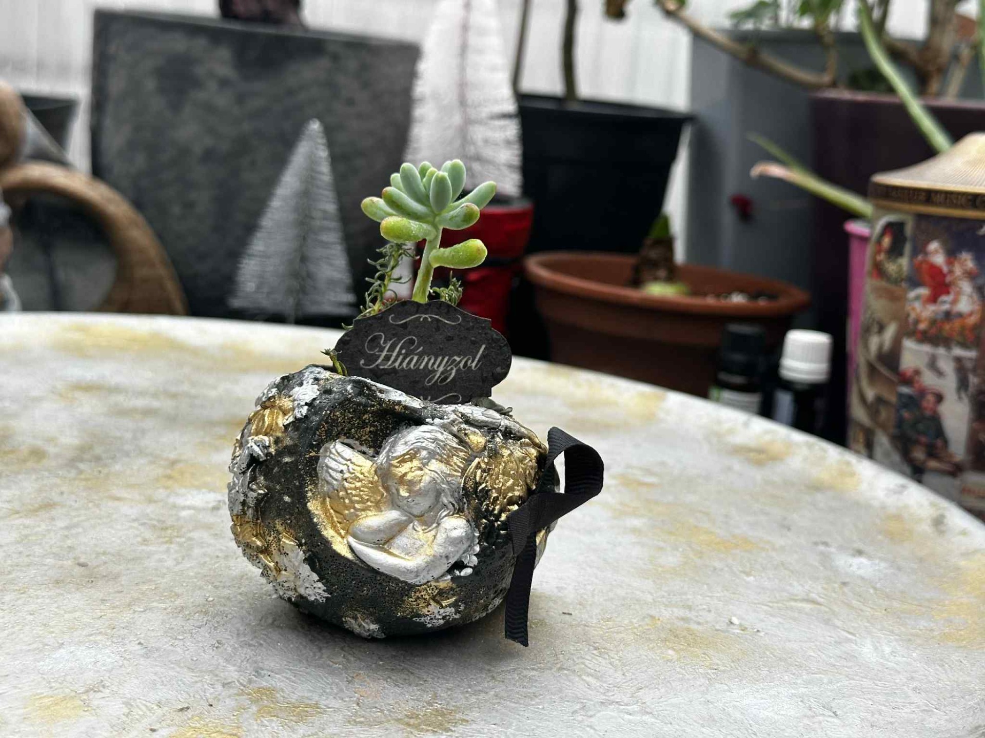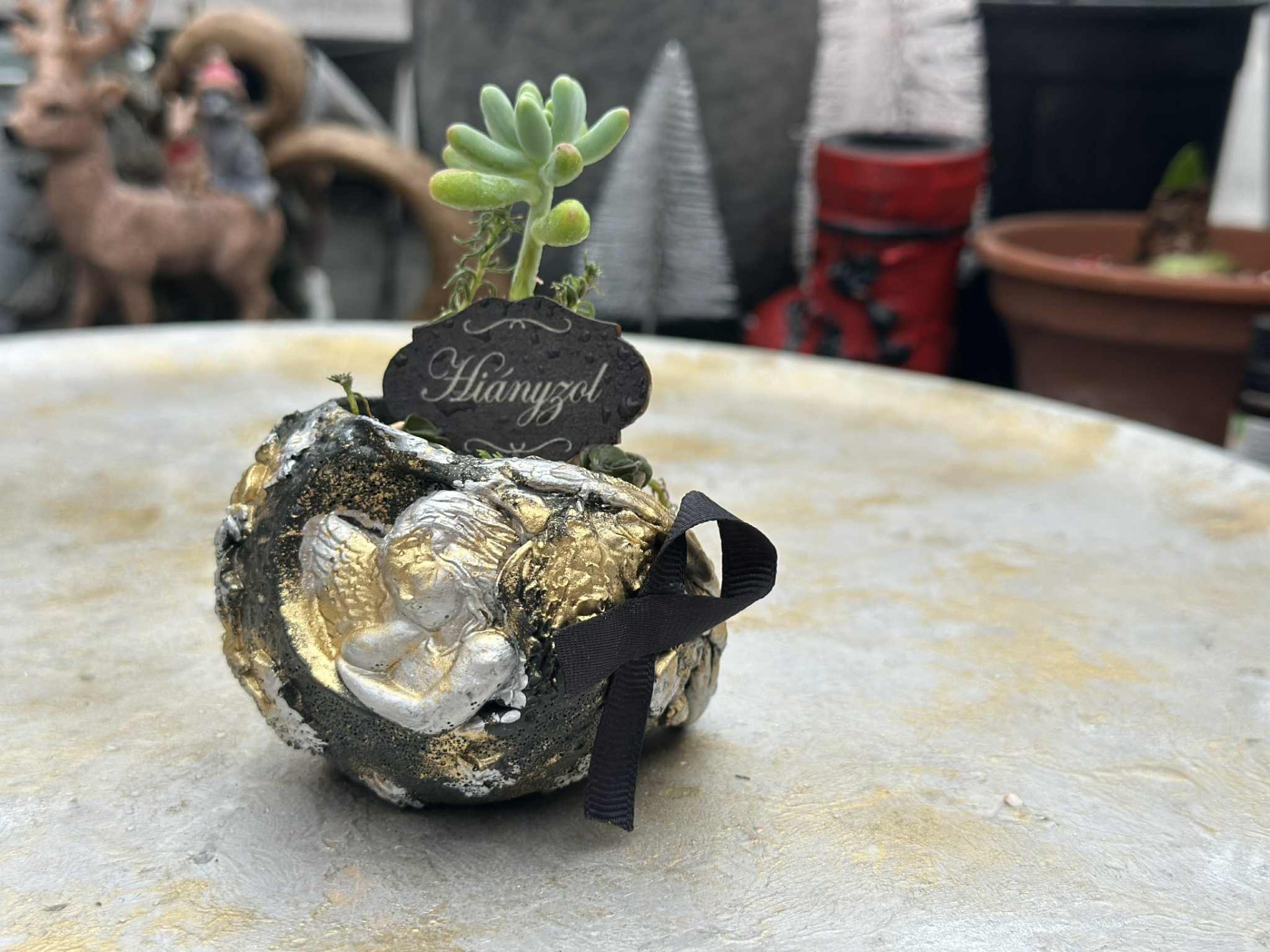 Fagyálló angyalos dombornyomott kaspó, fekete, arany színösszeállítással. Élő pozsgással beültetve, dekorkővel, "Hiányzol" fatáblával.