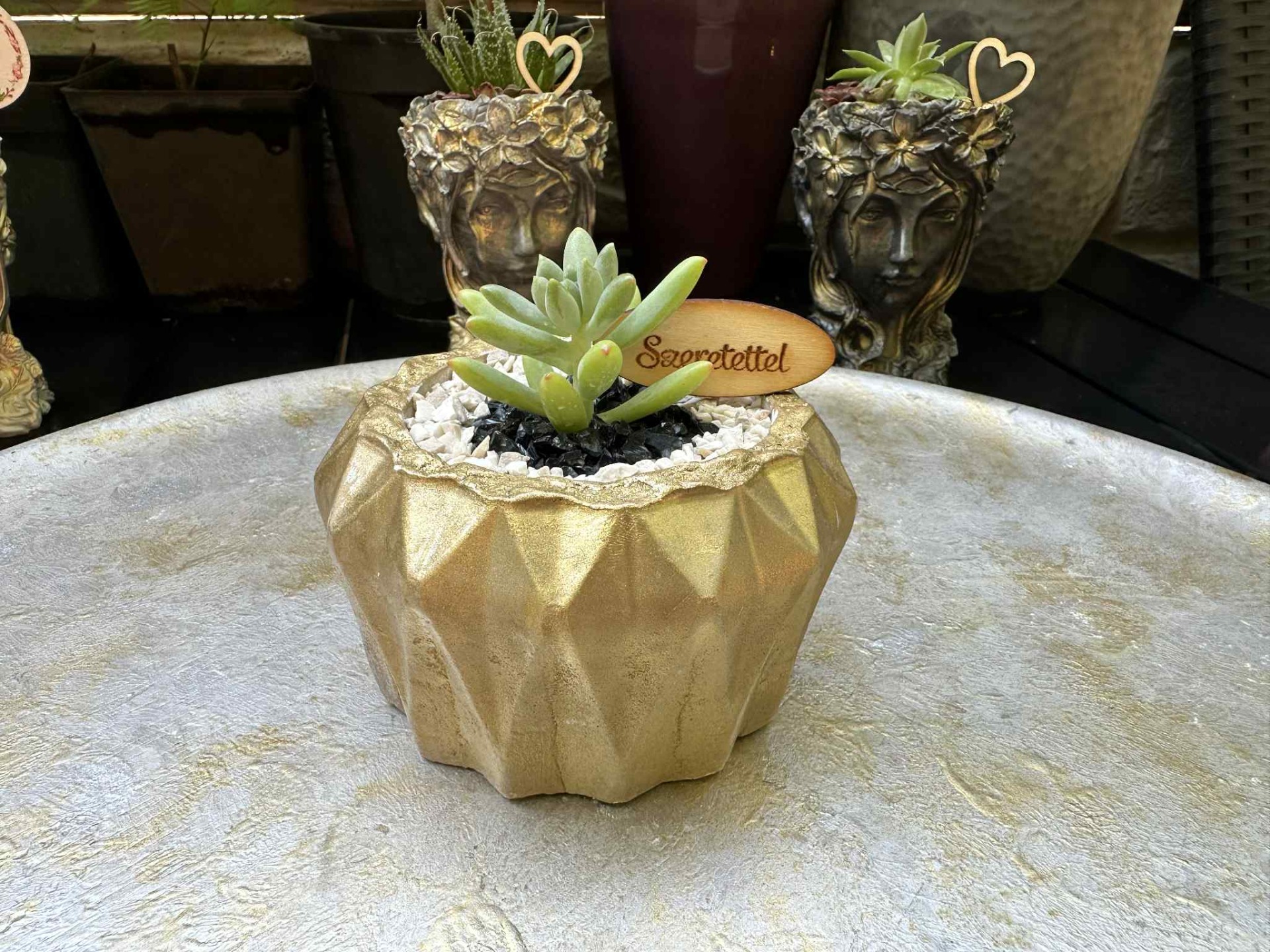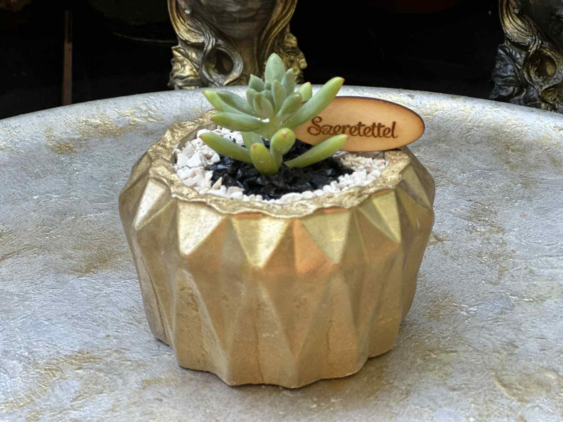 Dekor kaspó, élő pozsgással, arany - RENDELHETŐ