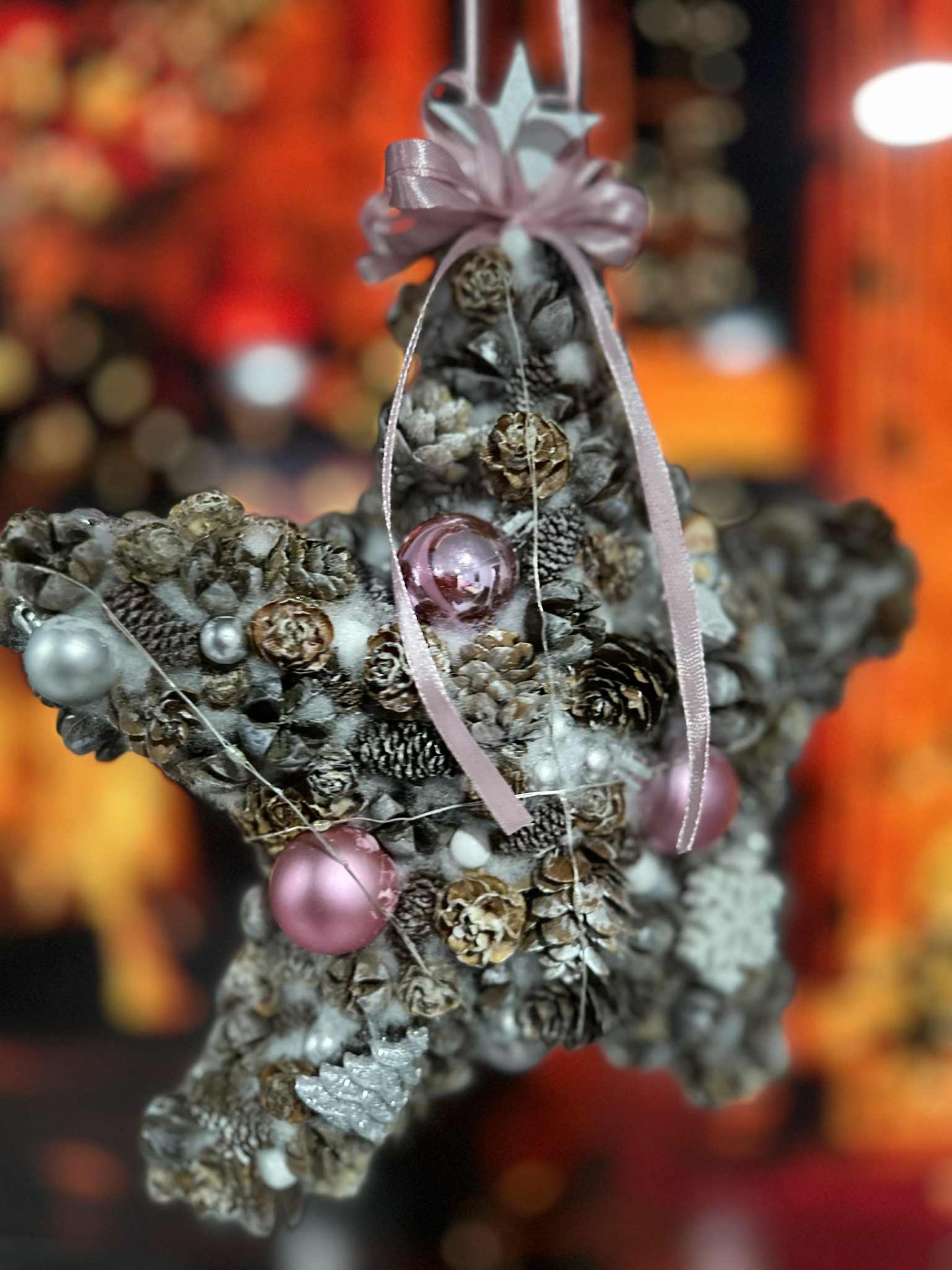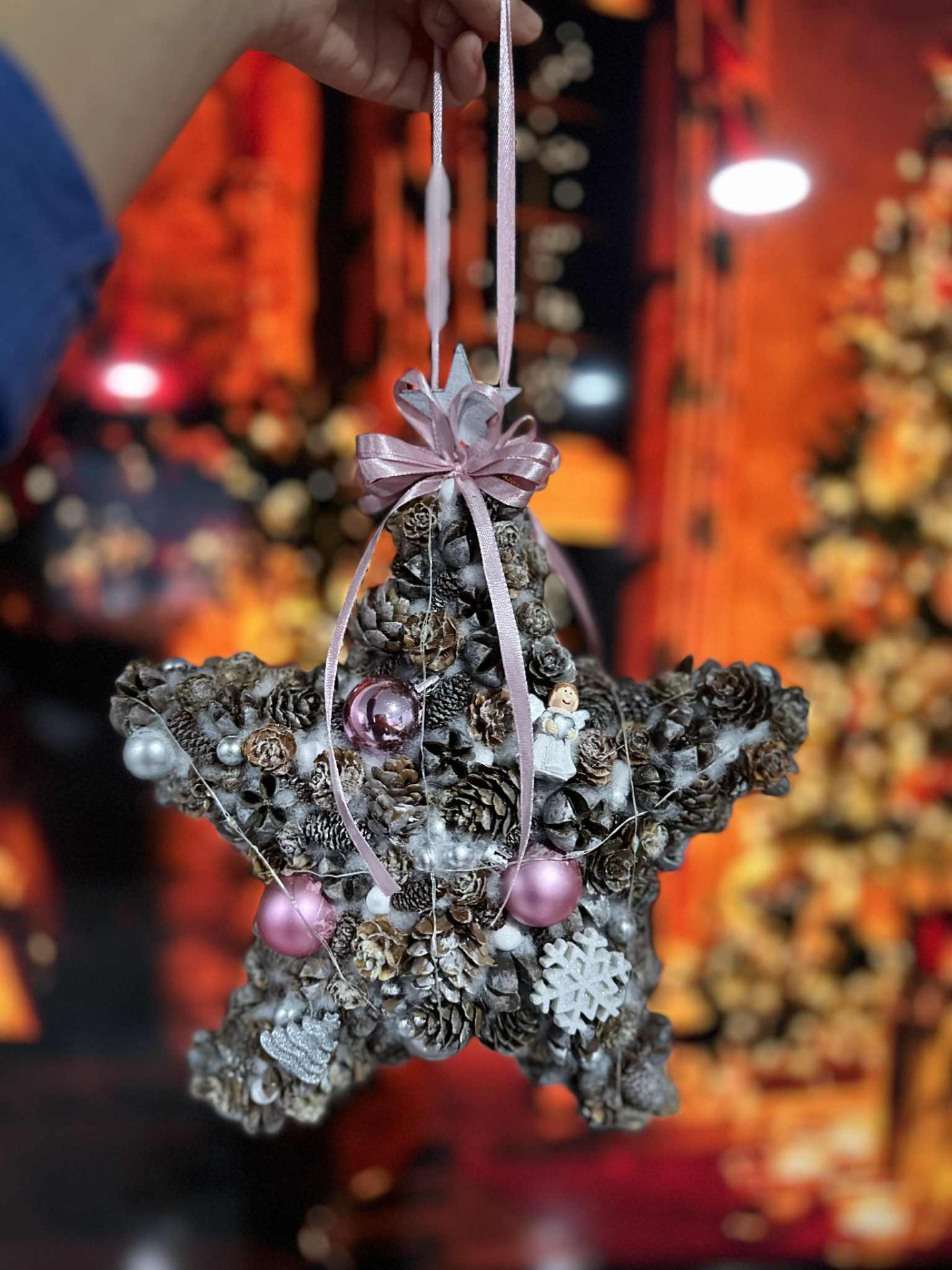 Függeszthető karácsonyi csillag alakú dekoráció, rózsaszín, fehér, ezüst, barna színösszeállítással, hidegfehér színű világítással.