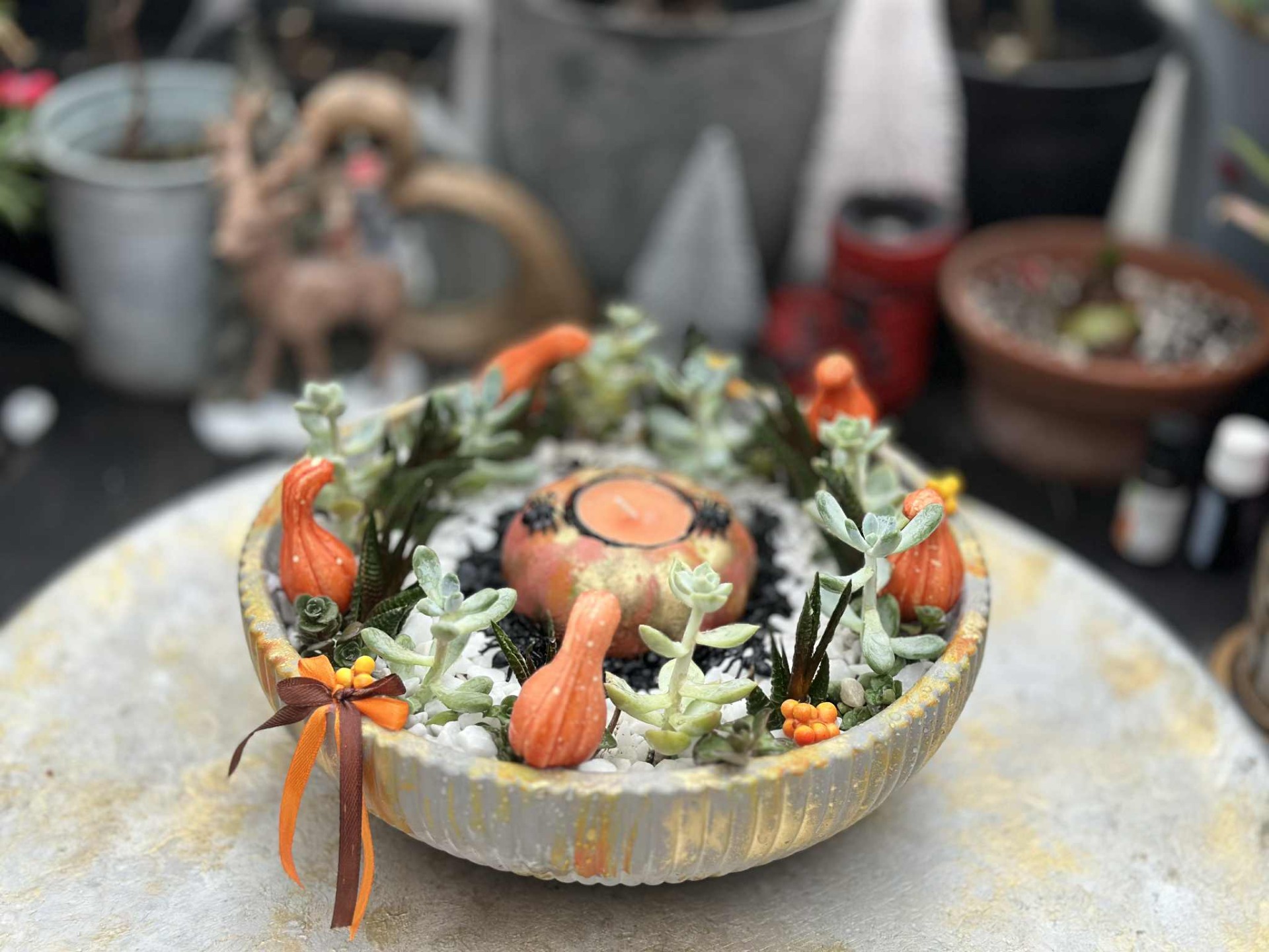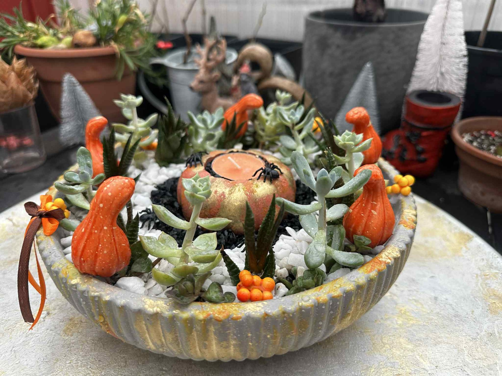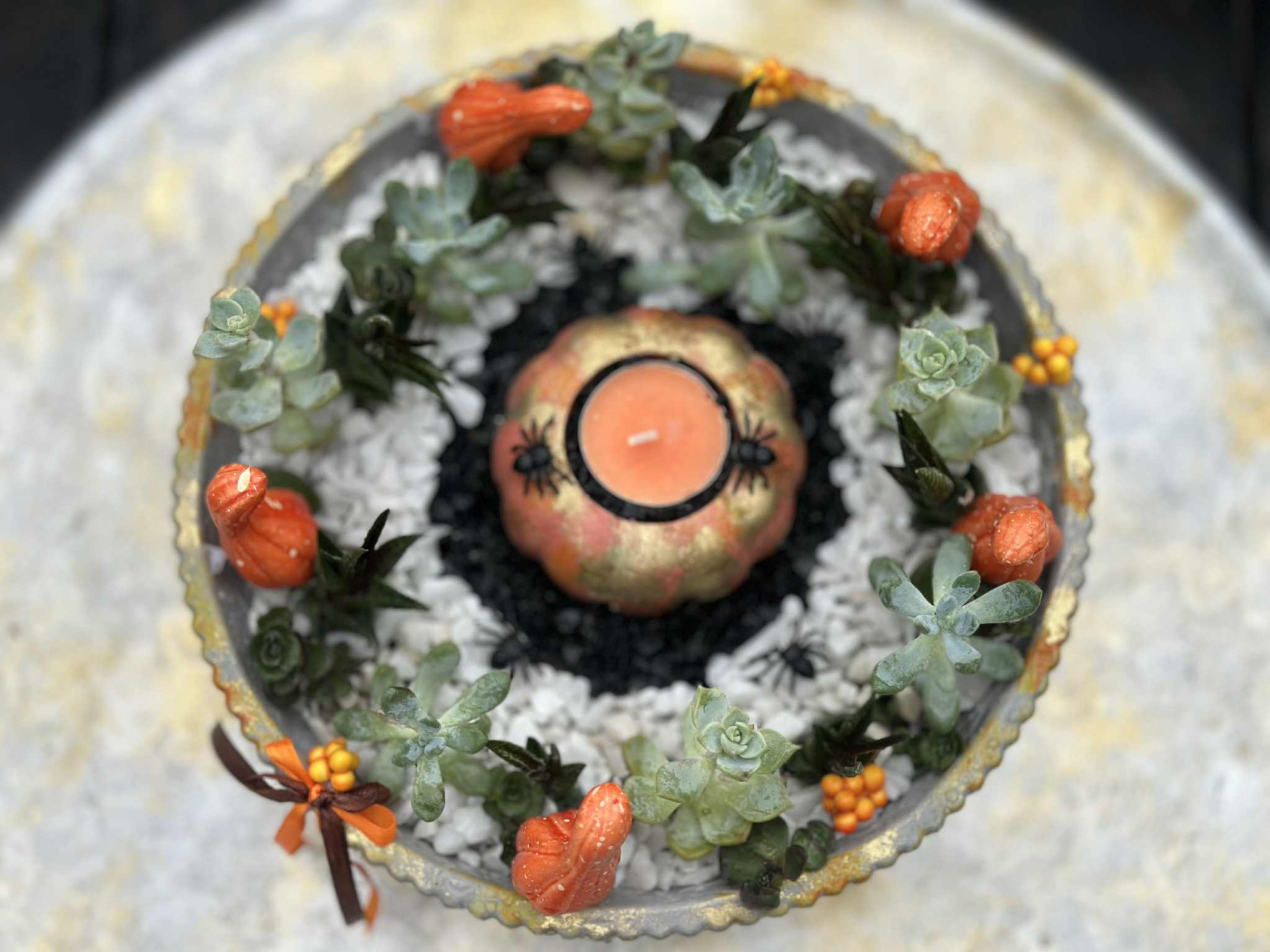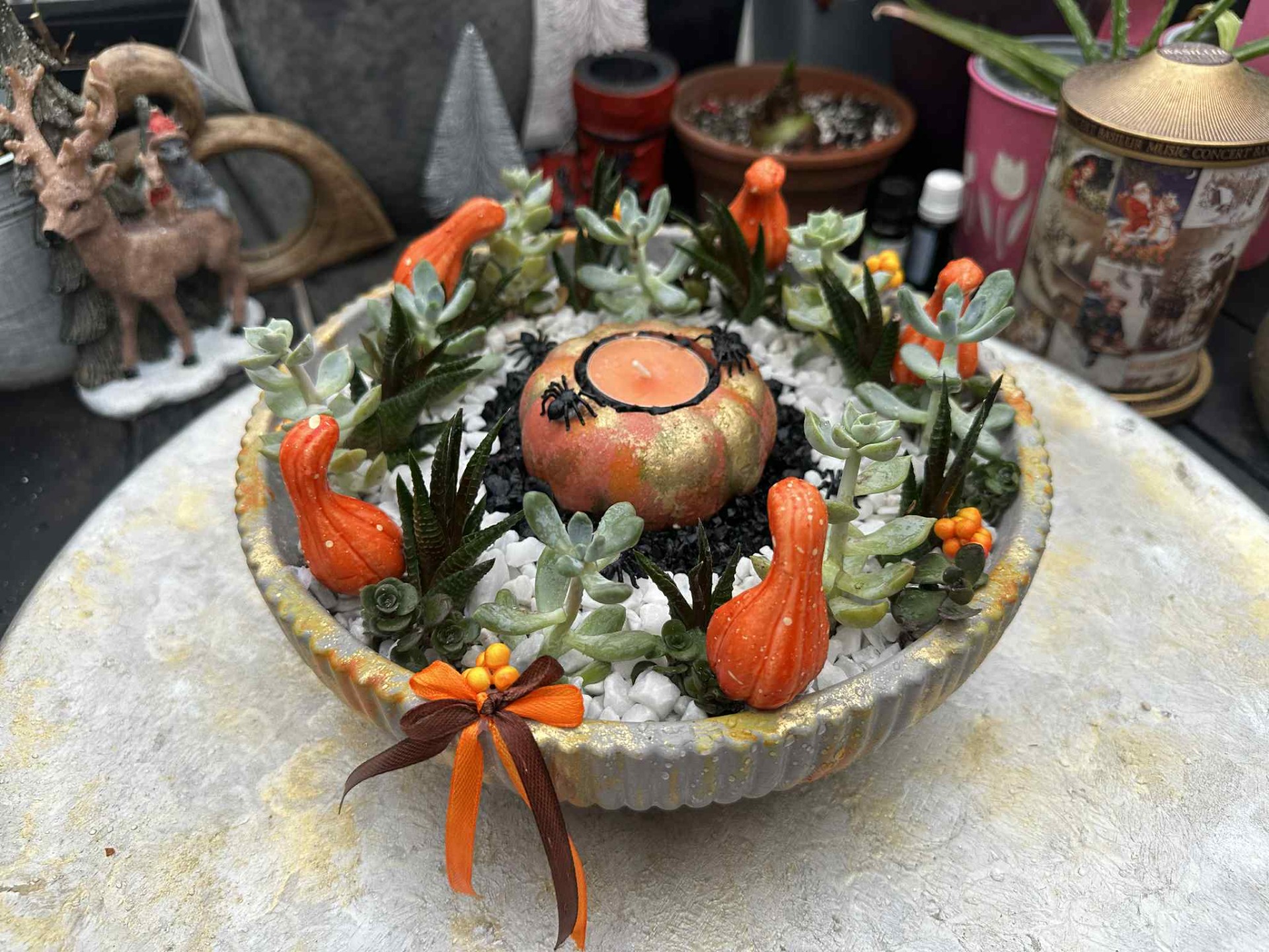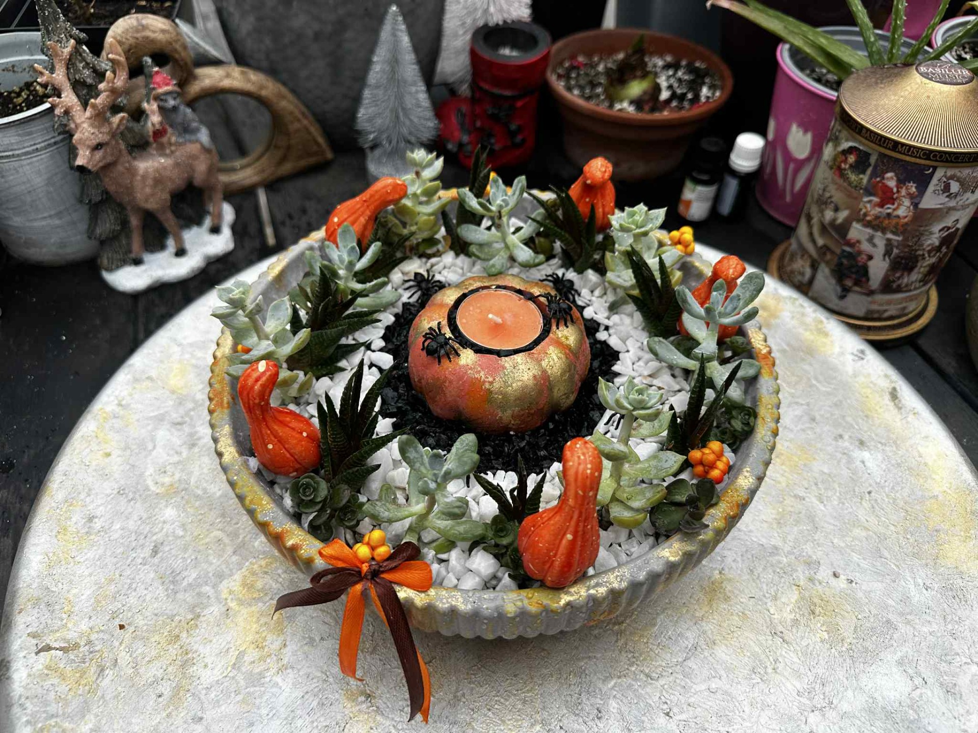 Fagyálló dekortál, fagyálló halloween tökkel, gyertyával, élő pozsgásokkal beültetve, díszkavicsokkal megszórva, egyéb dekorációval, zöld, narancssárga, arany, szürke, fehér, fekete színösszeállítással.