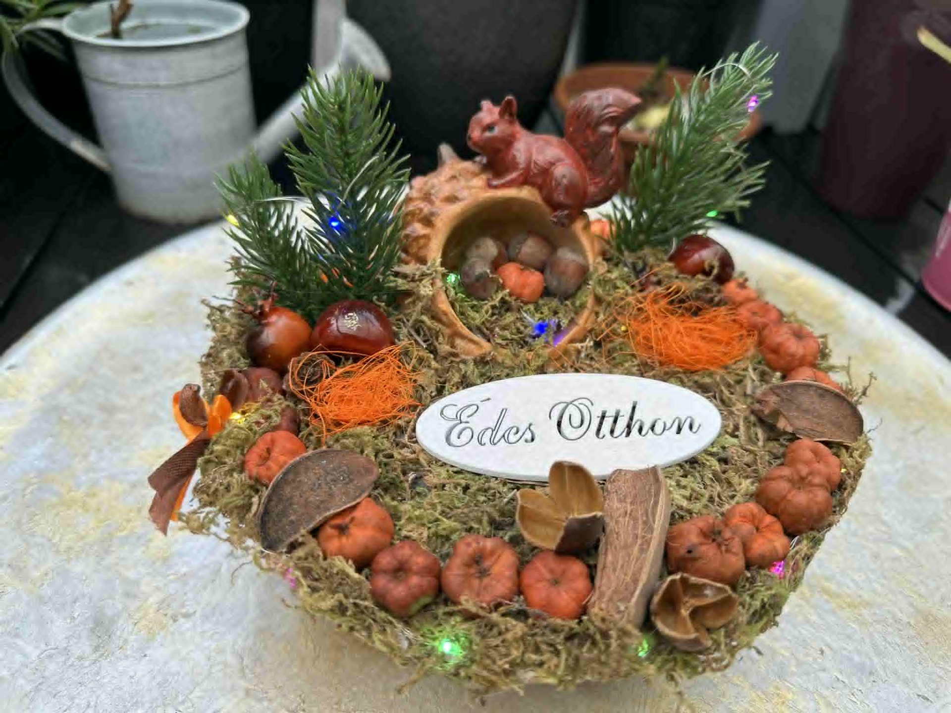 Őszi dekoráció, fagyálló tállal és mókussal, színes világítással.