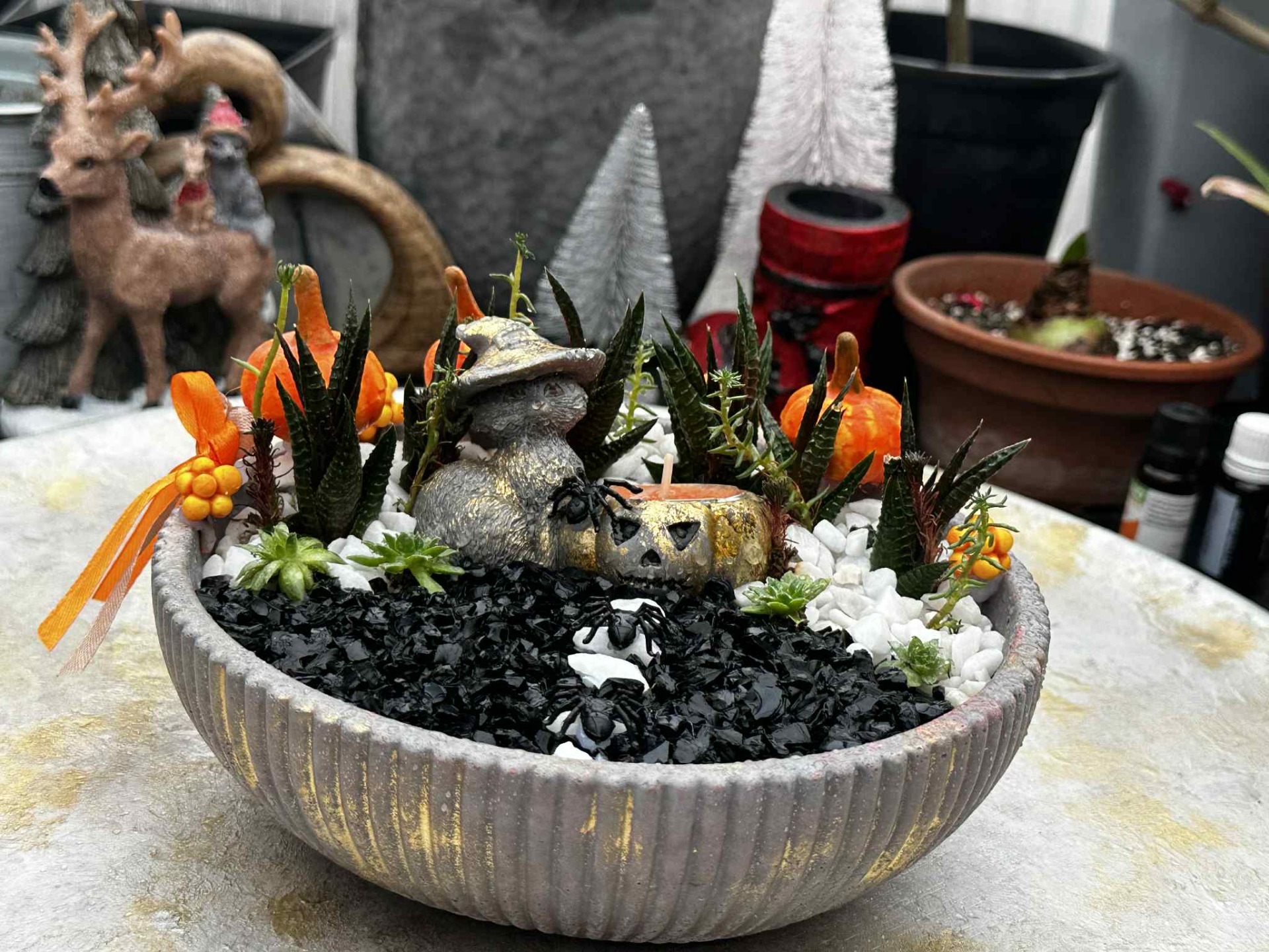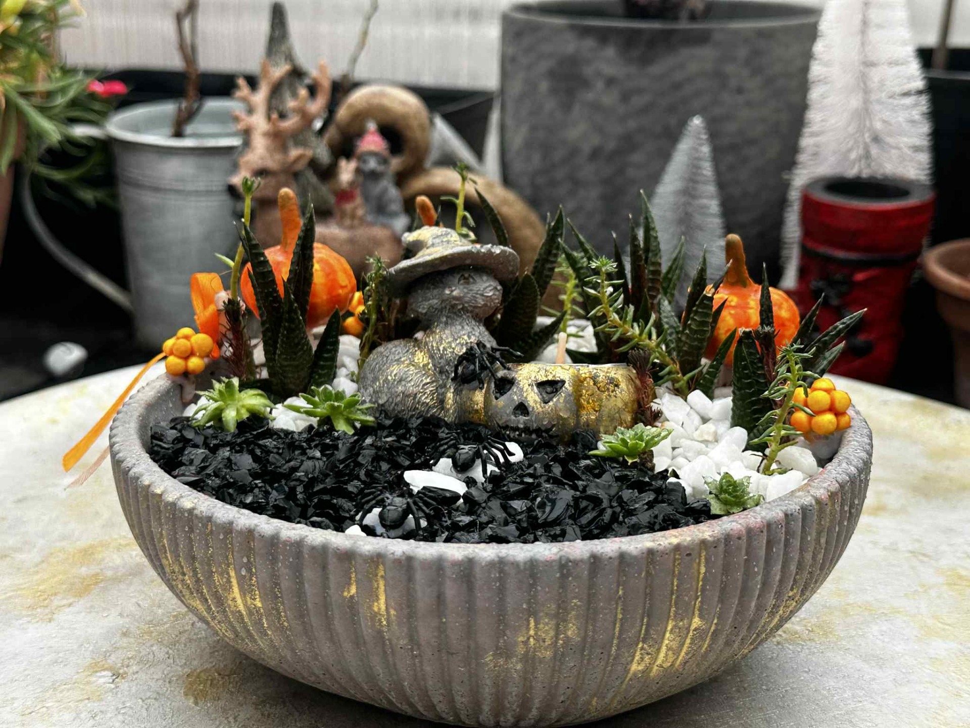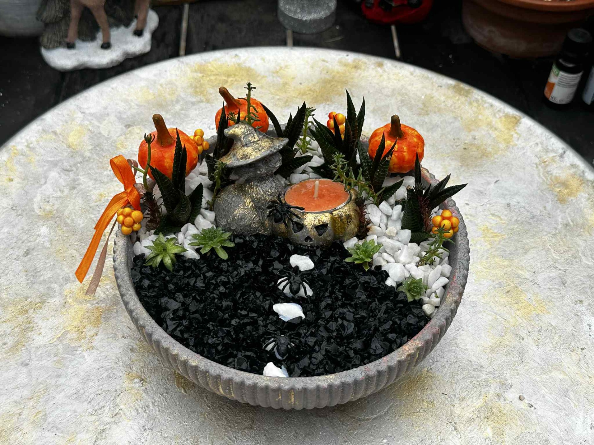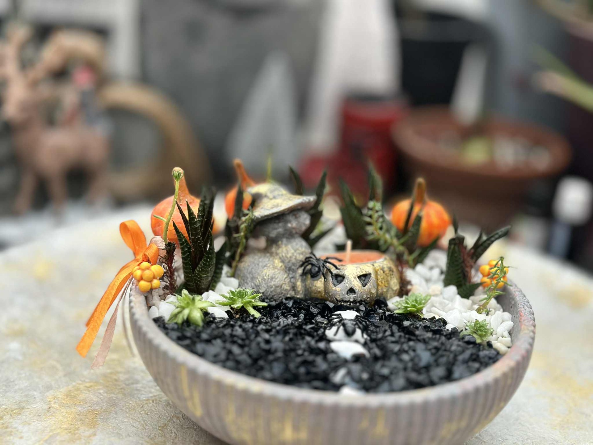 Kövirózsával és szemölcsliliommal beültetett, díszkaviccsal megszórt, fagyálló, halloween-os dekortál.