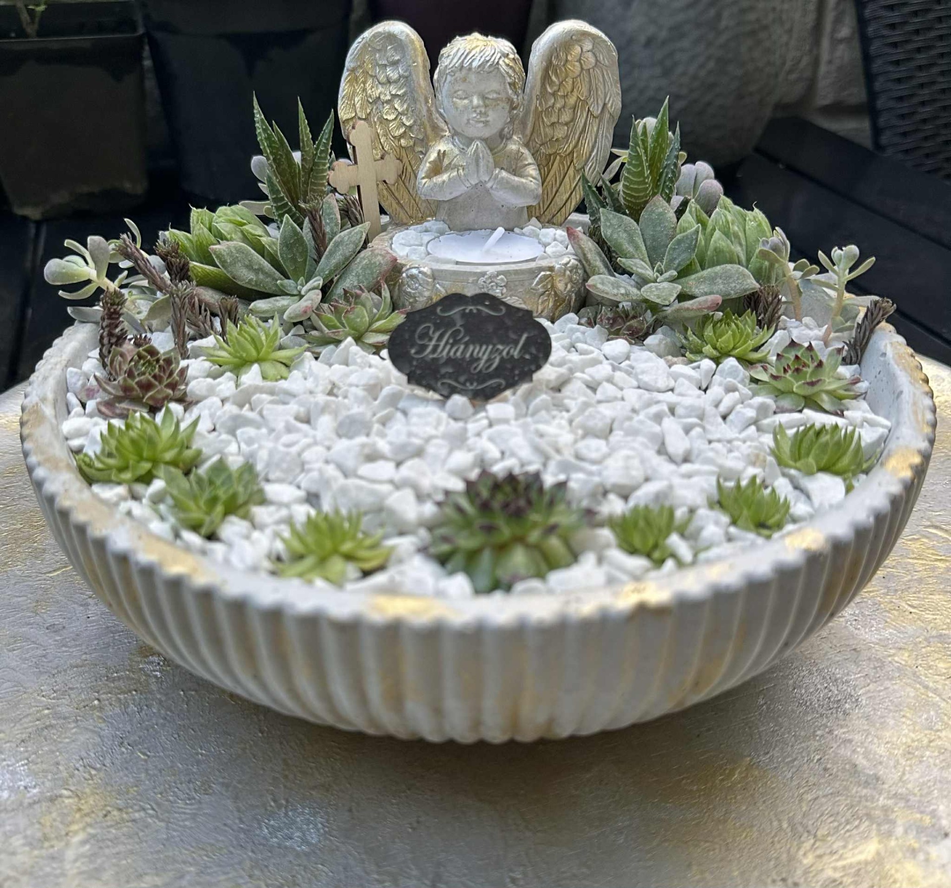 Kegyeleti tál, imádkozó angyalkával, élő pozsgásokkal - RENDELHETŐ