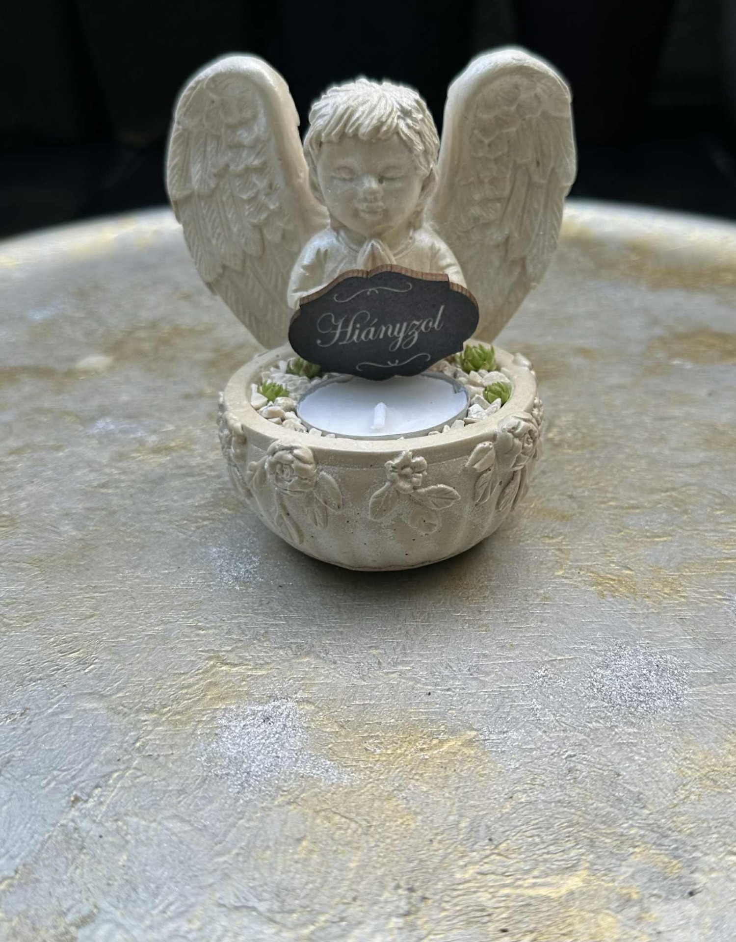 Fagyálló imádkozó angyalka, fehér, csillámporos színösszeállítással, élő kövirózsákkal, fehér dekorkővel, "Hiányzol" fatáblával.