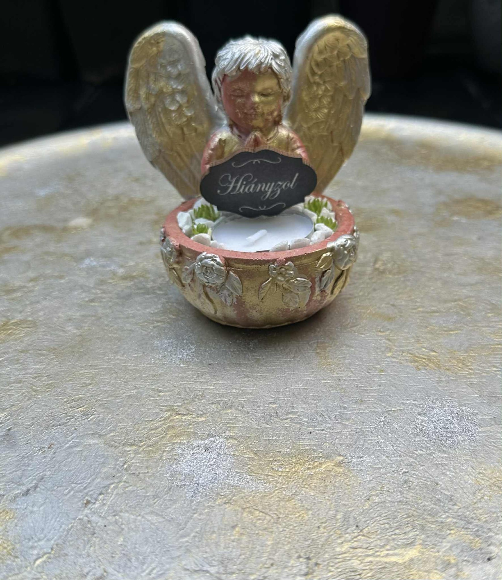 Fagyálló imádkozó angyalka, rose gold, arany, ezüst színösszeállítással, élő kövirózsákkal, fehér dekorkővel, "Hiányzol" fatáblával.
