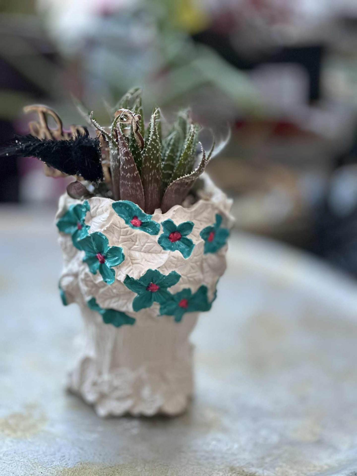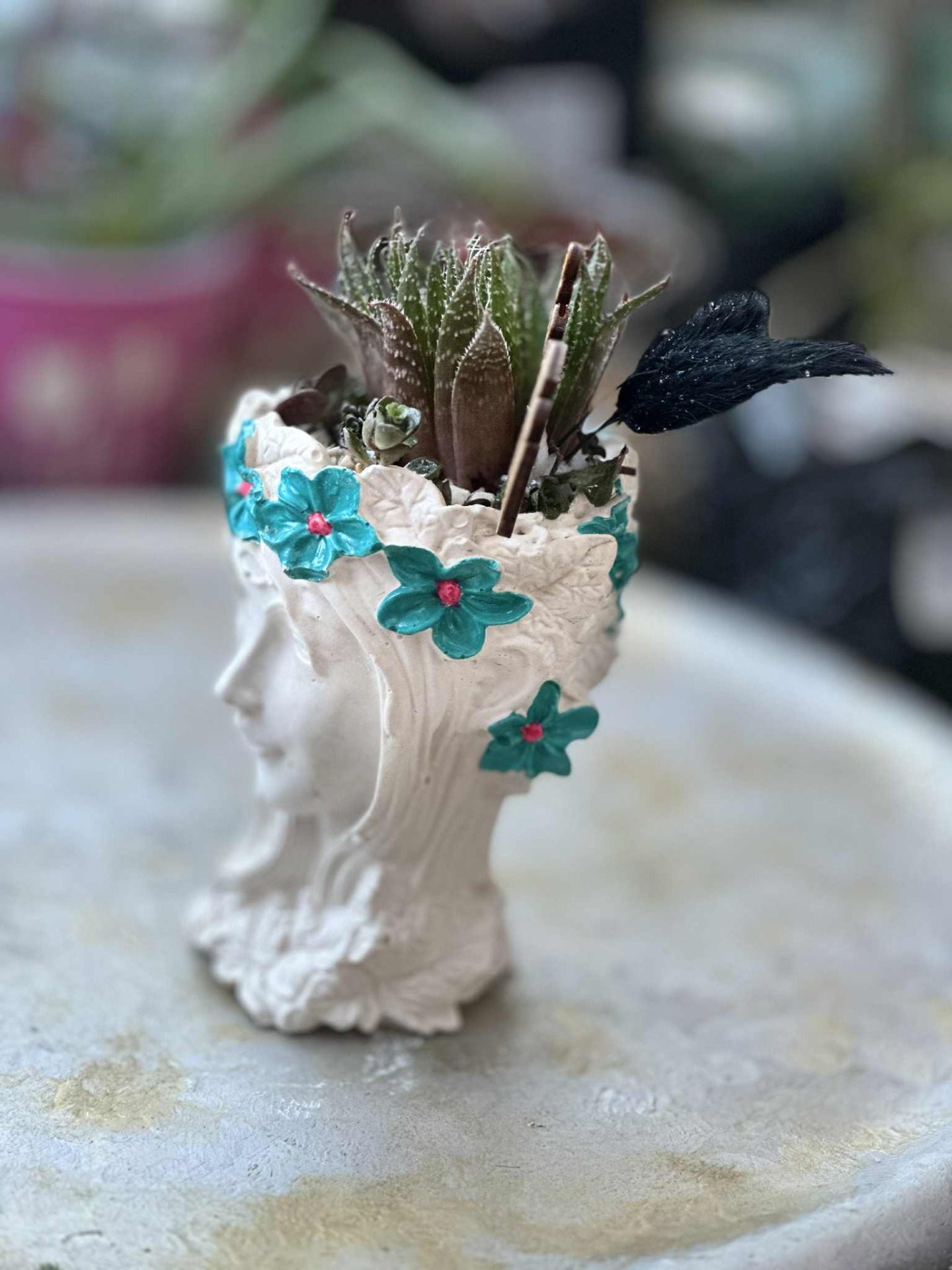 Istennő kaspó, élő pozsgással, fehér, zöldeskék, rózsaszín, 7