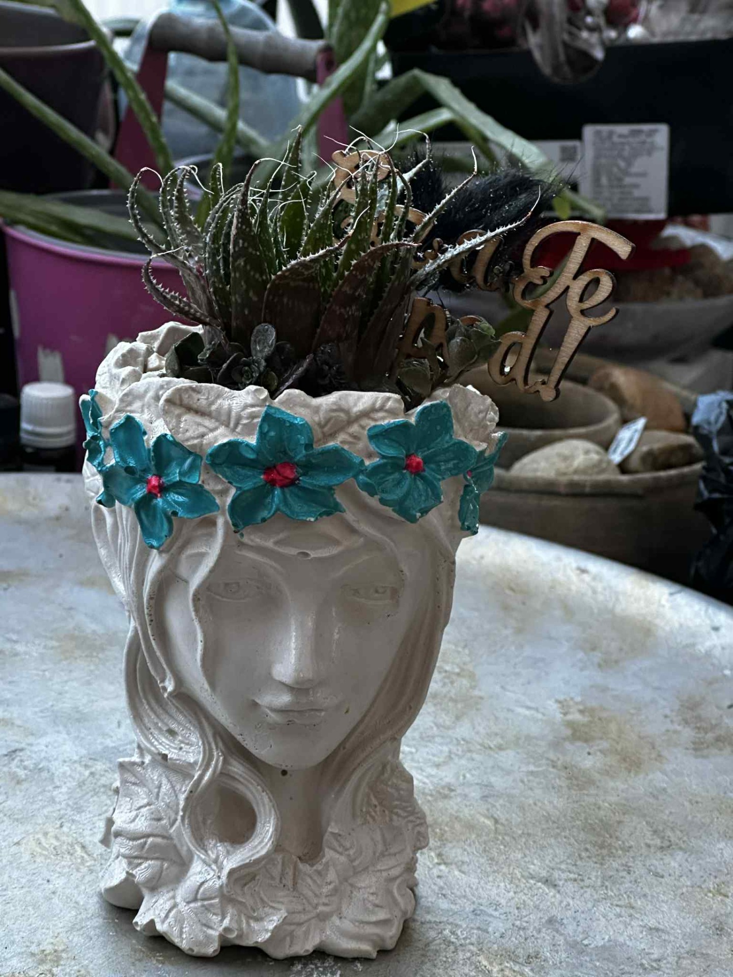 Gipsz istennő kaspó, élő pozsgással beültetve, dekorációval, "Ez a Te napod!" fatáblával, dekorkővel megszórva, fehér, zöldeskék, rózsaszín színösszeállítással.