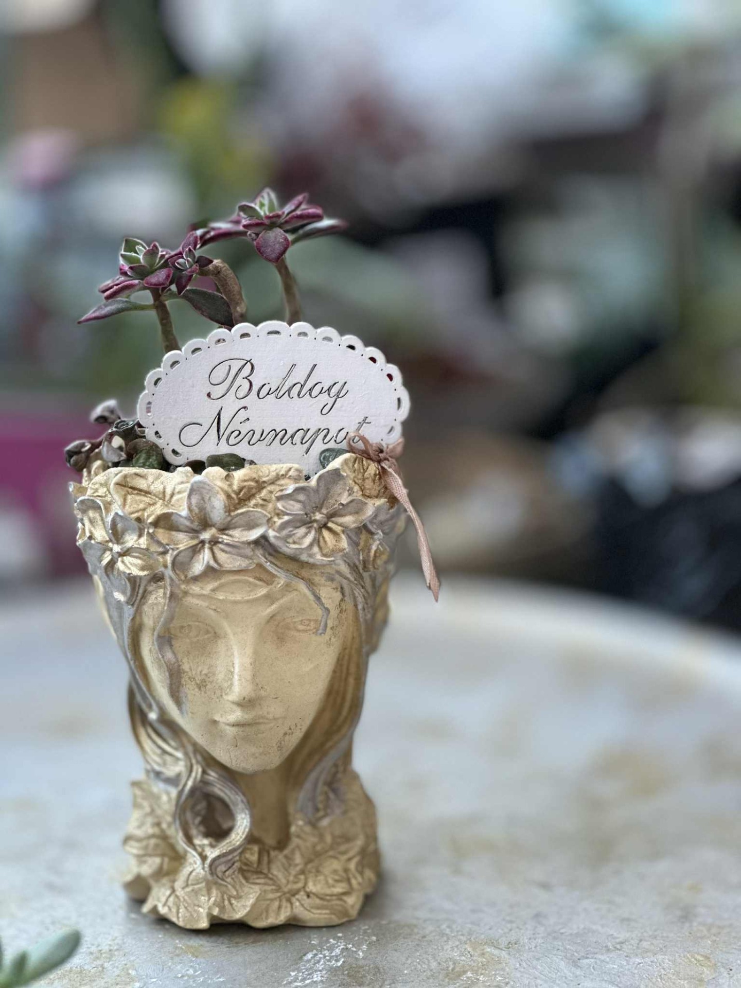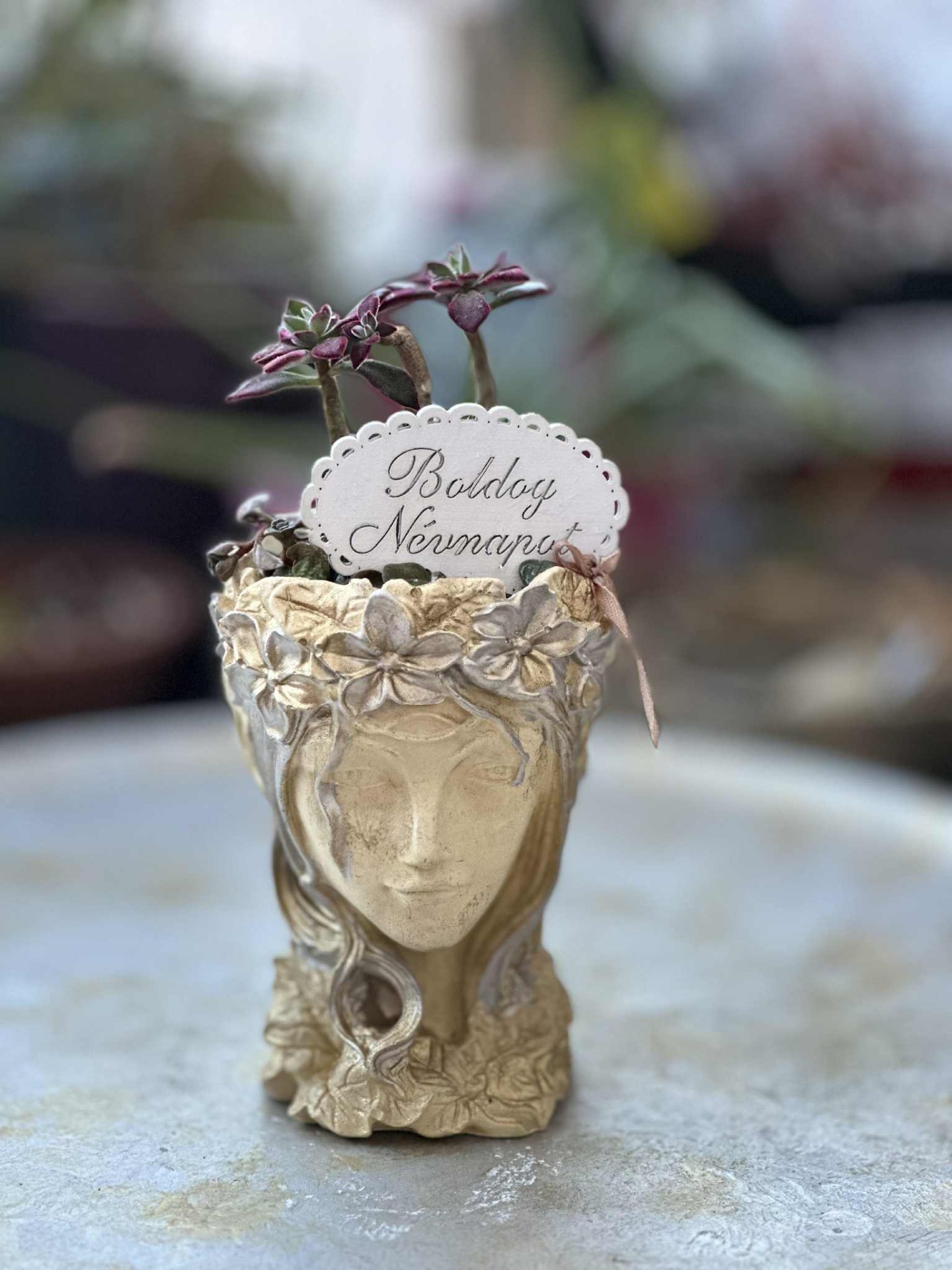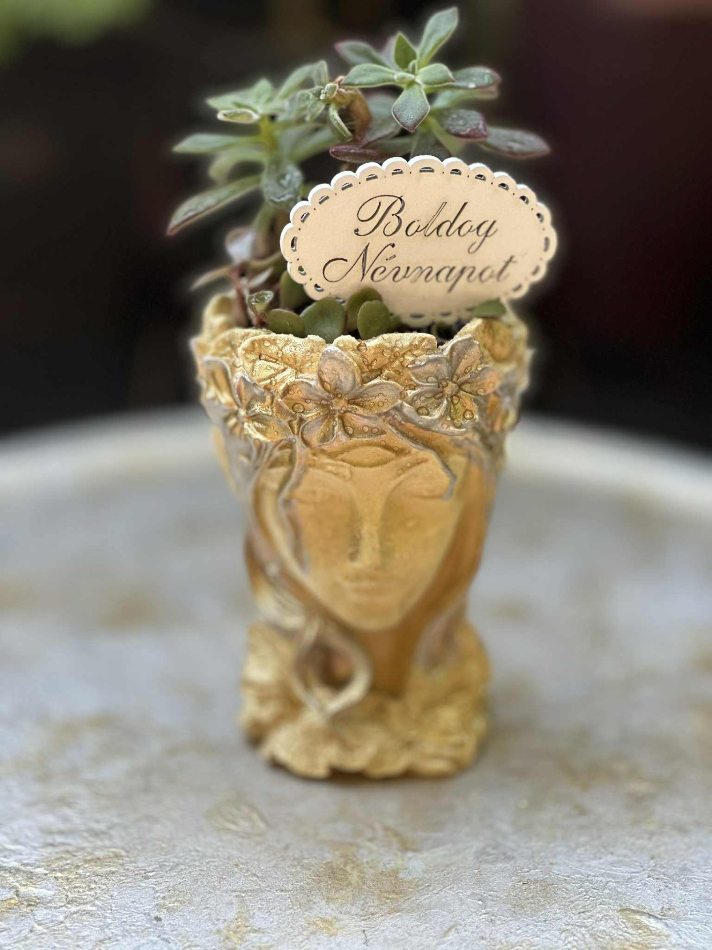 Istennő kaspó, élő pozsgással, sárga, arany, ezüst, 3