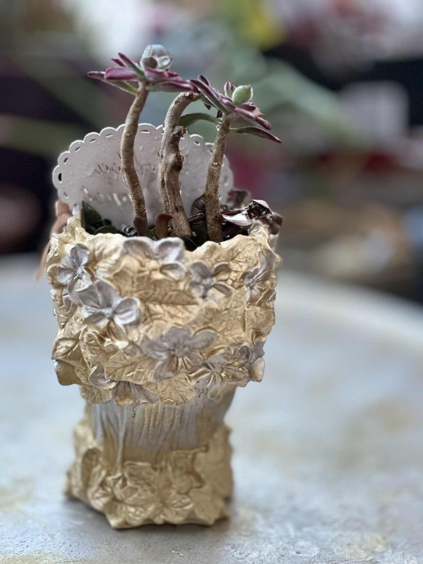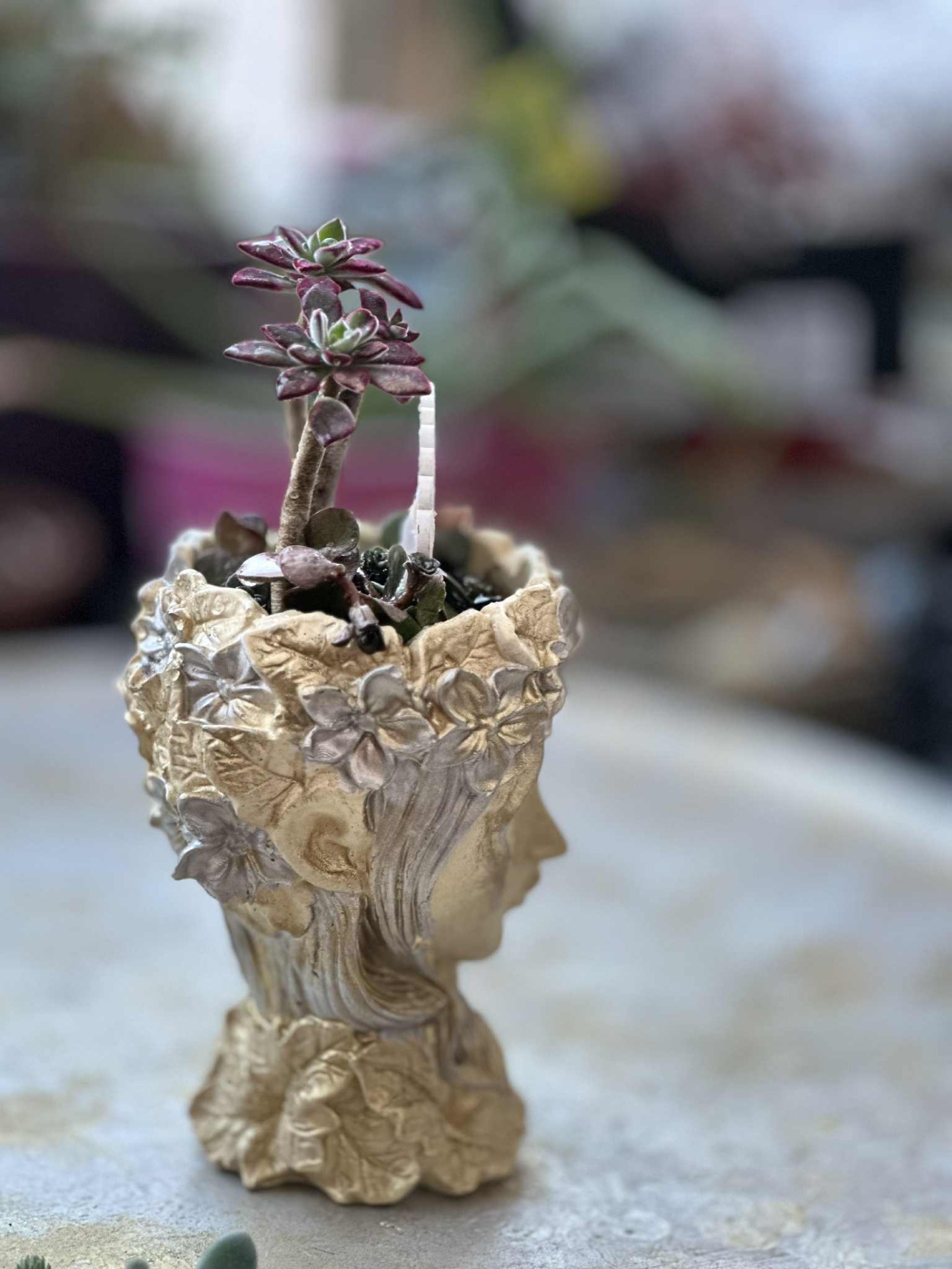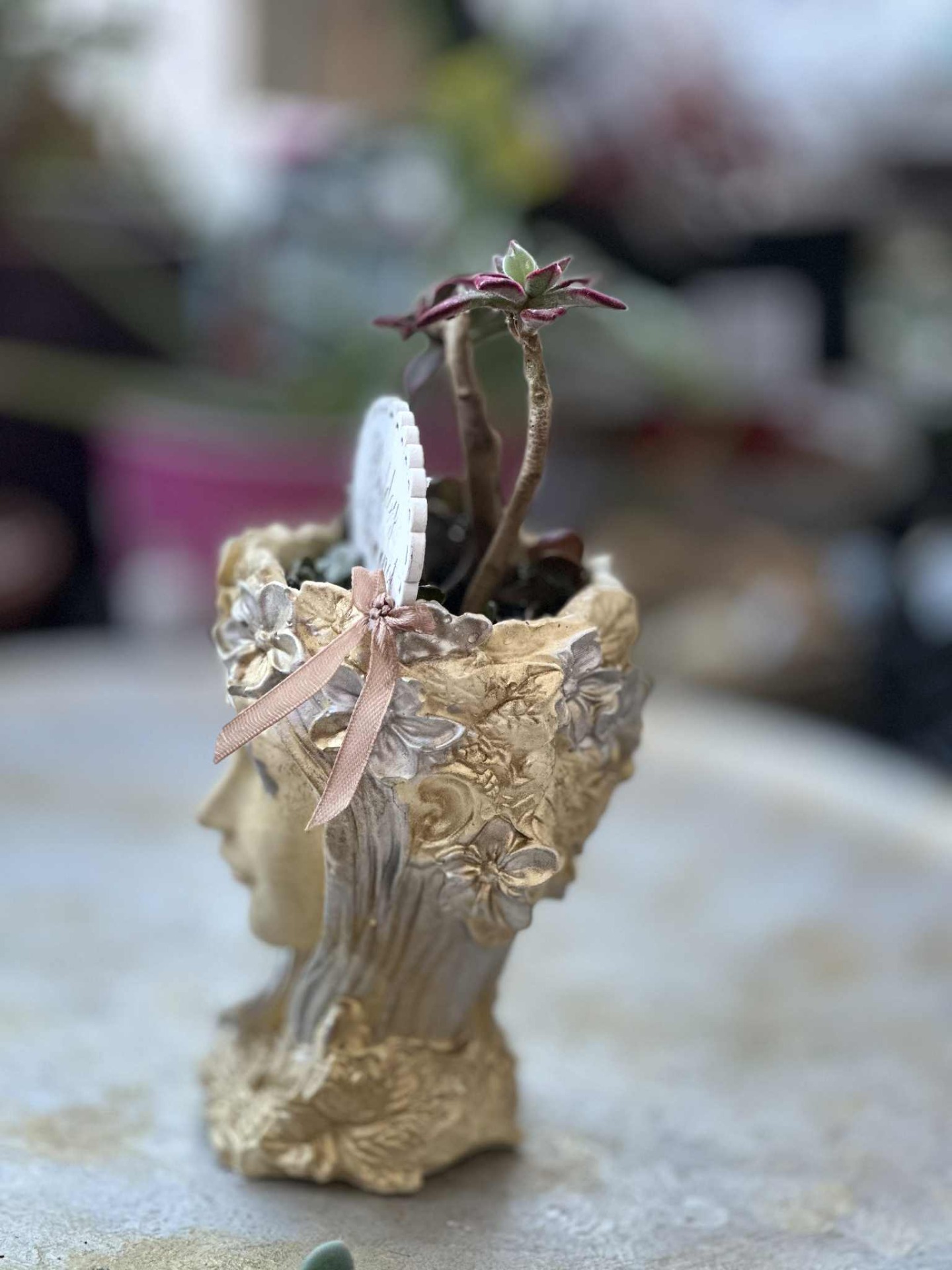 Istennő kaspó, élő pozsgással, sárga, arany, ezüst, 3