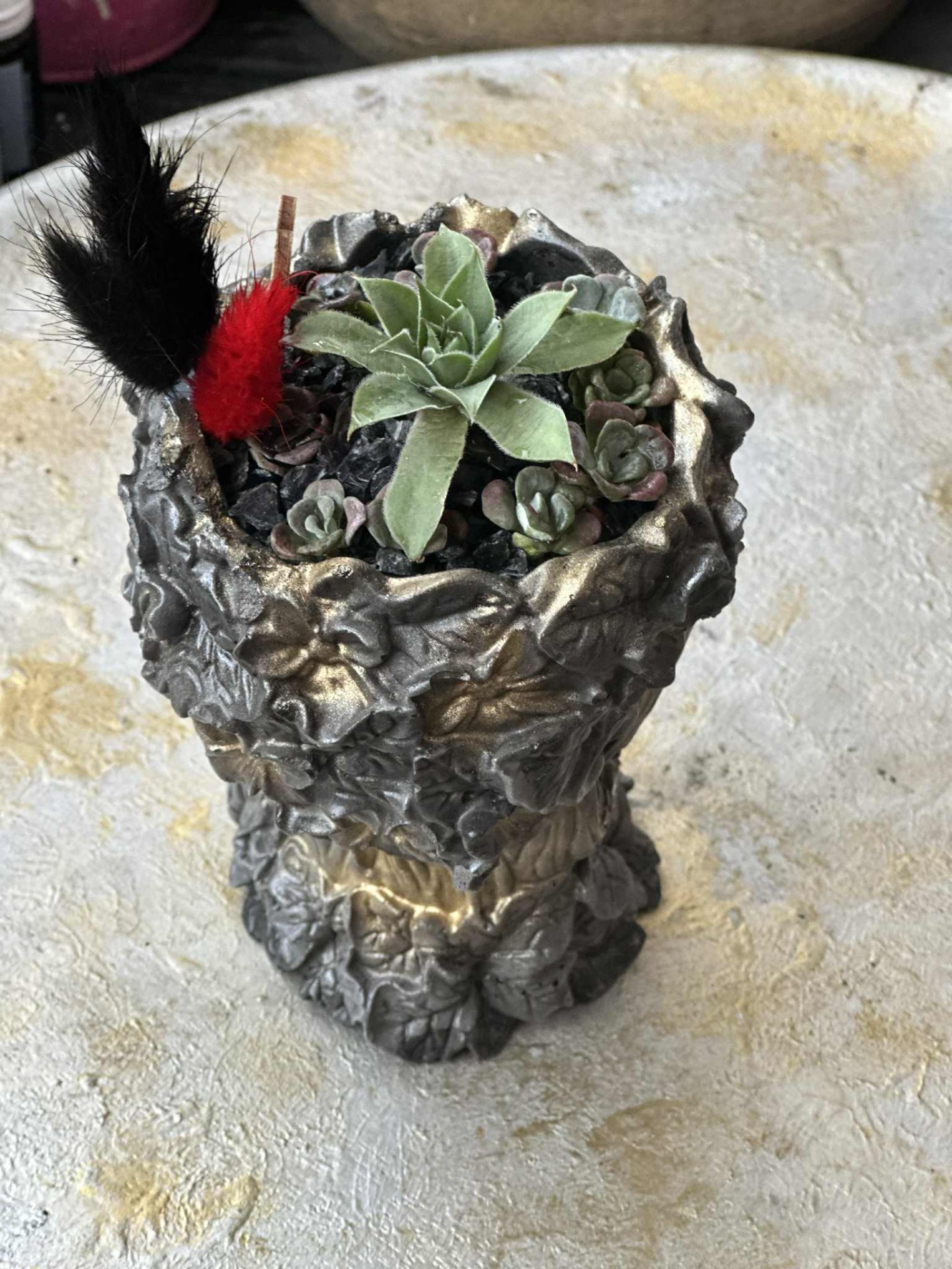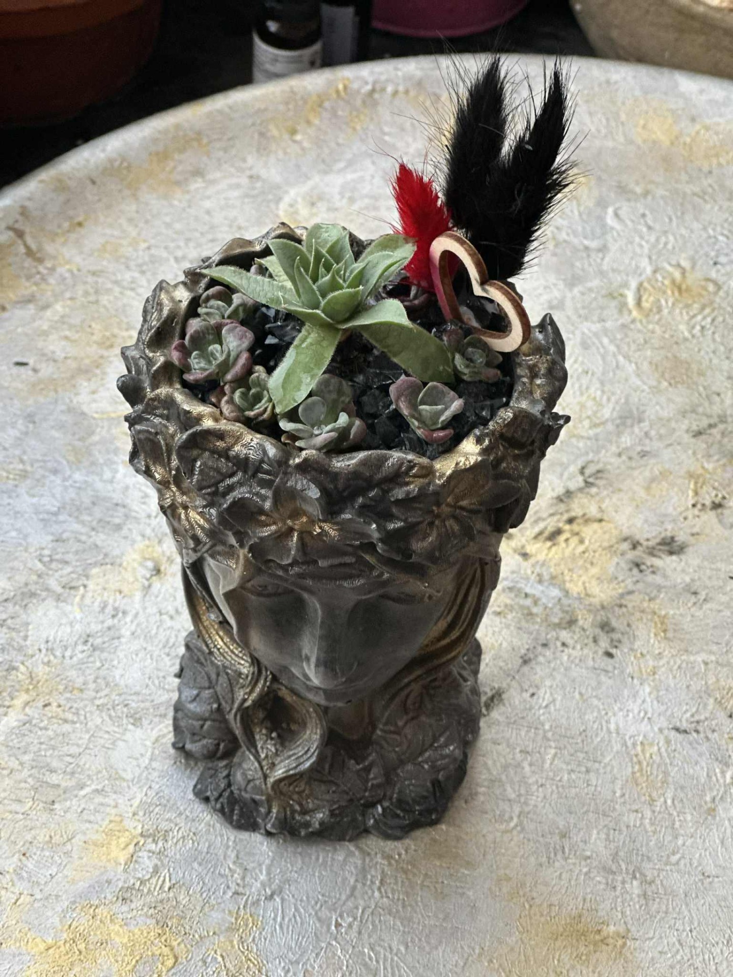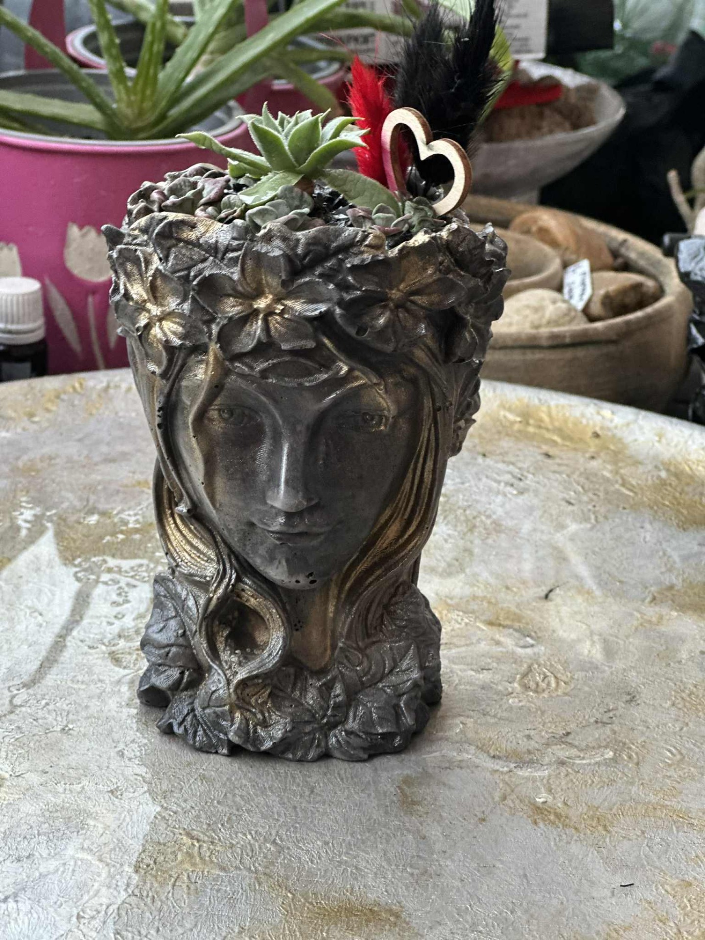 Istennő kaspó, élő pozsgással, sötétszürke, arany, ezüst, 1