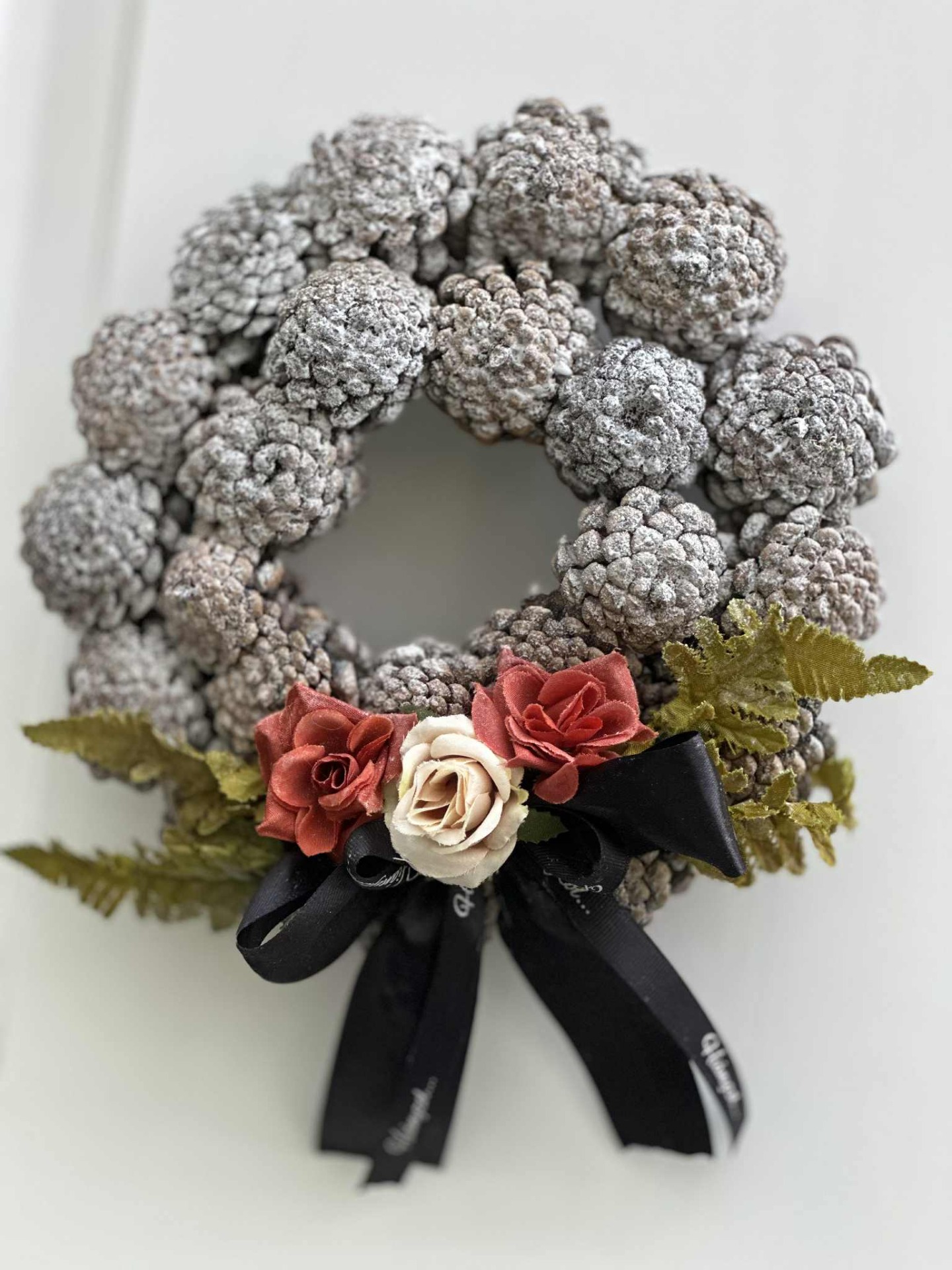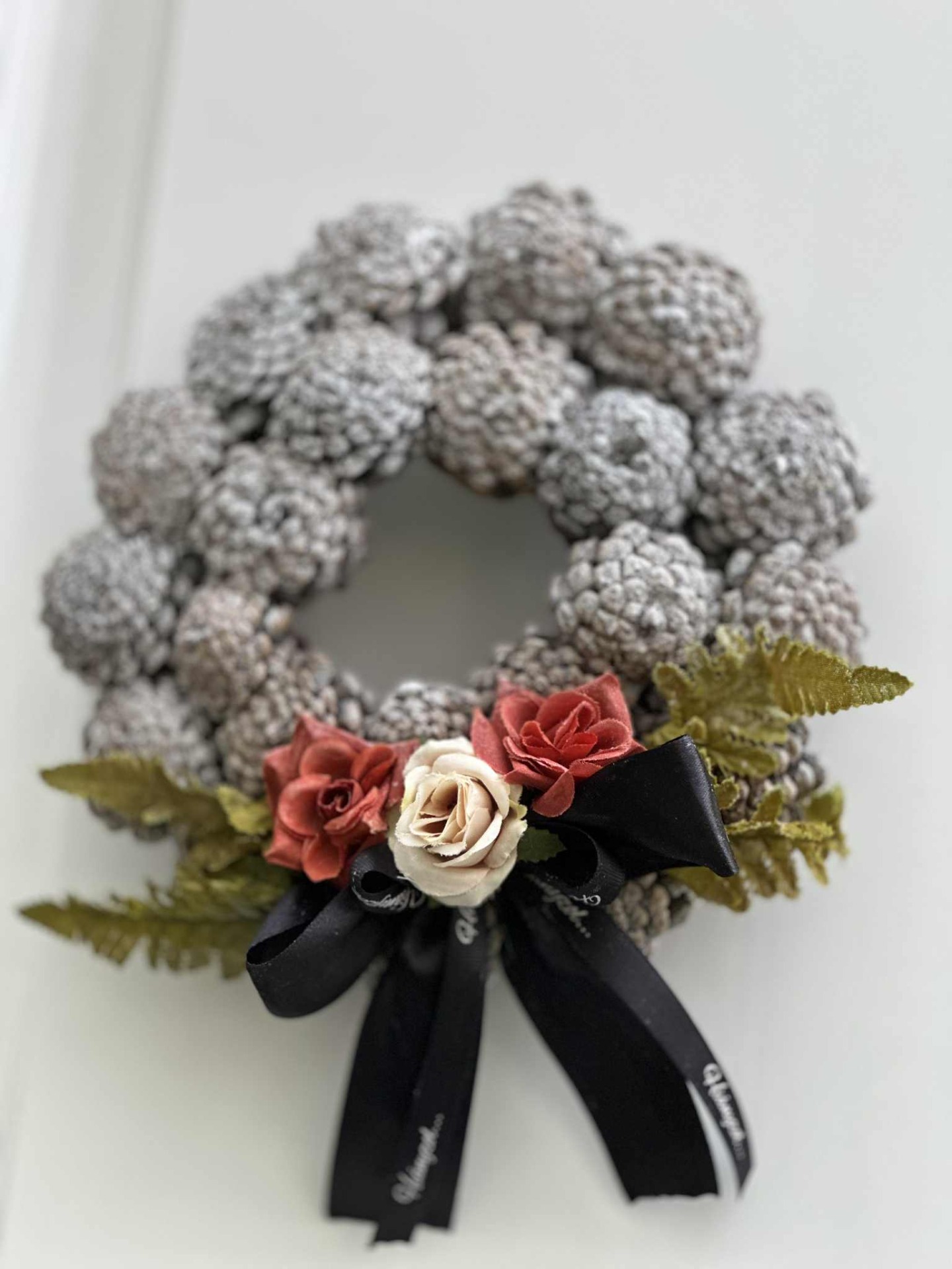 Kegyeleti koszorú, koszorúalap: hamvas tobozokkal összeállítva, szárazvirágokkal, masnival.