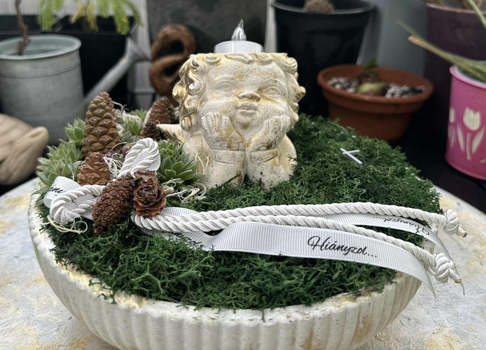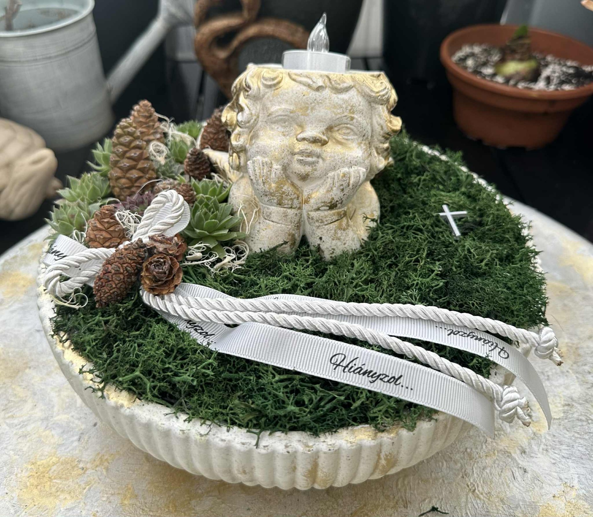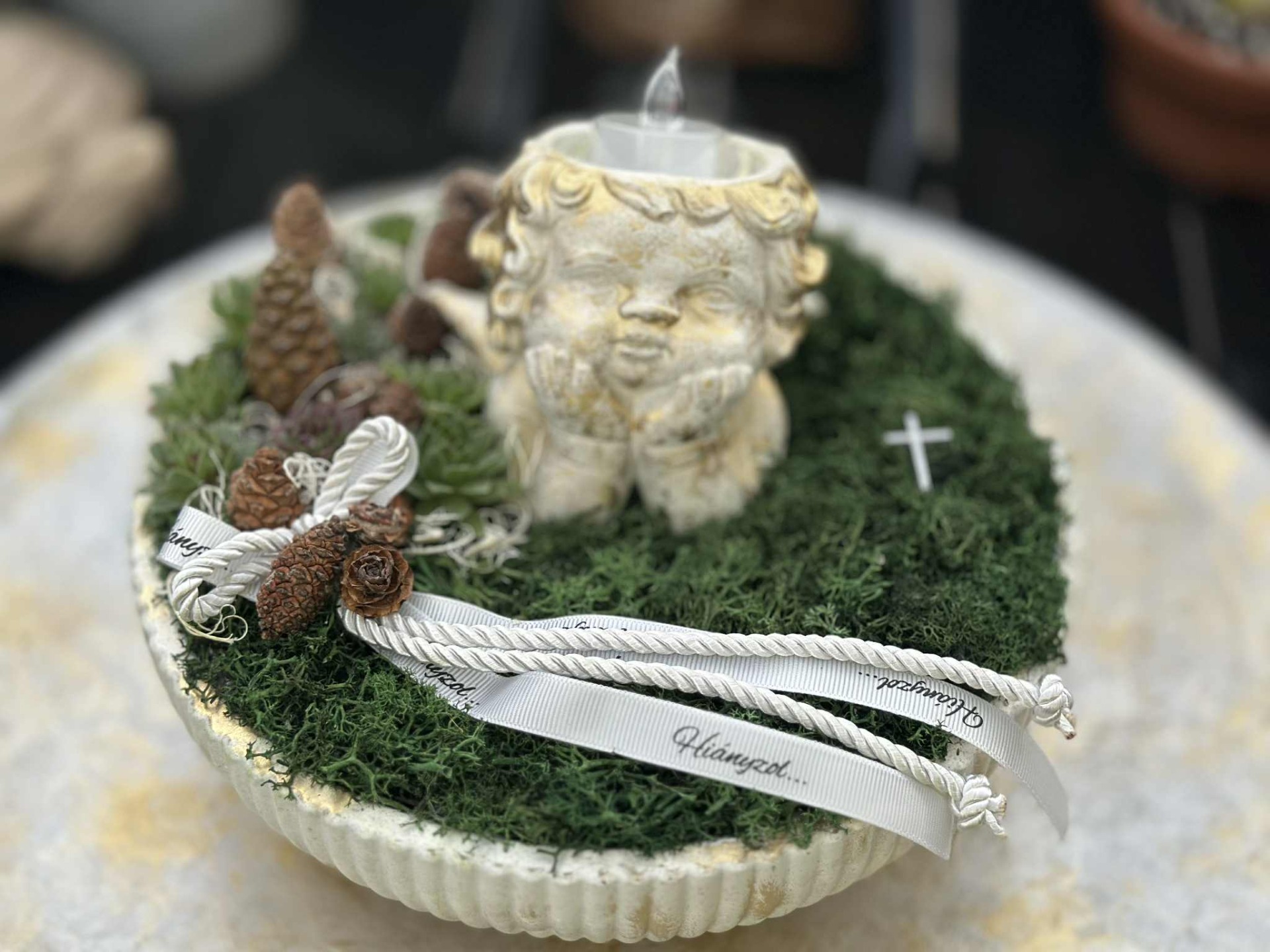 Kegyeleti, angyalkás, pozsgásokkal, izlandi mohával és tobozokkal beragasztott dekortál.