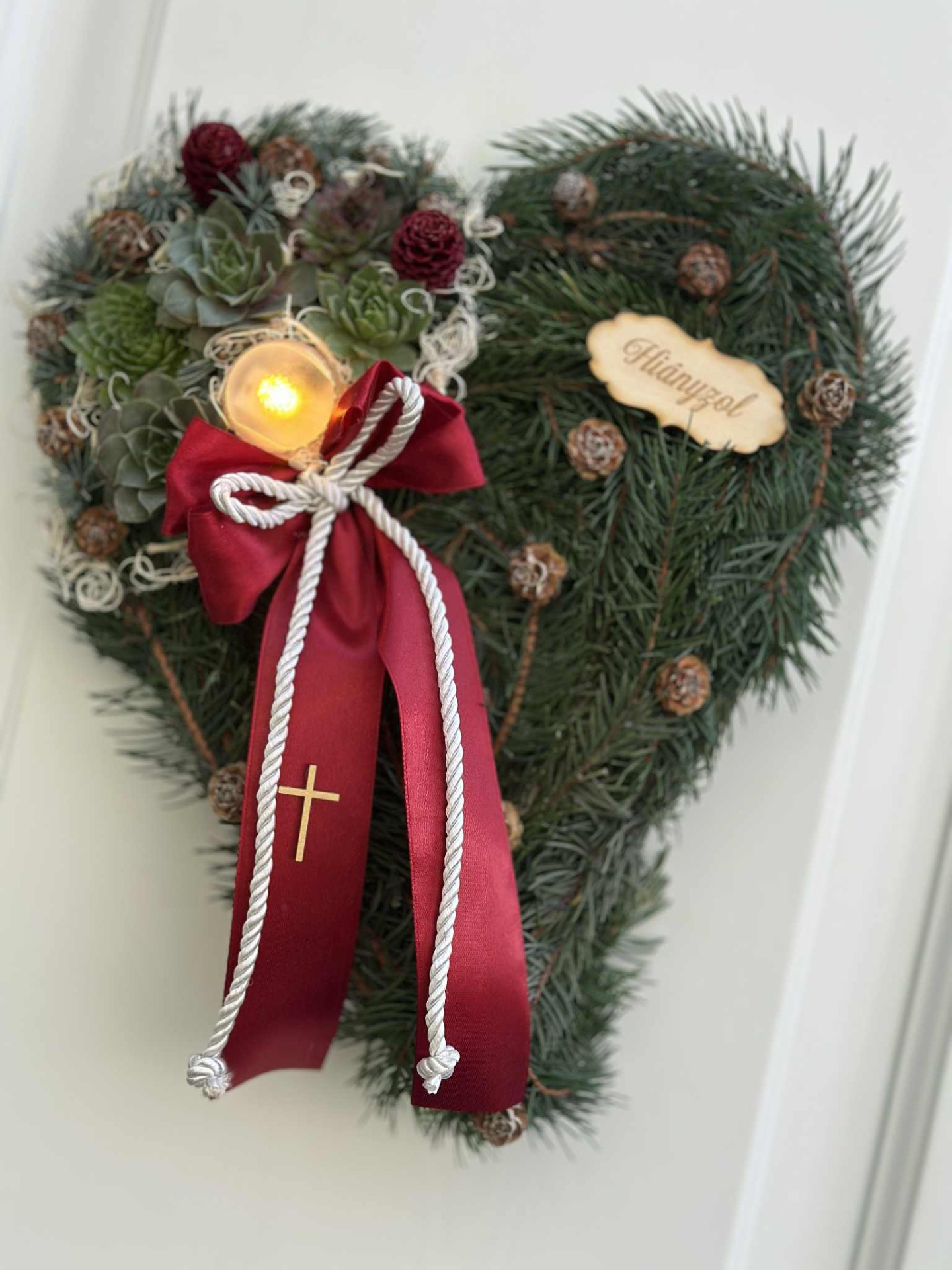 Kegyeleti koszorú, koszorúalap: szív formájú drót alap, fenyőágakkal összeállítva, élő pozsgásokkal (kövirózsa), száraz alapanyagokkal, masnival, dekor szalagokkal, fa táblával ("Hiányzol" felirattal), világítással és kereszttel. Hátoldalán fa kitámasztással.