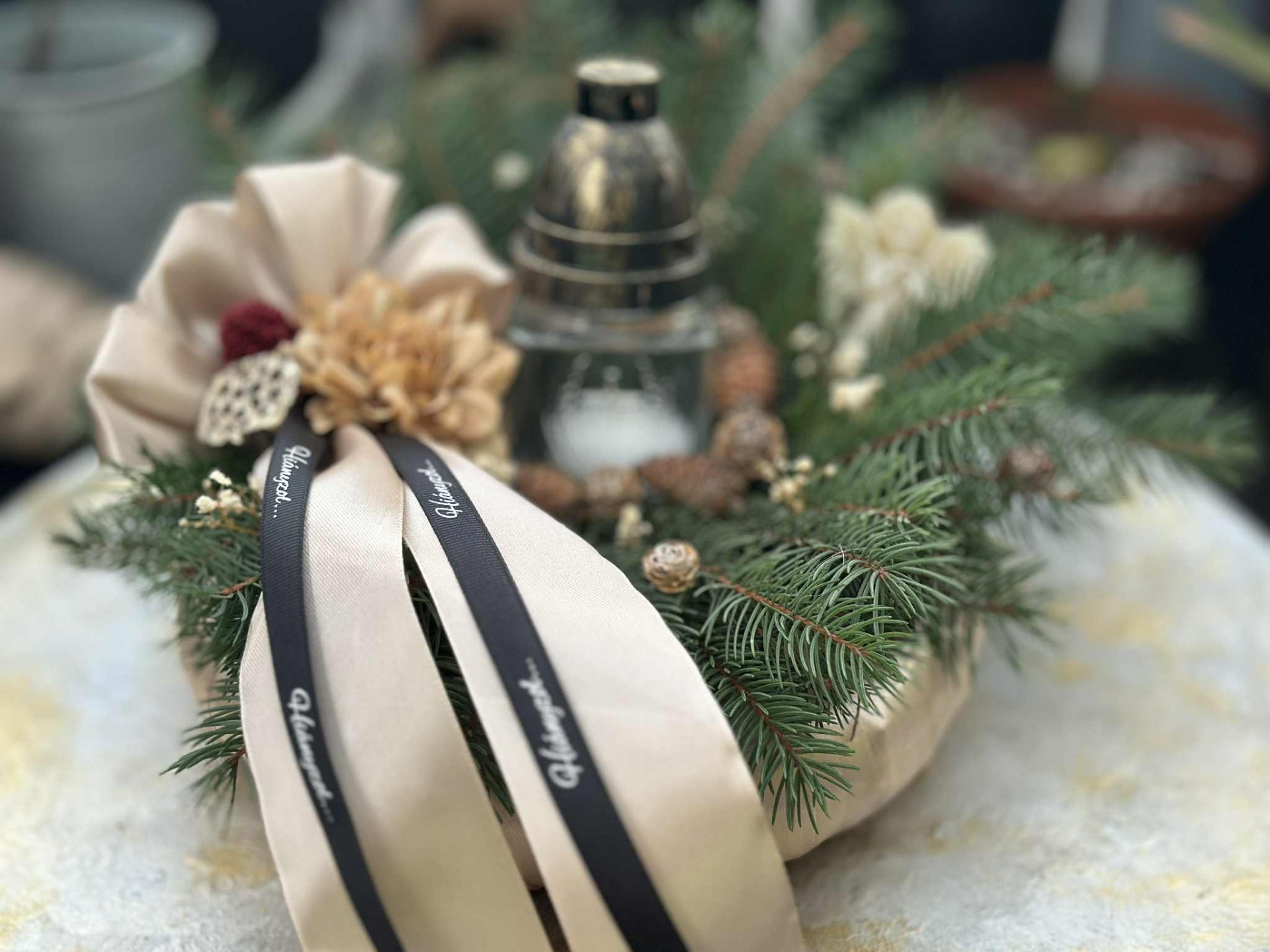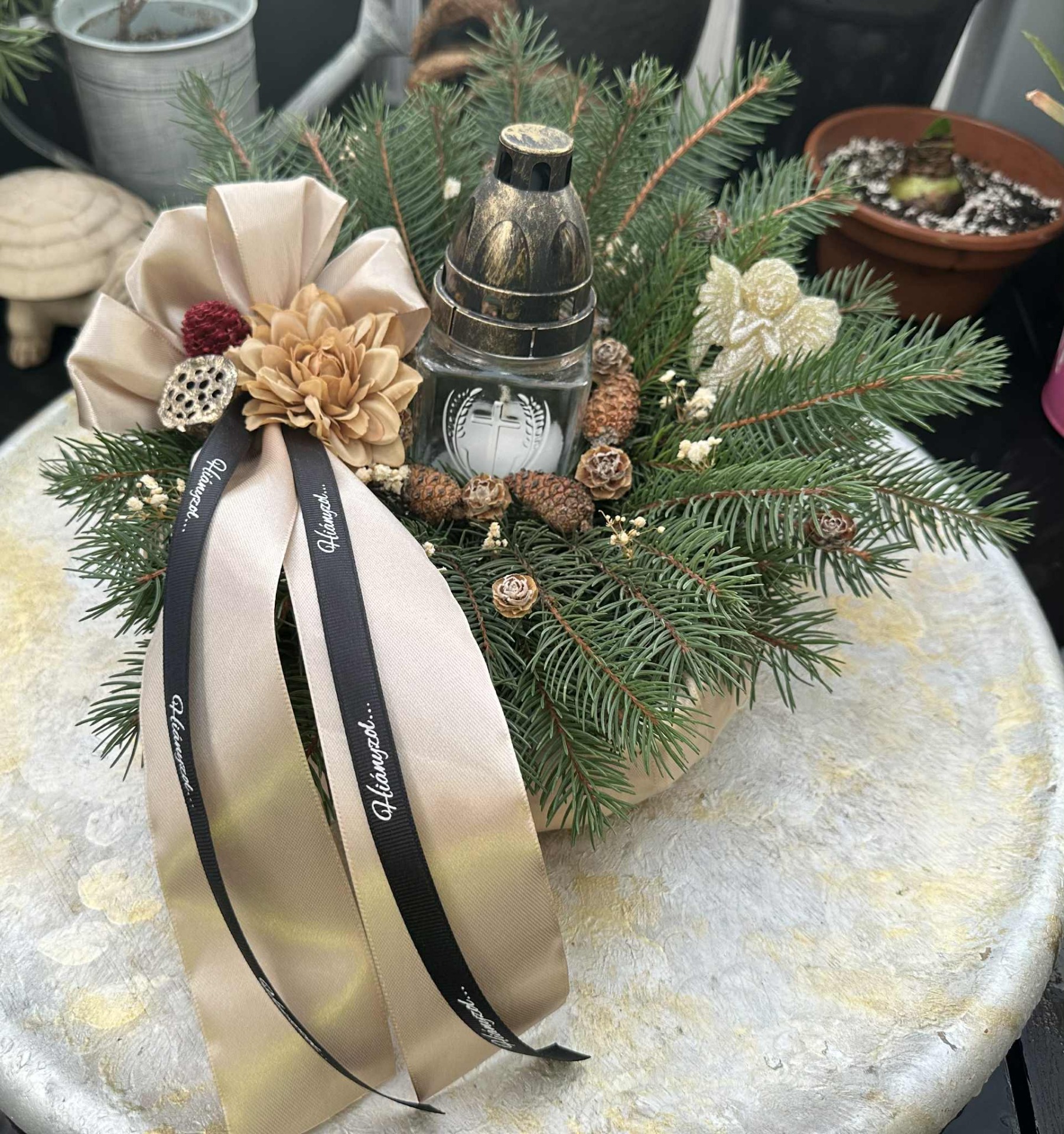 Kegyeleti koszorú, koszorúalap: szalma koszorú, dekor szalaggal feltekerve és összeállítva, szárazvirágokkal, fenyőágakkal, masnival, dekor szalagokkal ("Hiányzol" felirattal) mécsessel és műgyanta dekor angyalkával.