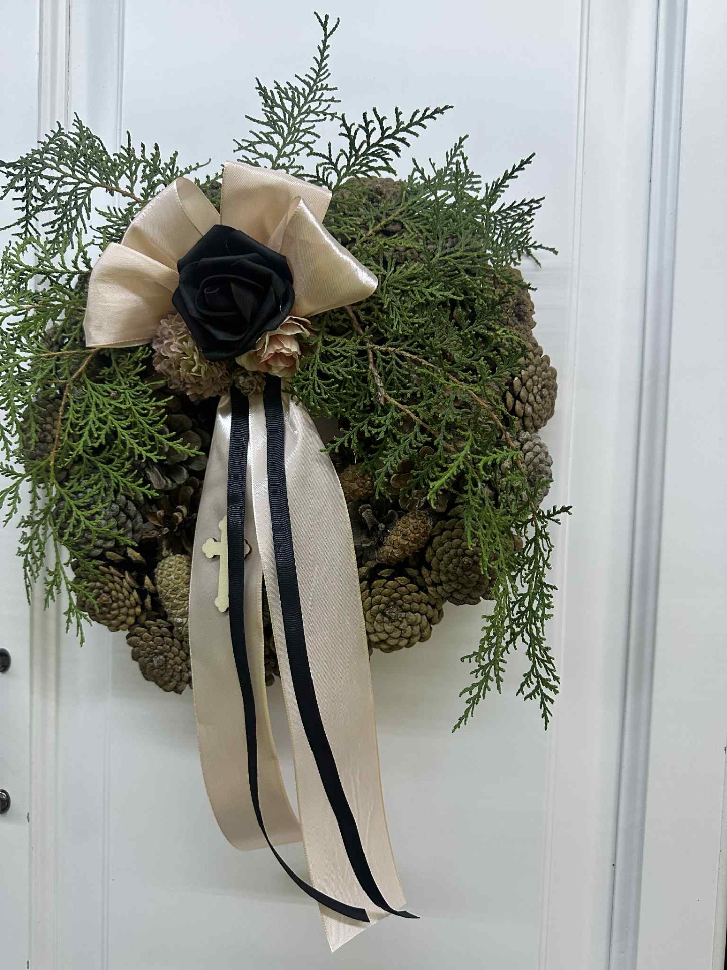 Kegyeleti koszorú, koszorúalap: tobozokkal összeállítva, szárazvirágokkal, tujaágakkal, masnival, dekor szalagokkal és kereszttel.
