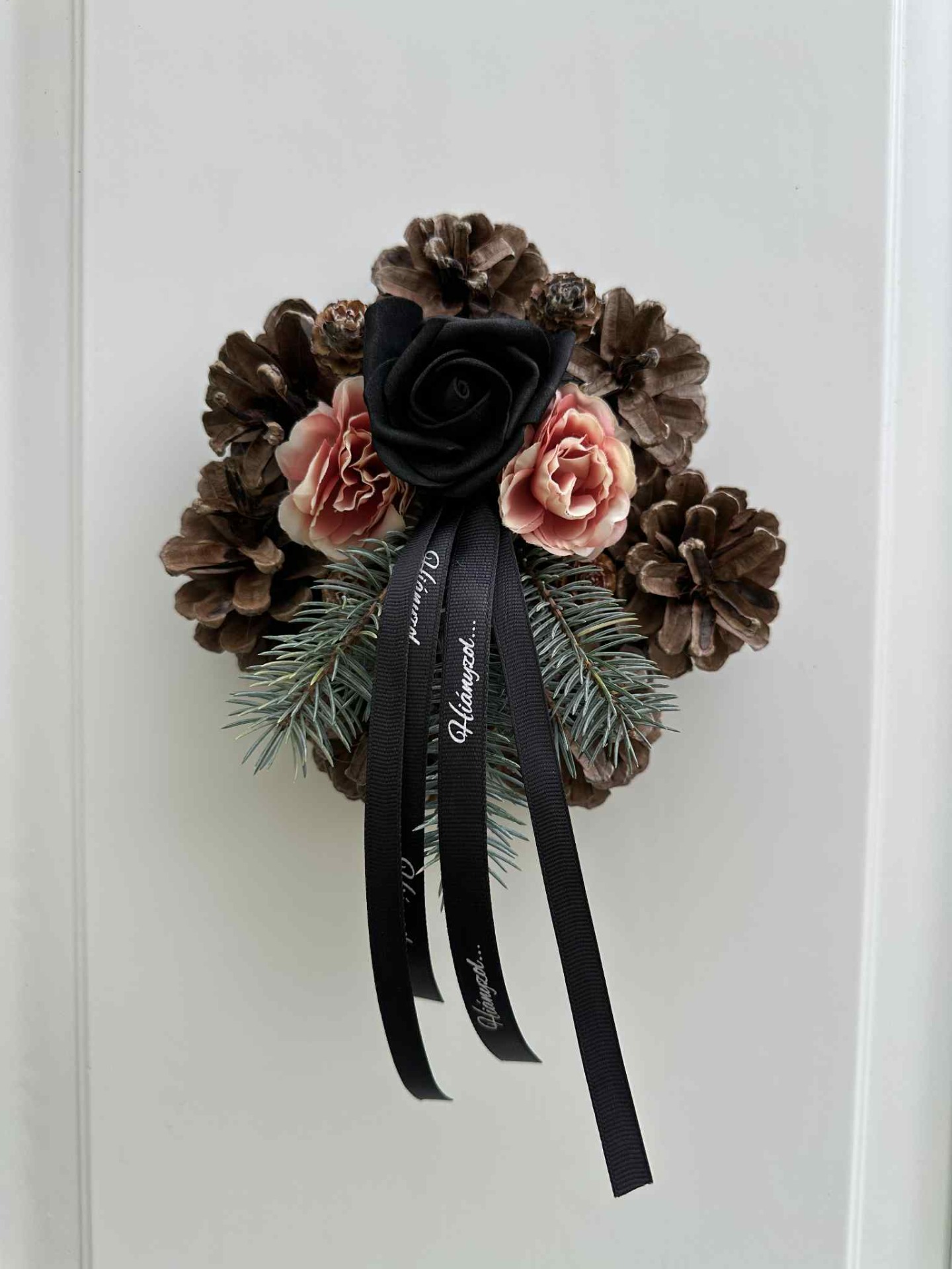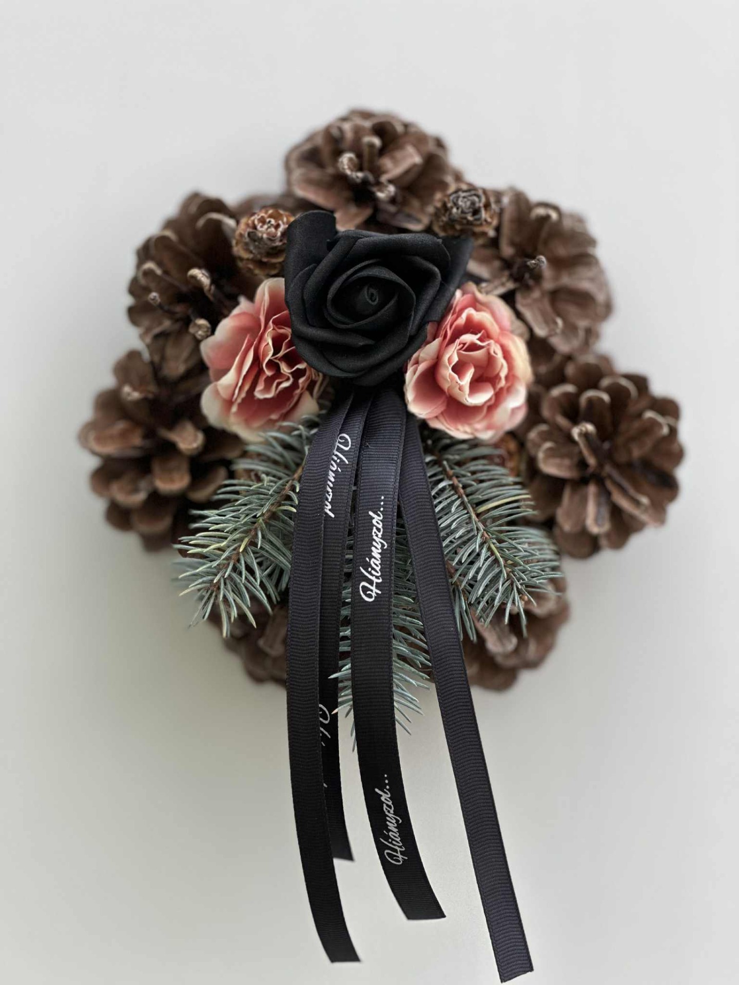 Kegyeleti koszorú, koszorúalap: tobozokkal összeállítva, szárazvirágokkal, masnival, fenyőágakkal.