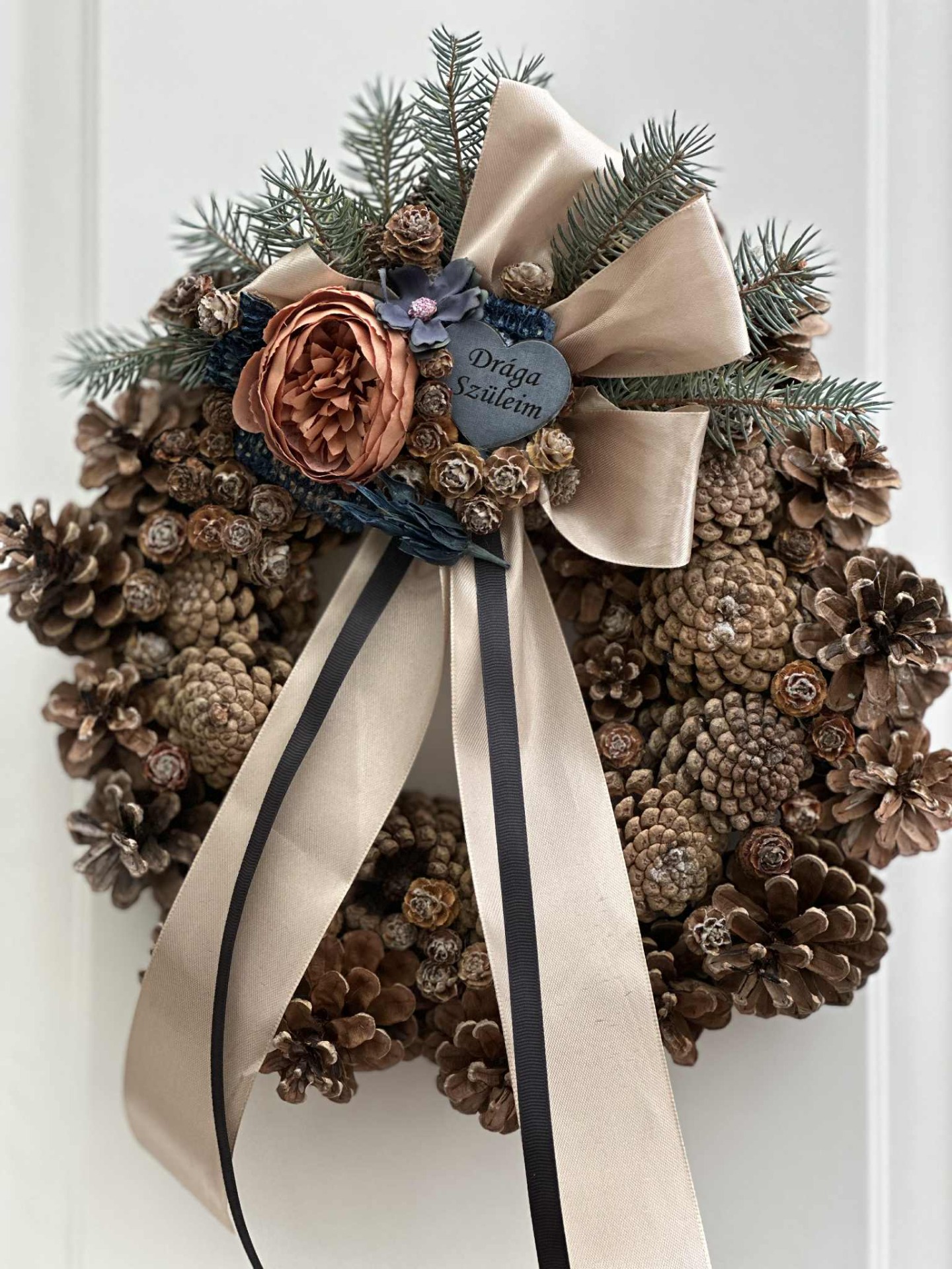 Kegyeleti koszorú, koszorúalap: tobozokkal összeállítva, szárazvirágokkal, fenyőágakkal, masnival, dekor szalagokkal és fatáblával ("Drága szüleim" felirattal).
