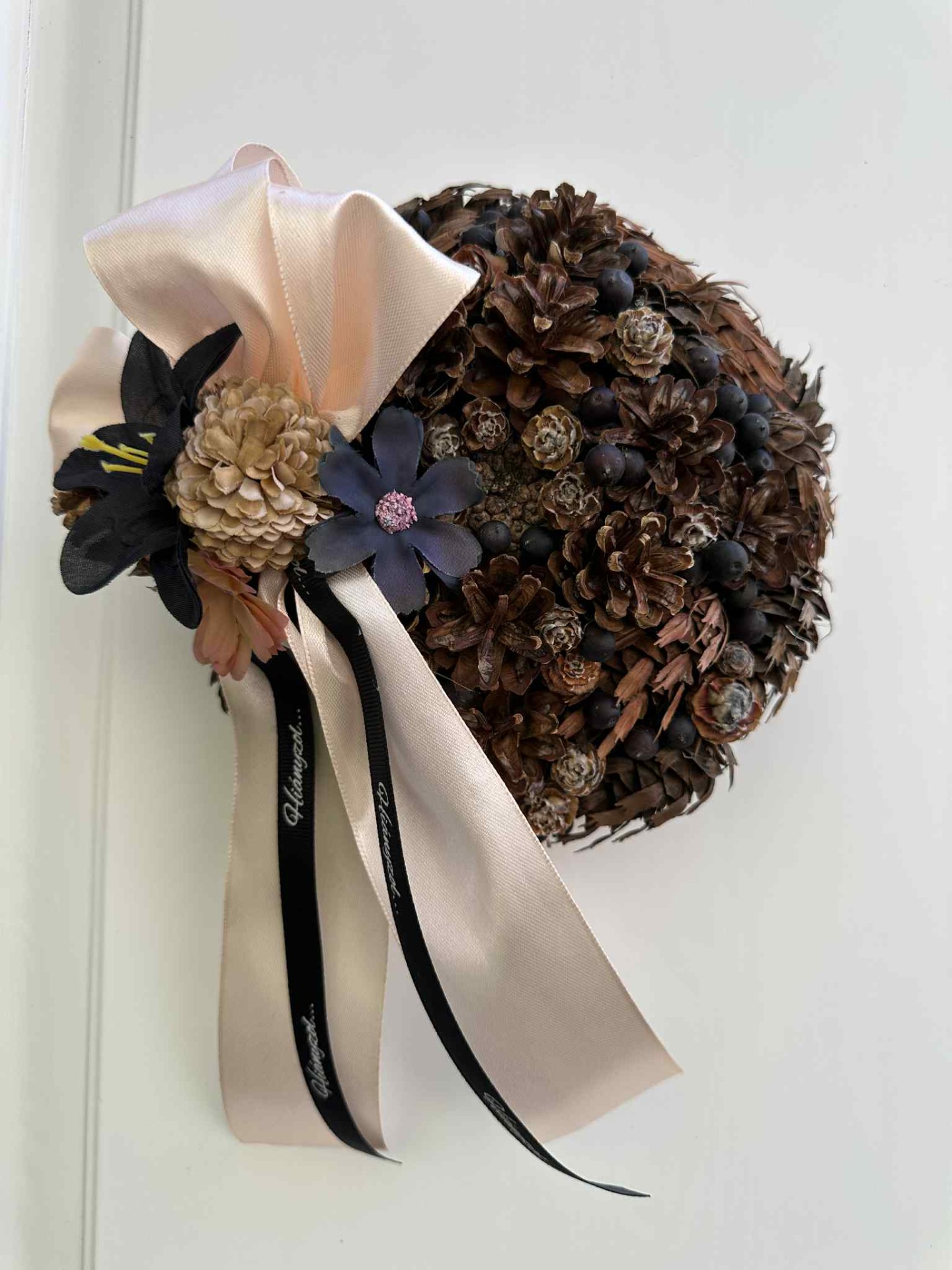 Kegyeleti koszorú, koszorúalap: több fajta tobozzal összeállítva, szárazvirágokkal, bogyókkal, masnival, dekor szalagokkal ("Hiányzol" felirattal).