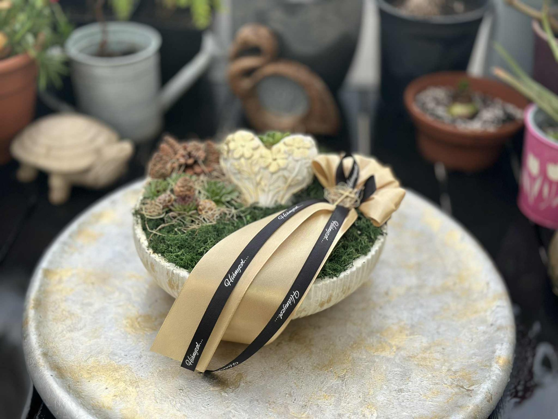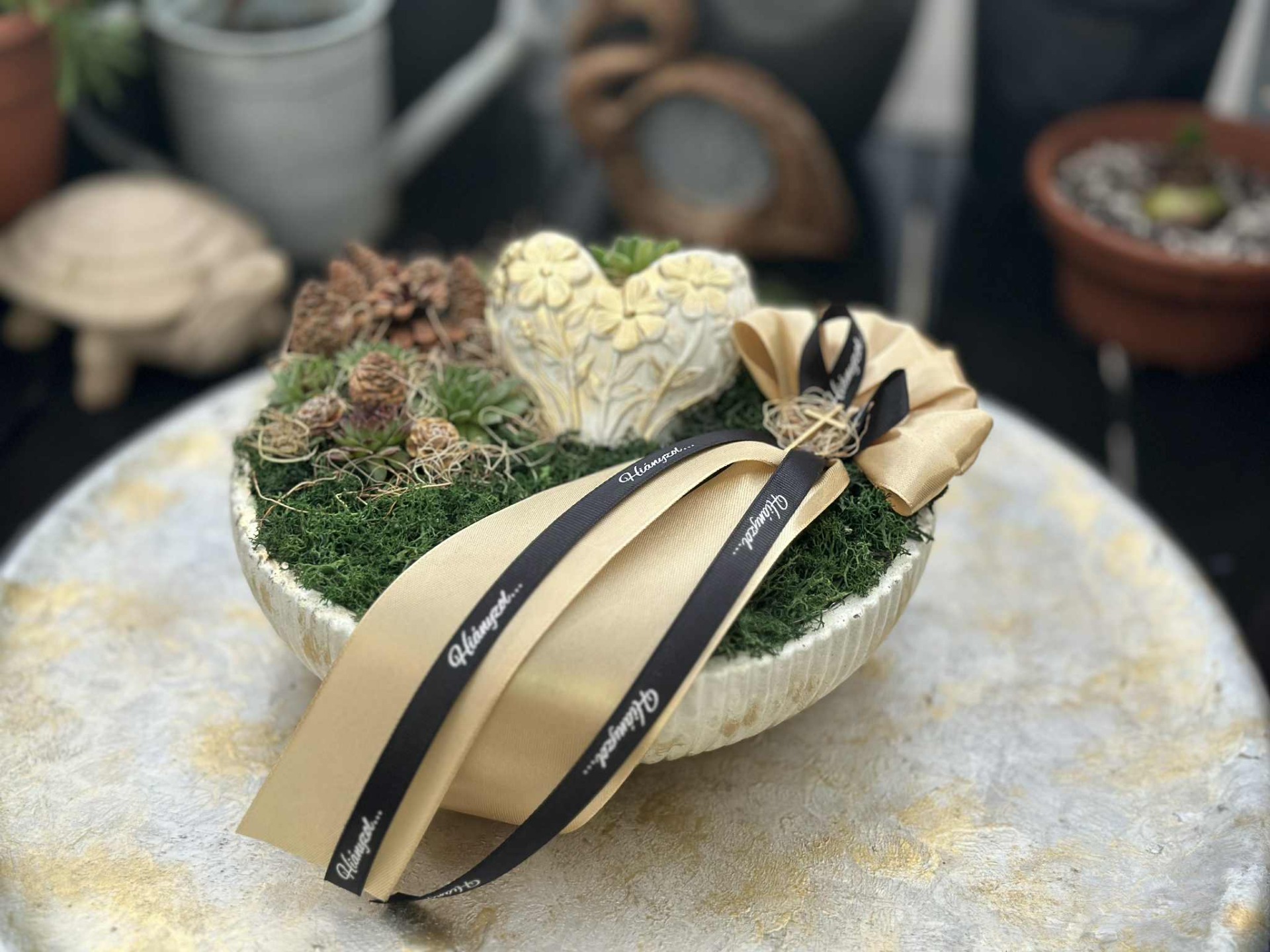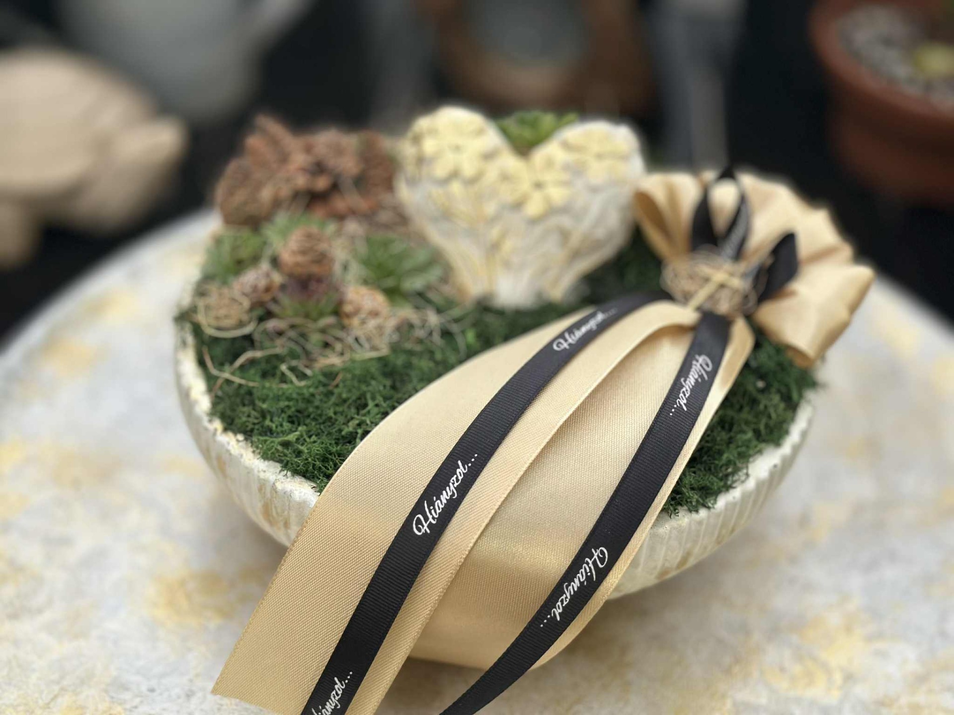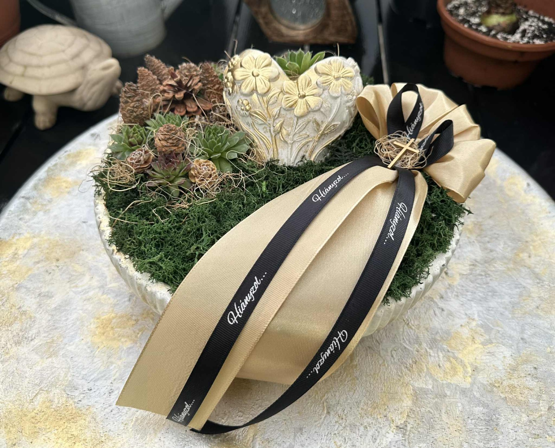Kegyeleti, szívecskés, virágos, élő pozsgás tál, világítással