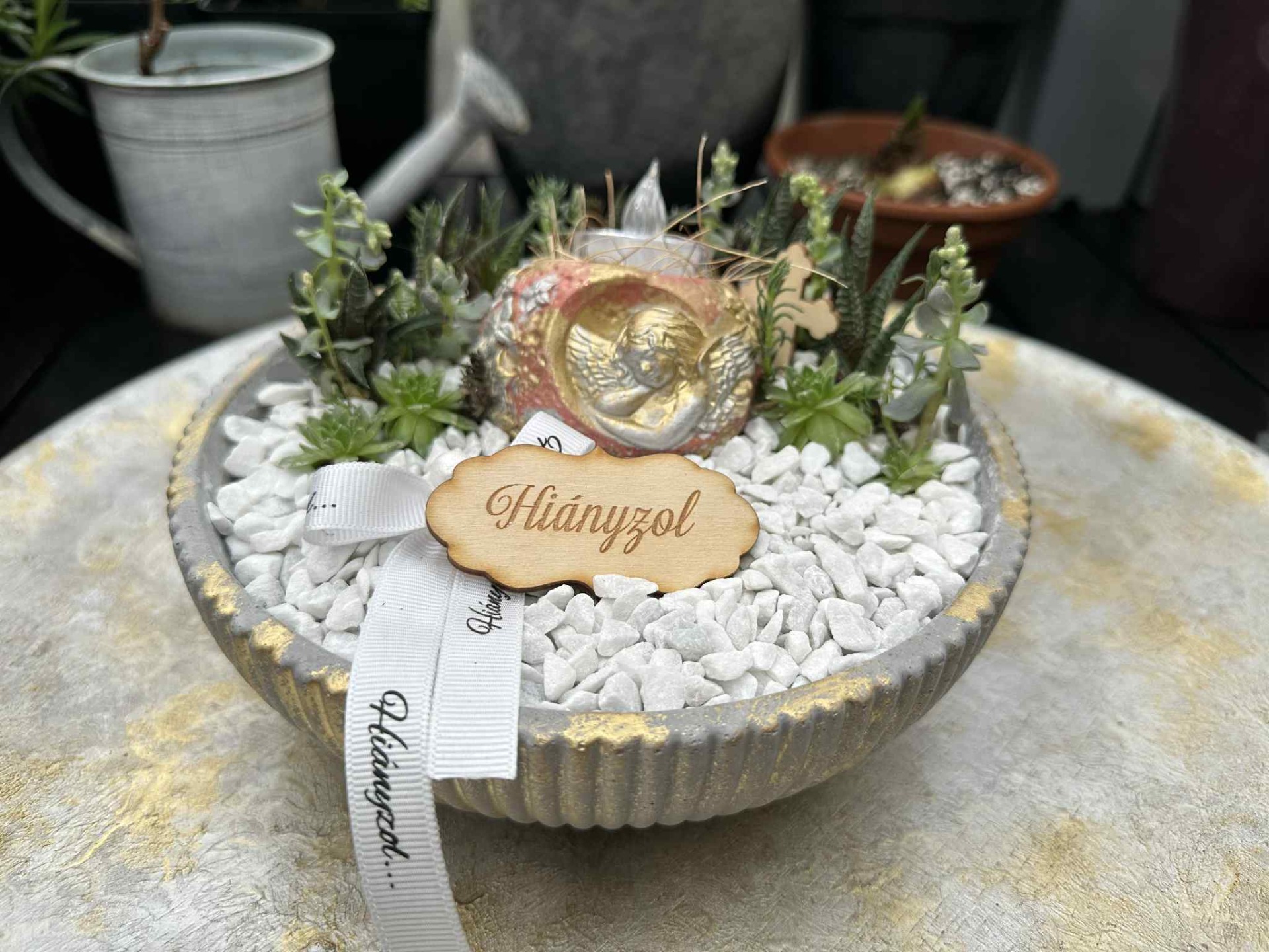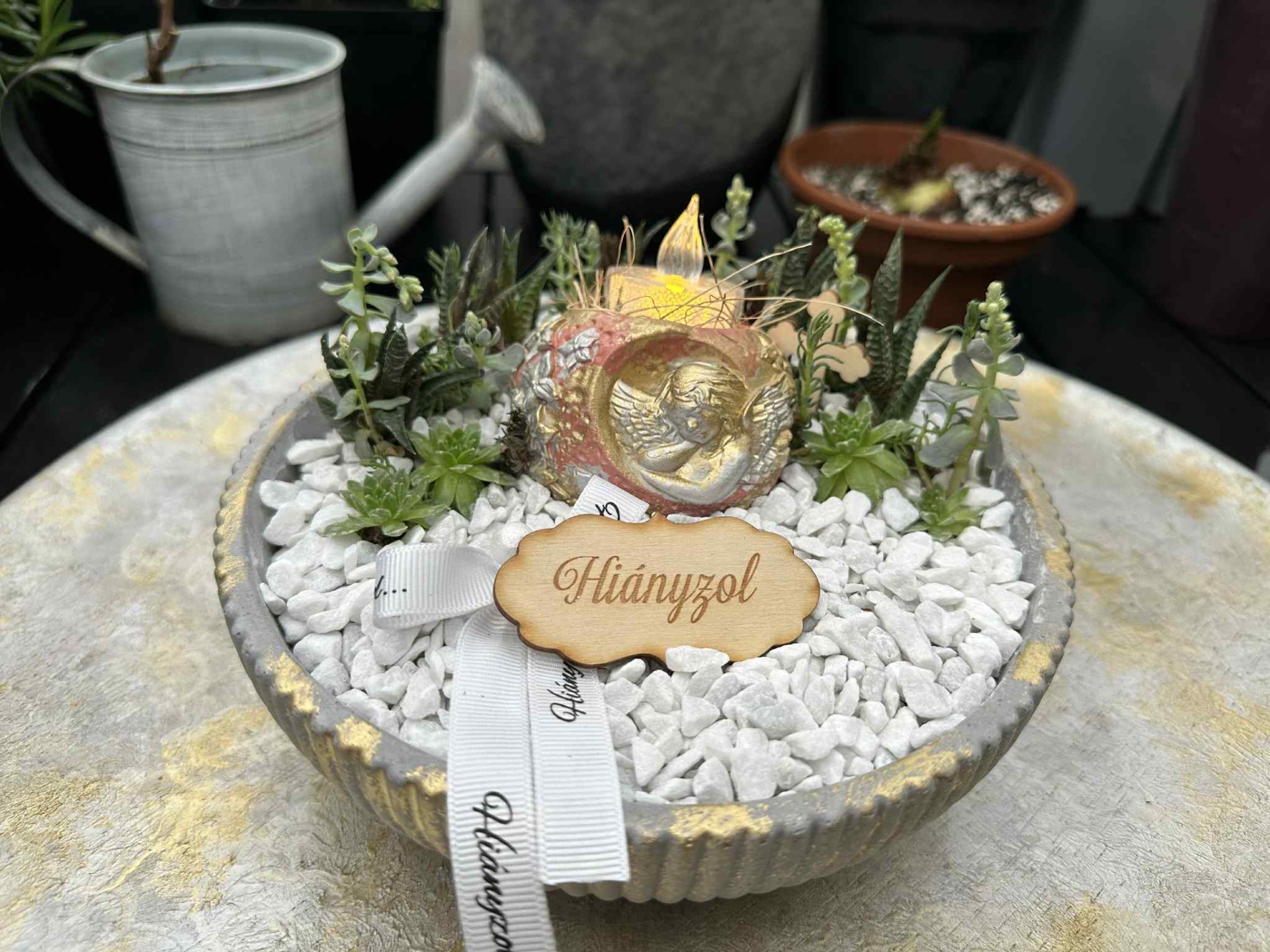 Fagyálló kegyeleti tál, angyalos dombornyomott kaspóval, szürke arany, rose gold színösszeállítással. Élő pozsgással beültetve, mécses világítással, dekorkővel, "Hiányzol" fatáblával.