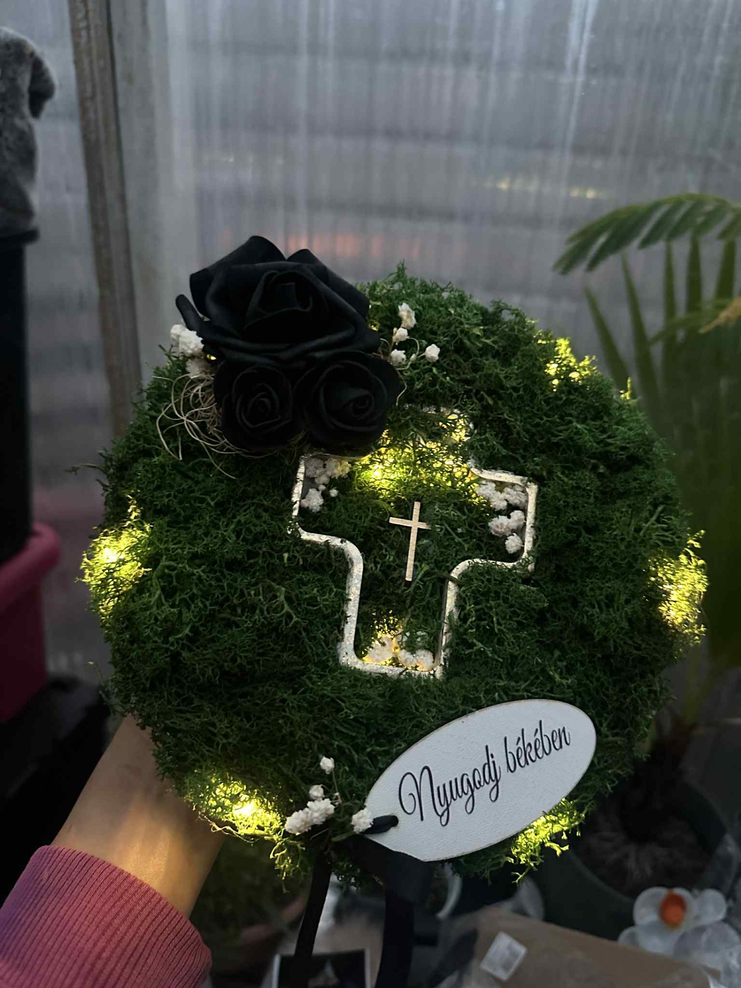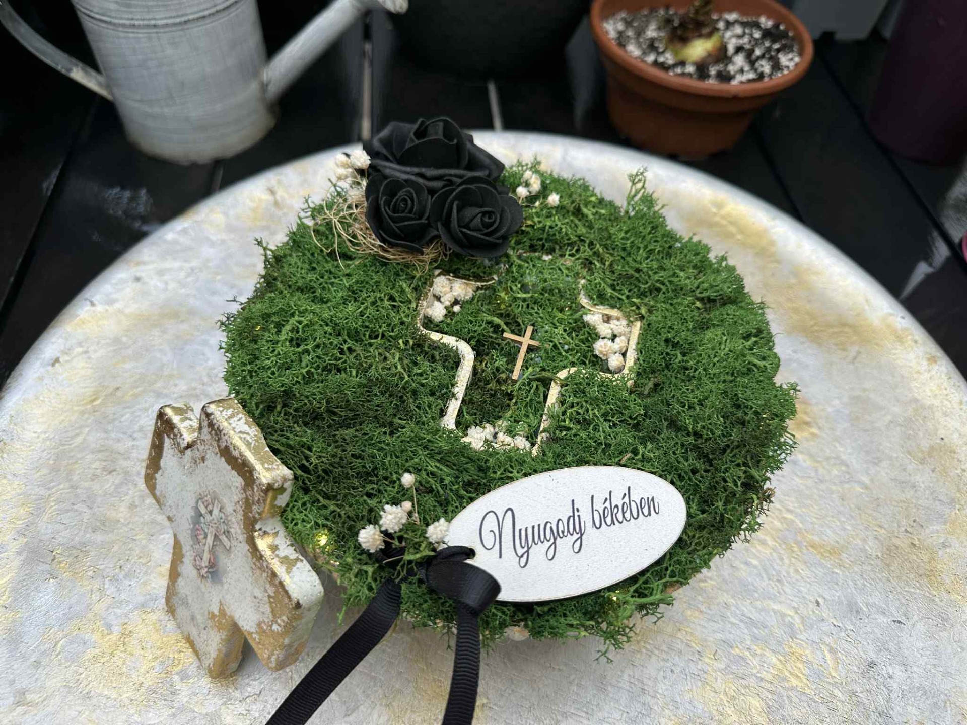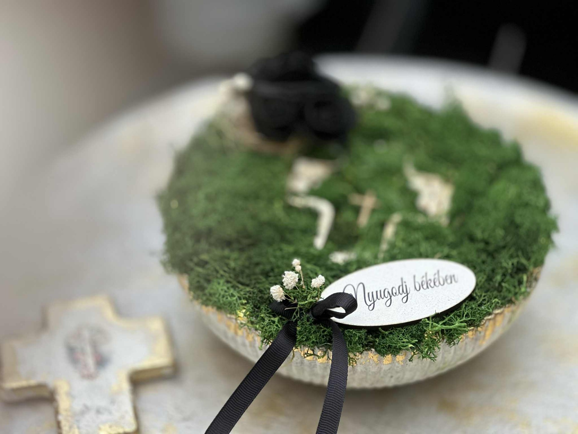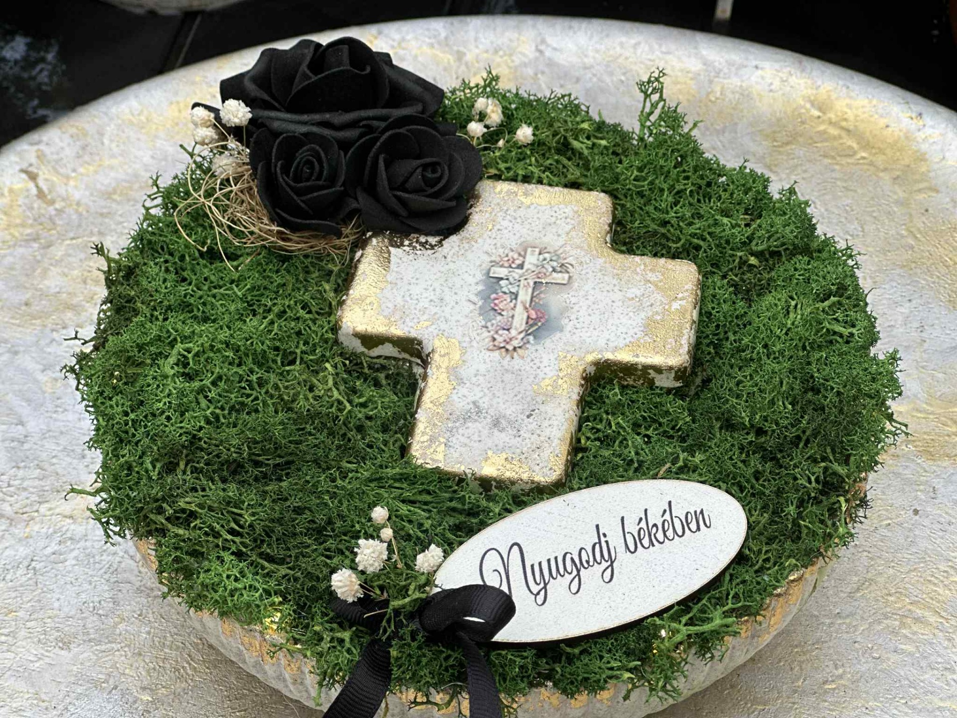 Fagyálló tál, kereszt alakú kaspóval, fehér, arany színösszeállítással. Izlandi zuzmó és szárazanyag beragasztással, "Nyugodj békében" fatáblával, melegfehér színű világítással.