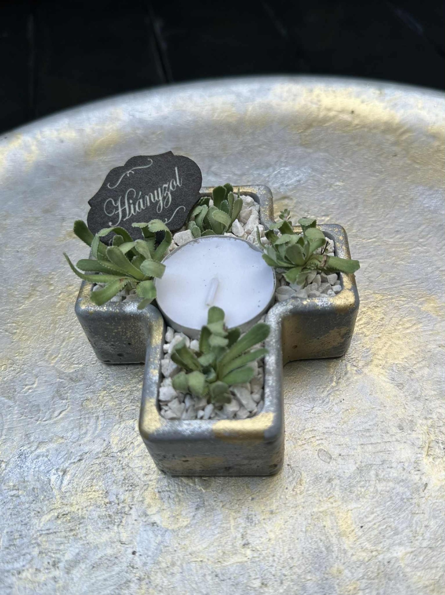 Fagyálló kereszt alakú kaspó, szürke, ezüst, arany színösszeállítással. Élő pozsgássokkal beültetve, dekorkővel, "Hiányzol" fatáblával.