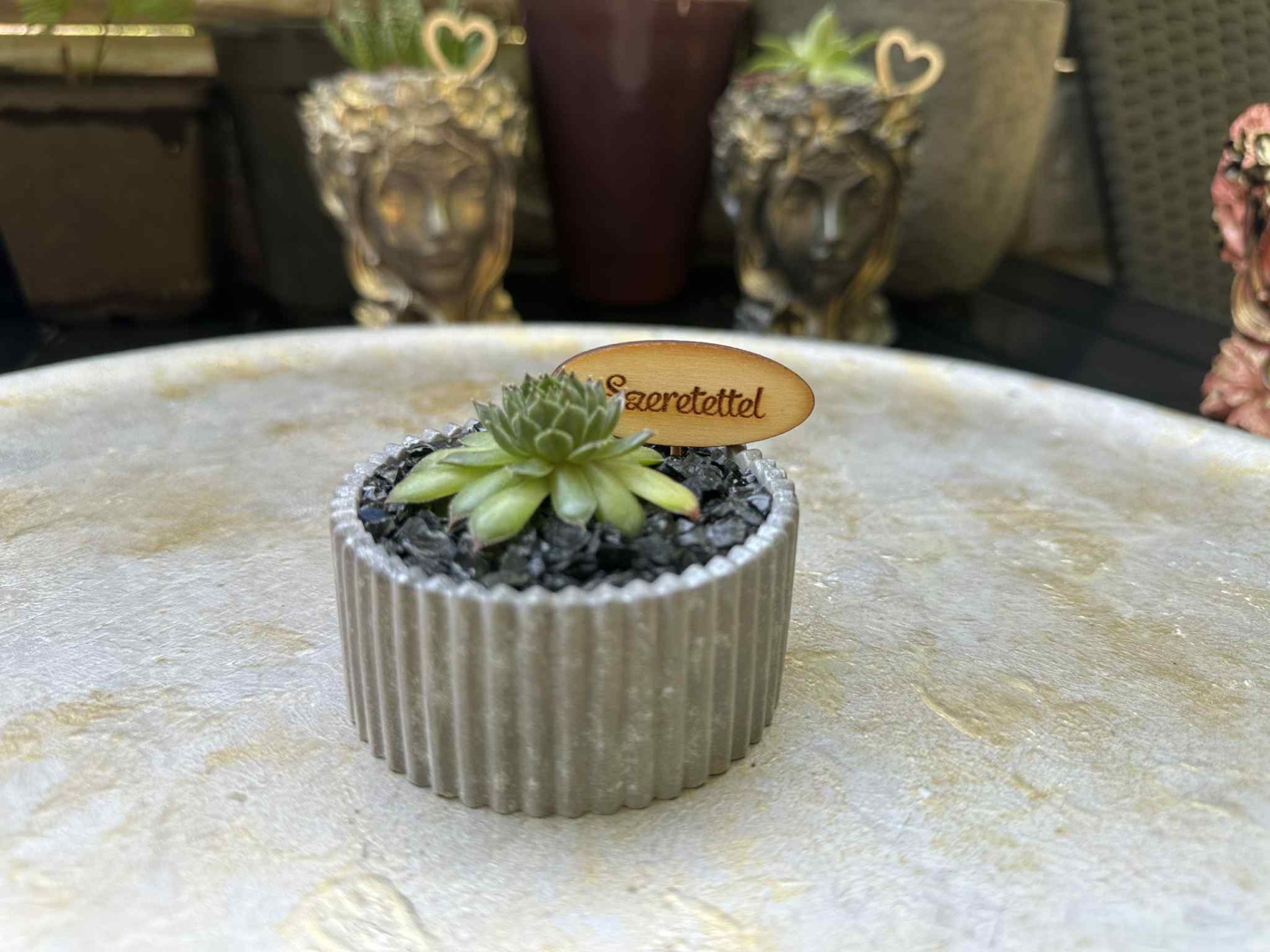 Kicsi gipsz kaspó, élő pozsgással beültetve, dekorkővel megszórva, "Szeretettel" fatáblával díszítve, szürke, ezüst színösszeállítással.