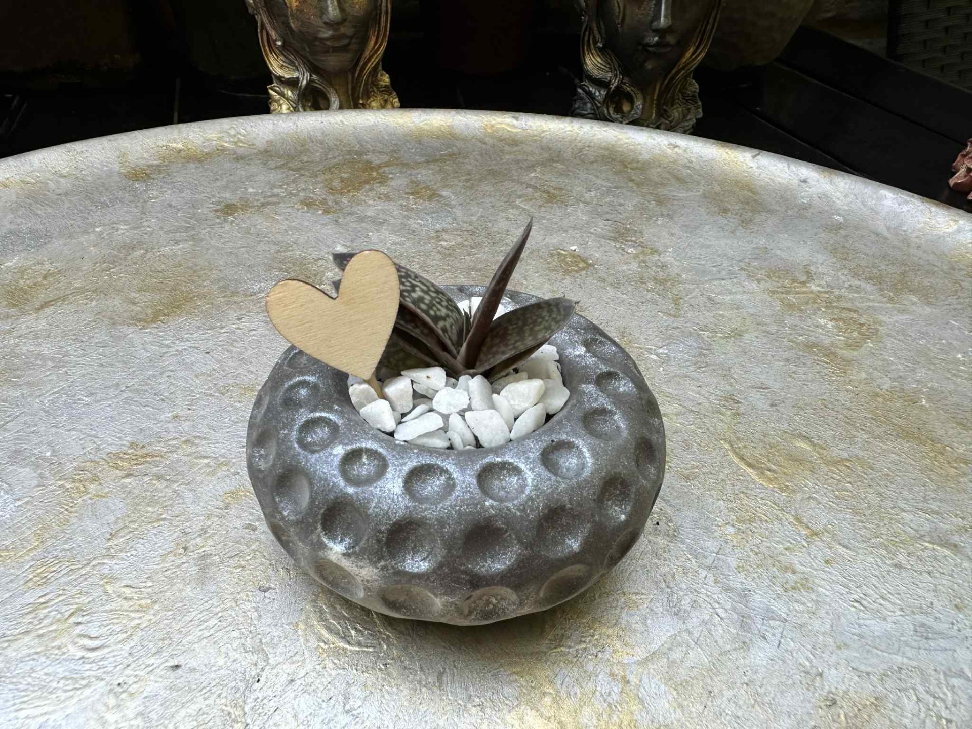 Kicsi gipsz kaspó, élő pozsgással beültetve, dekorkővel megszórva, szív fatáblával díszítve, szürke, ezüst színösszeállítással.