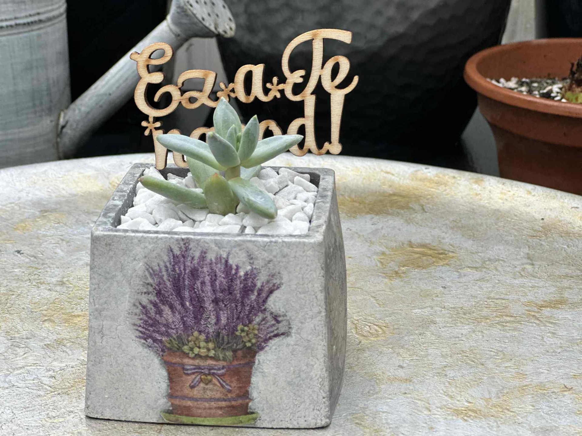 Fagyálló kocka szív virágos kaspó, élő pozsgással beültetve, dekorációval, "Ez a Te napod!" fatáblával, dekorkővel megszórva.