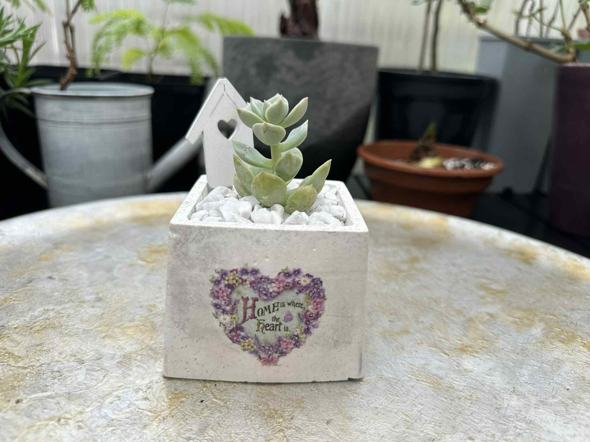 Fagyálló kocka szív virágos kaspó, élő pozsgással beültetve, dekorációval, dekorkővel megszórva.