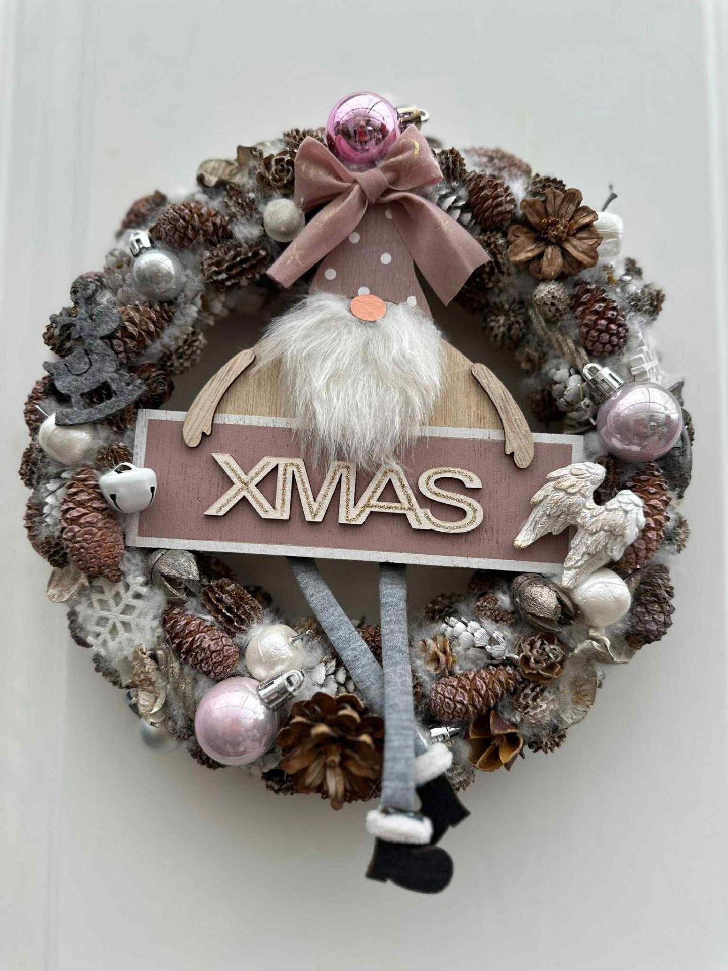 Manó ajtódísz, hideg fehér színű világítással, rózsaszín, barna fehér színű összeállítás.