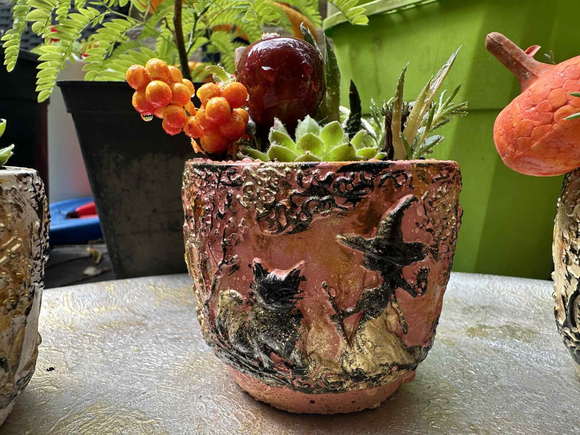 Fagyálló, őszi, boszorkány és fekete macska kaspó, élő pozsgással, dekorációval, dekorkővel megszórva, rose gold, fekete, arany színösszeállítással.