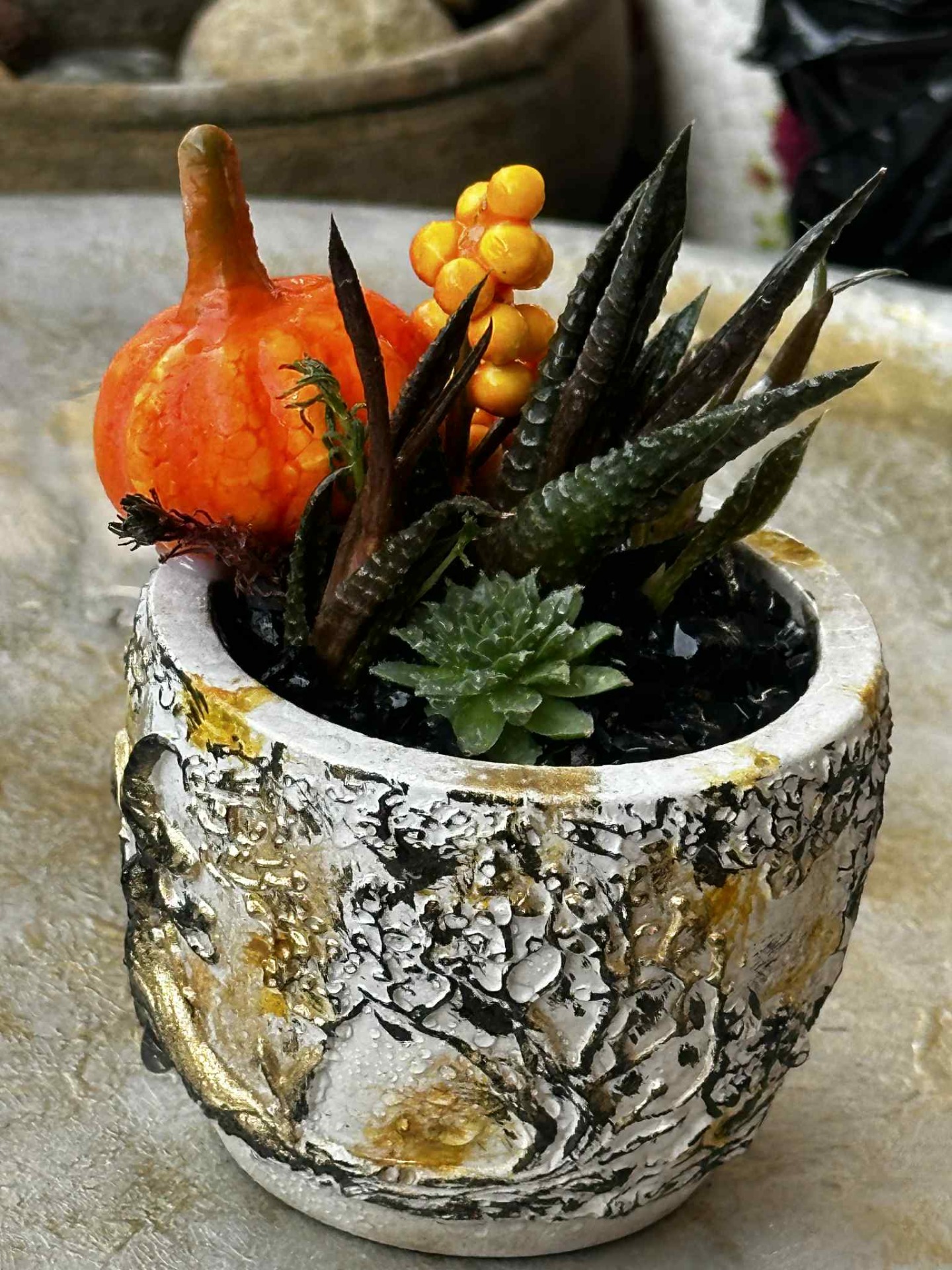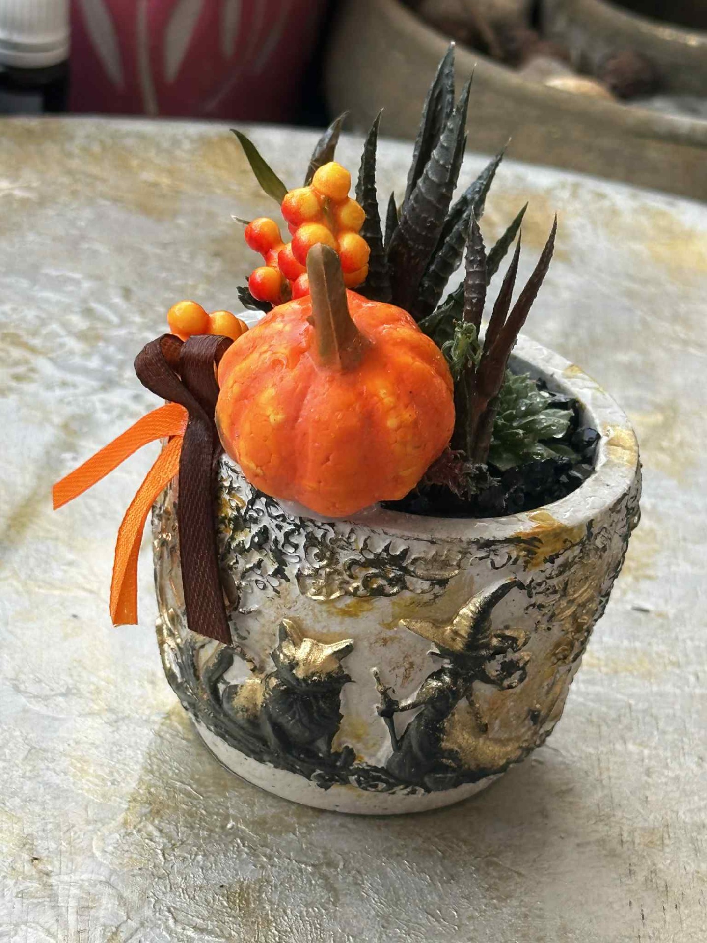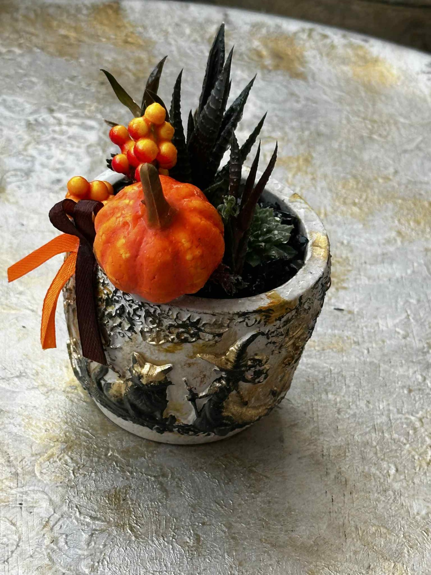 Őszi, boszorkány és fekete macska kaspó, élő pozsgással, fehér, arany, fekete, 2
