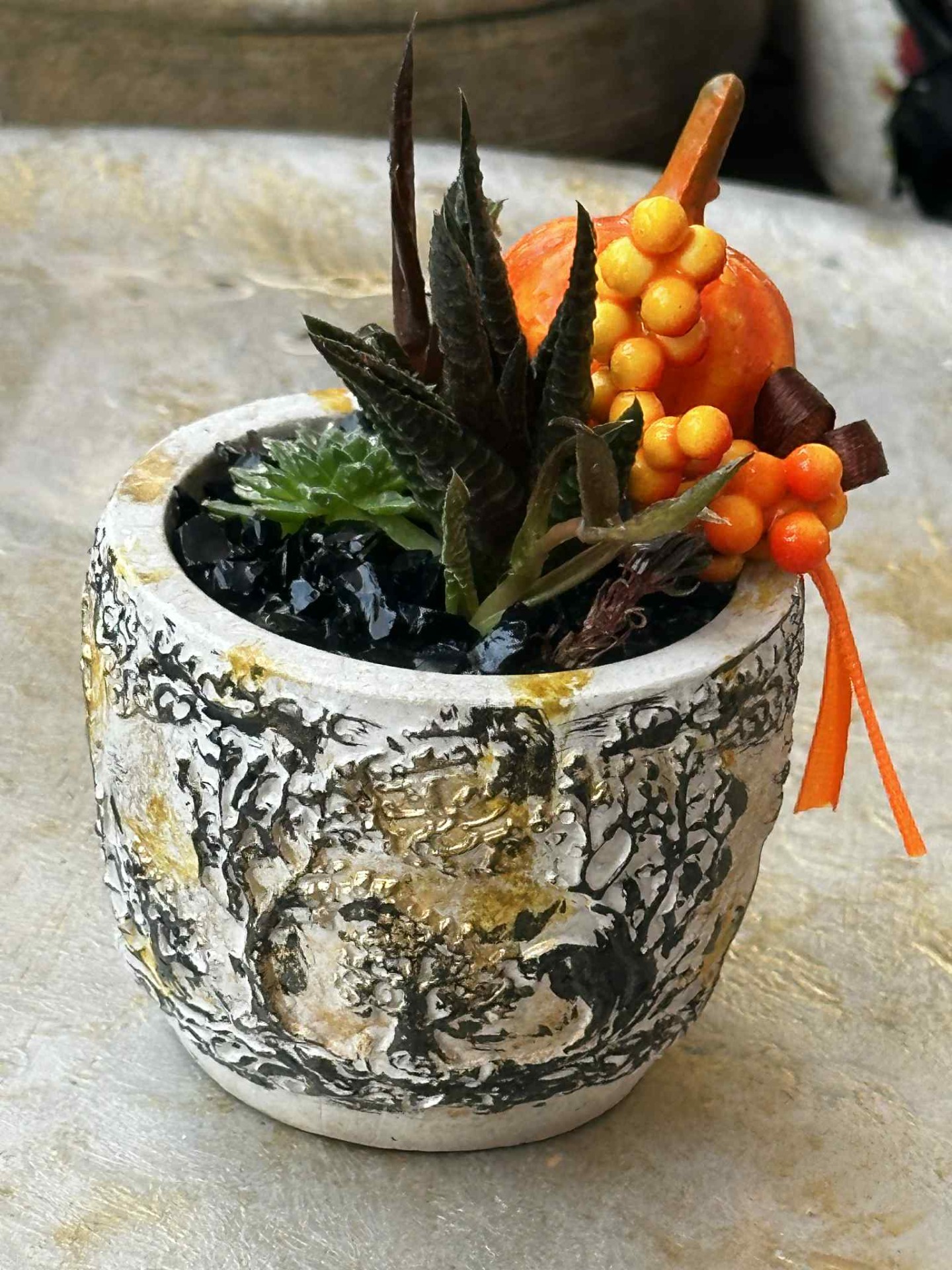 Fagyálló, őszi, boszorkány és fekete macska kaspó, élő pozsgással, dekorációval, dekorkővel megszórva, fehér, arany, fekete színösszeállítással.