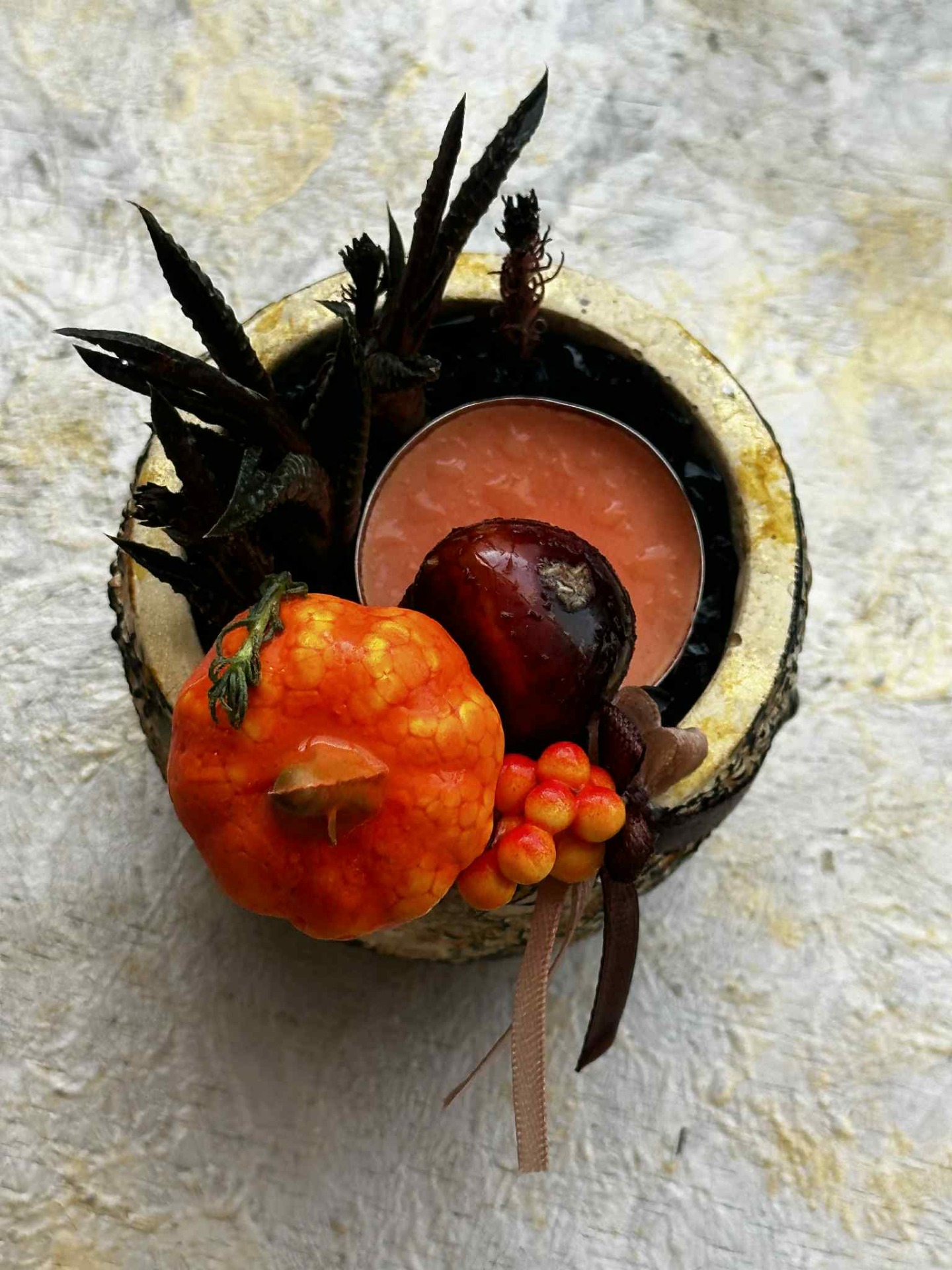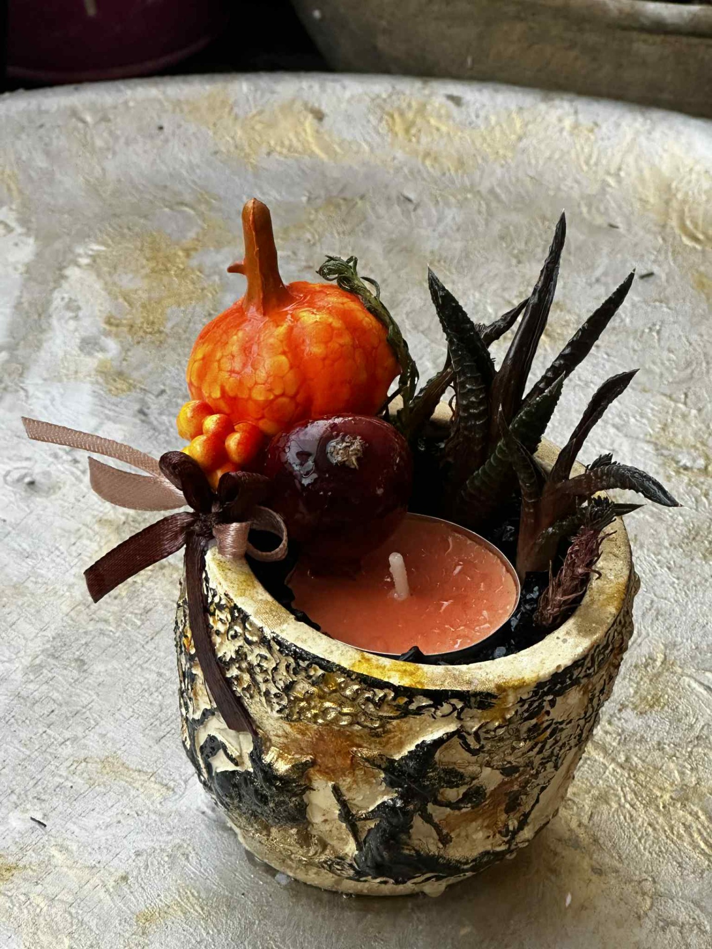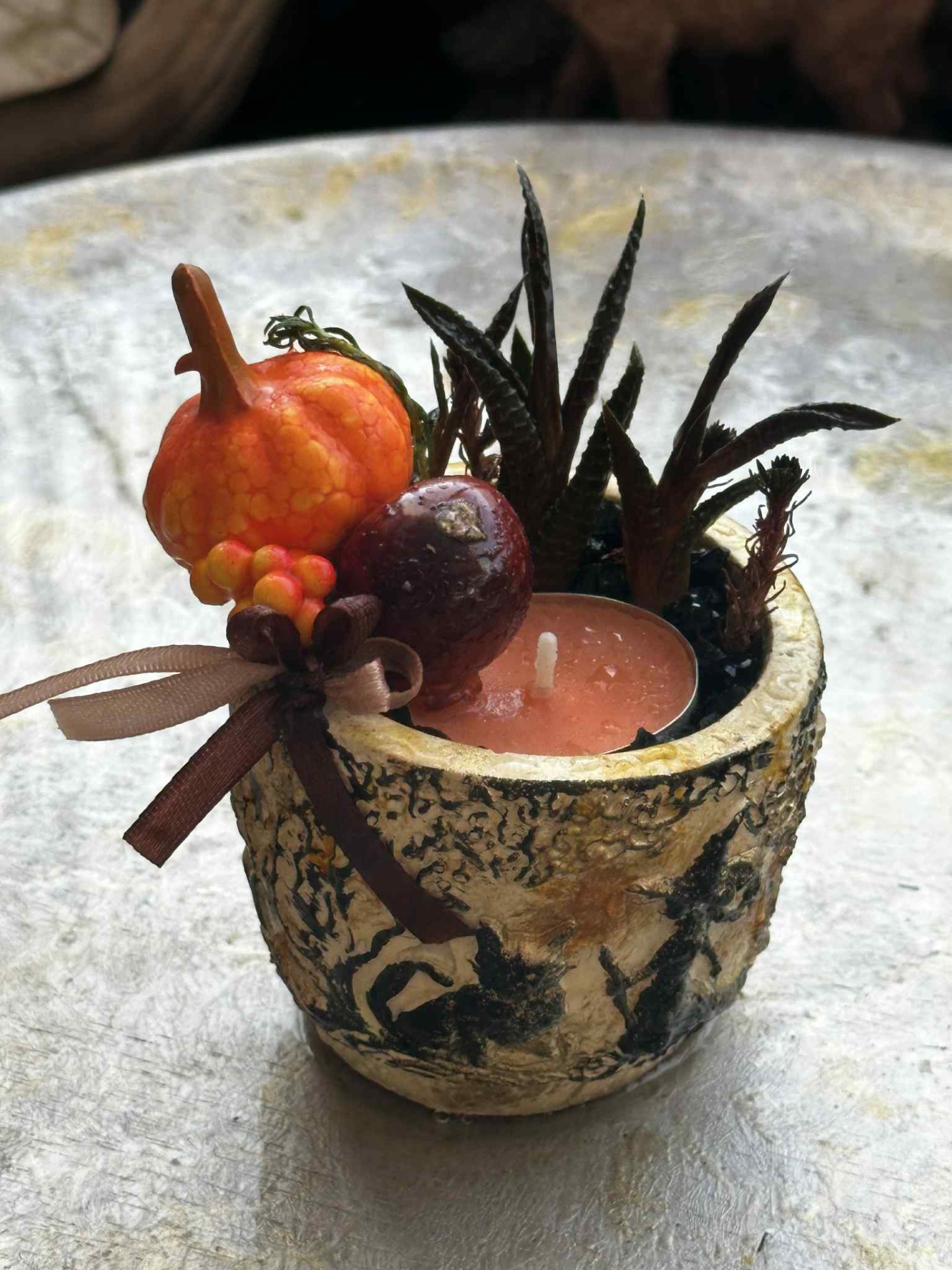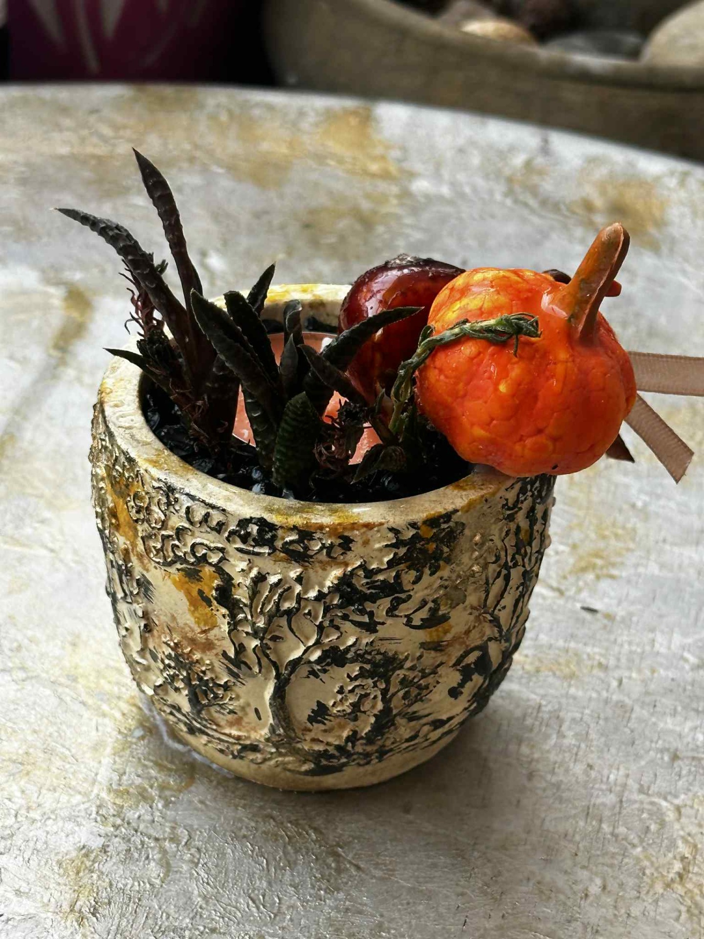 Fagyálló, őszi, boszorkány és fekete macska kaspó, élő pozsgással, teamécsessel, dekorációval, dekorkővel megszórva, sárga fekete, narancs színösszeállítással.