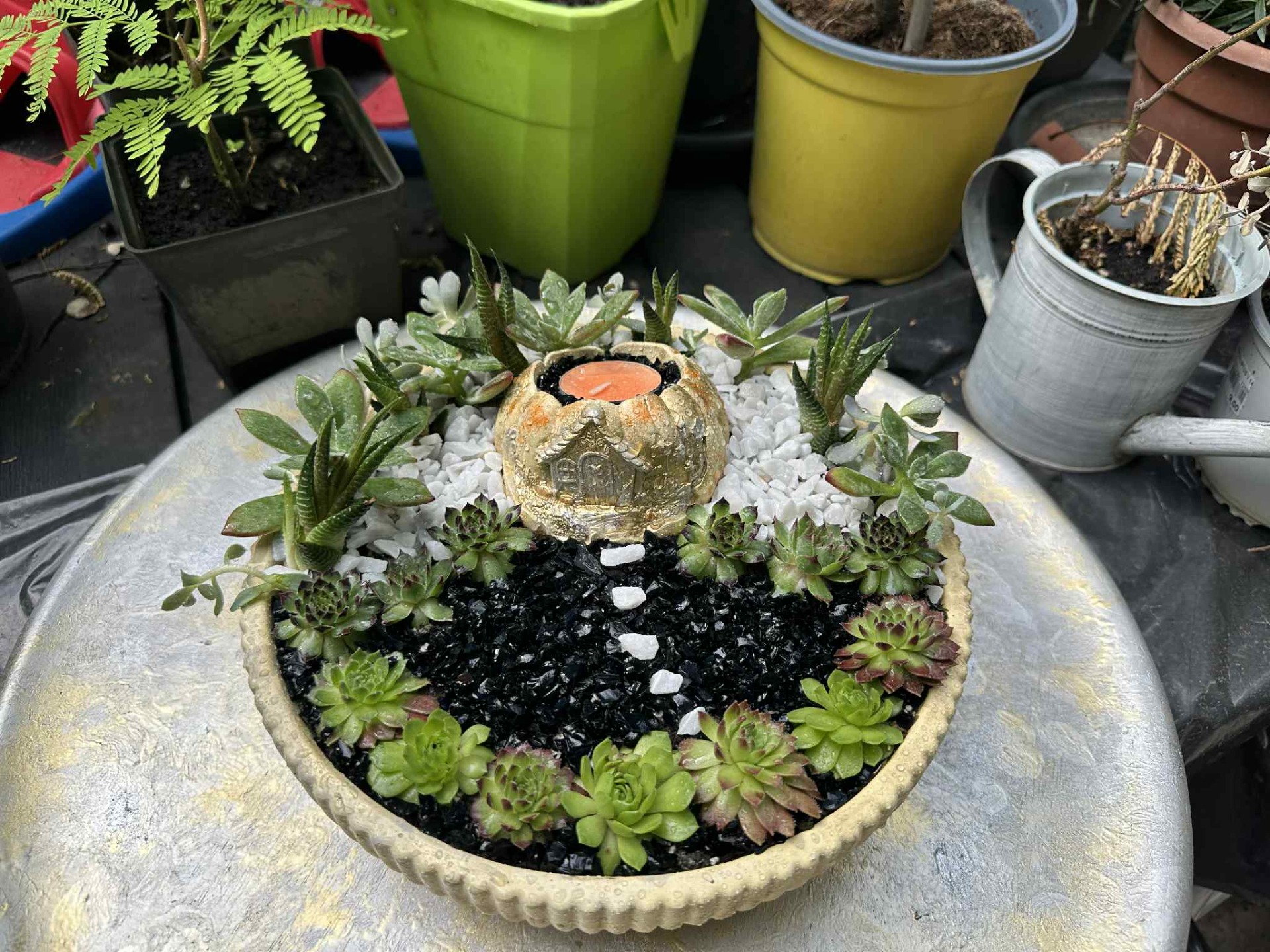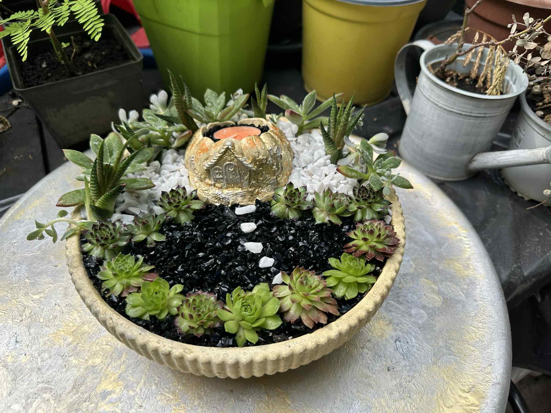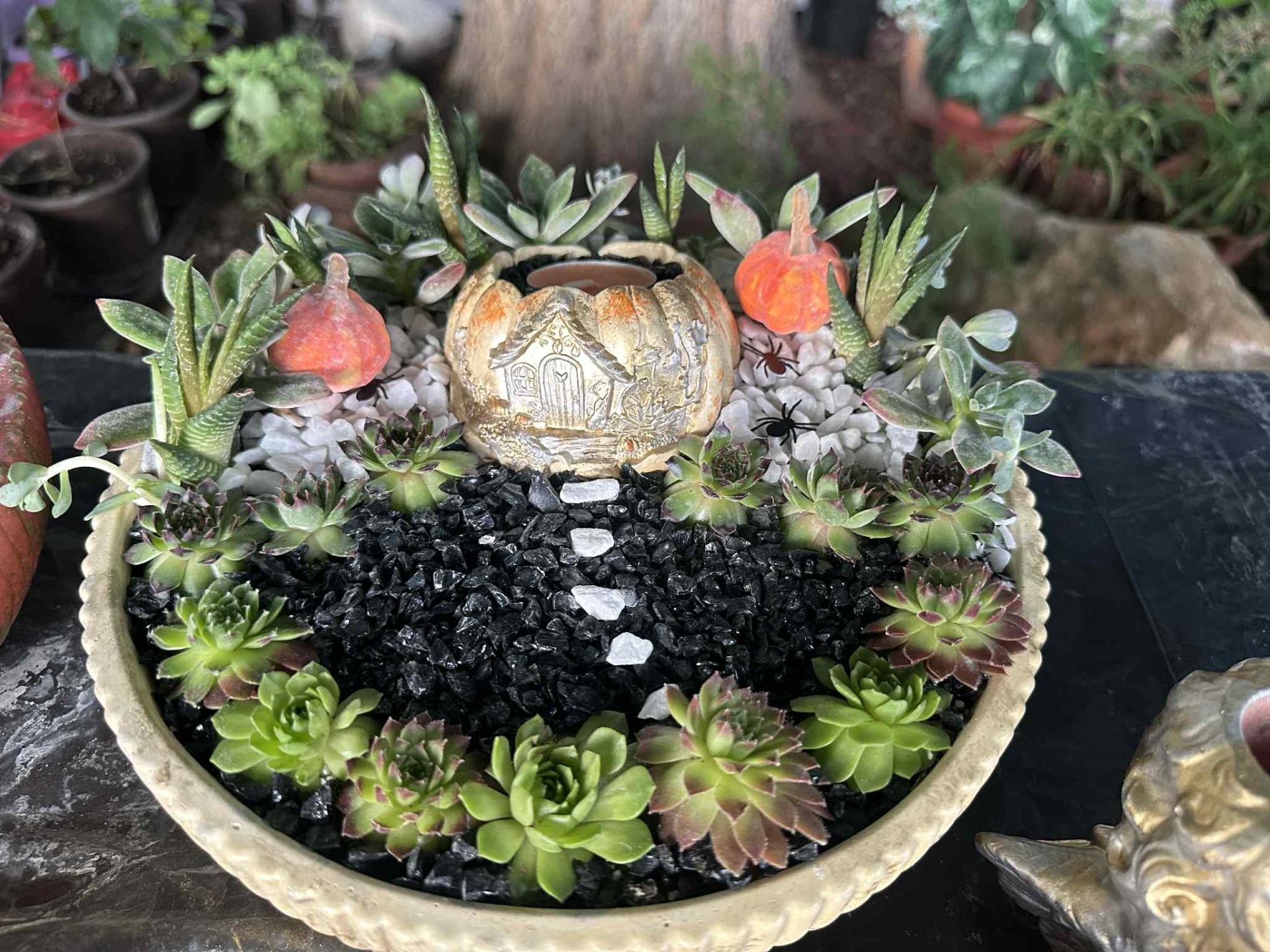 Fagyálló dekortál, fagyálló halloween tökházas kaspóval, teamécsessel, élő pozsgásokkal beültetve, díszkavicsokkal megszórva, egyéb dekorációval, zöld, sárga,narancssárga, arany, fehér, fekete színösszeállítással.