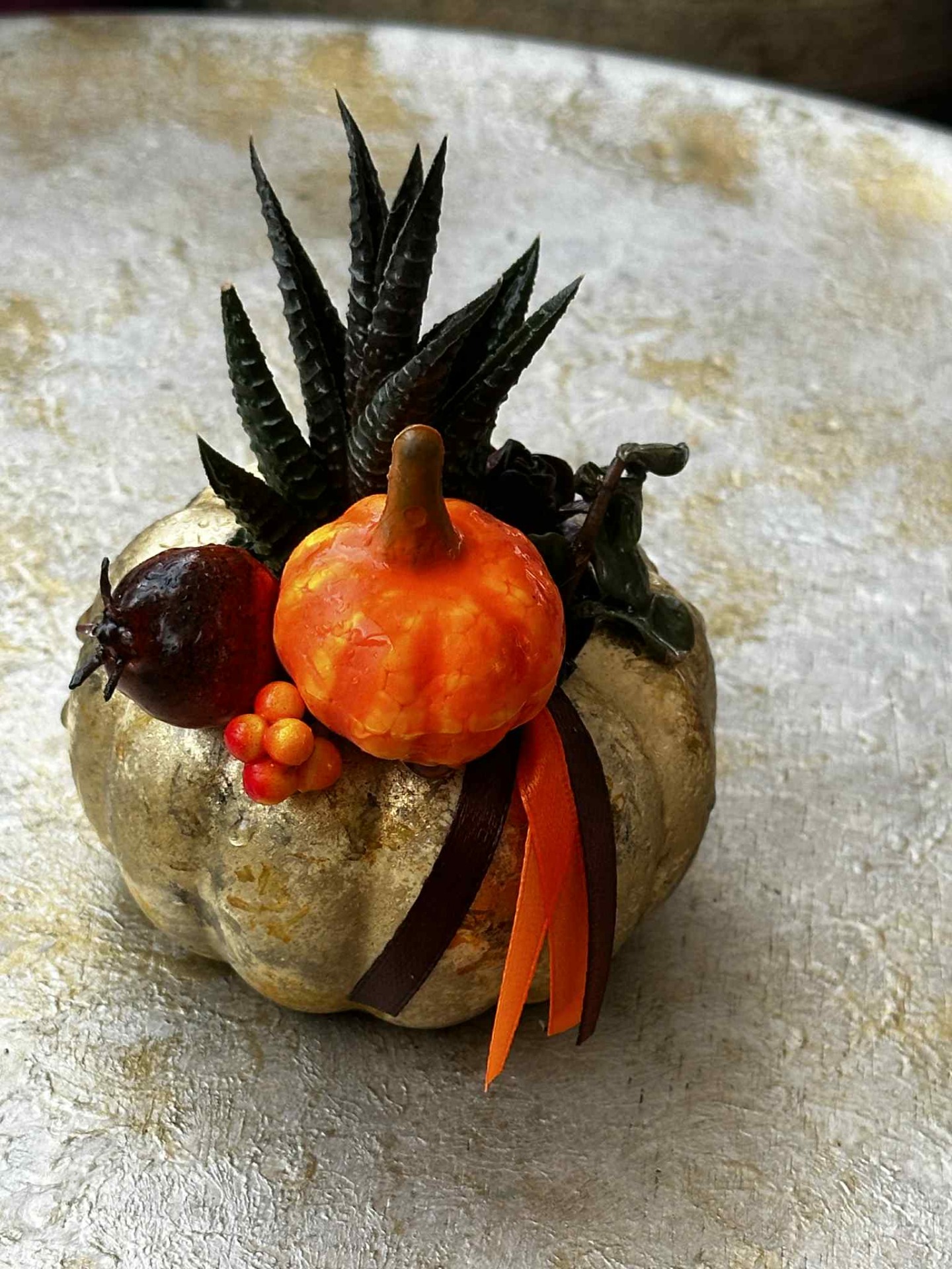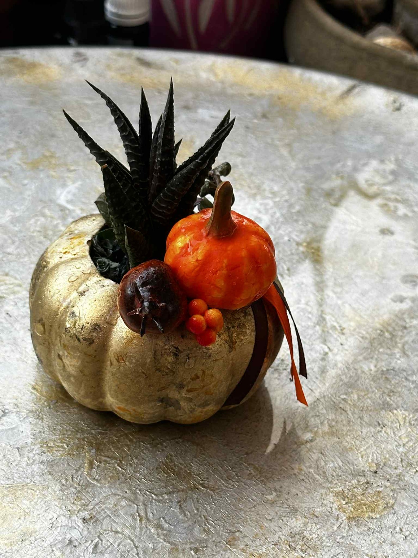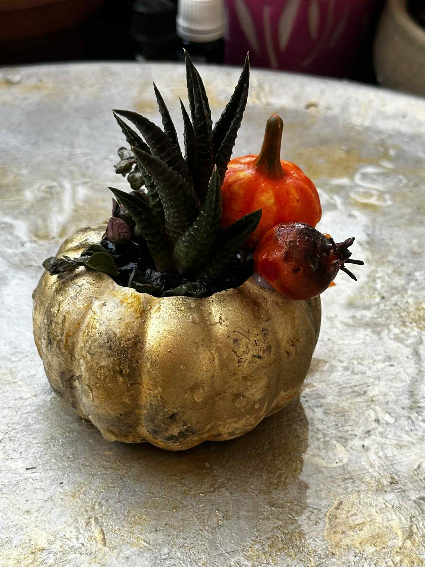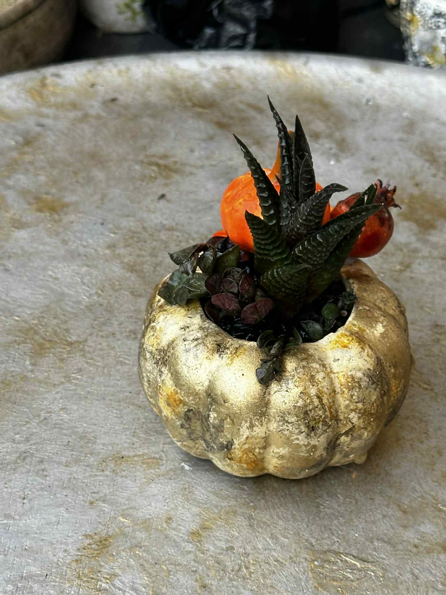 Őszi, halloween tök kaspó, élő pozsgással, arany, fekete, narancs, 3