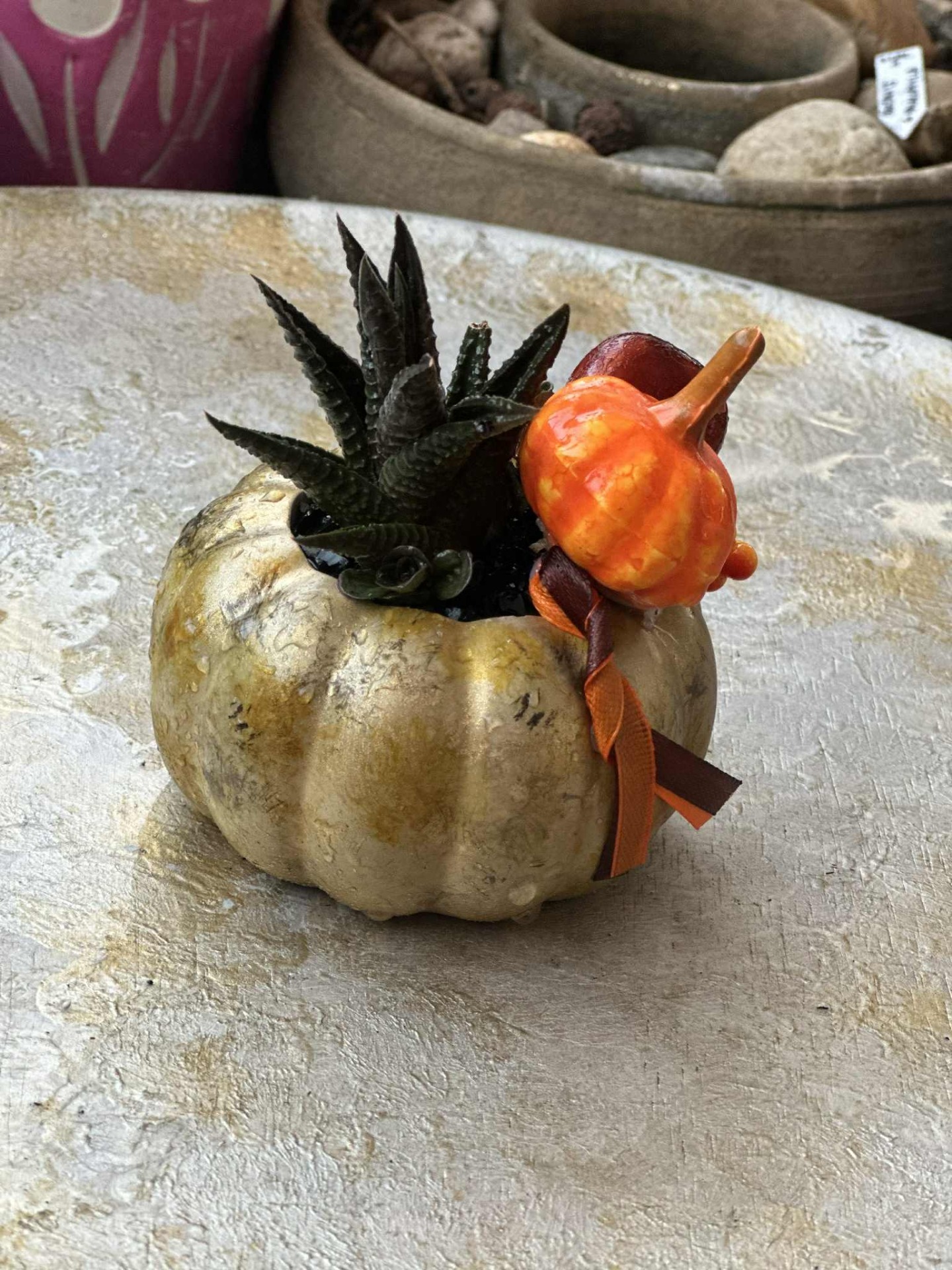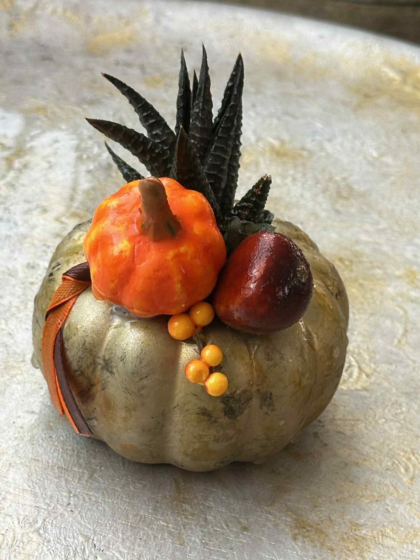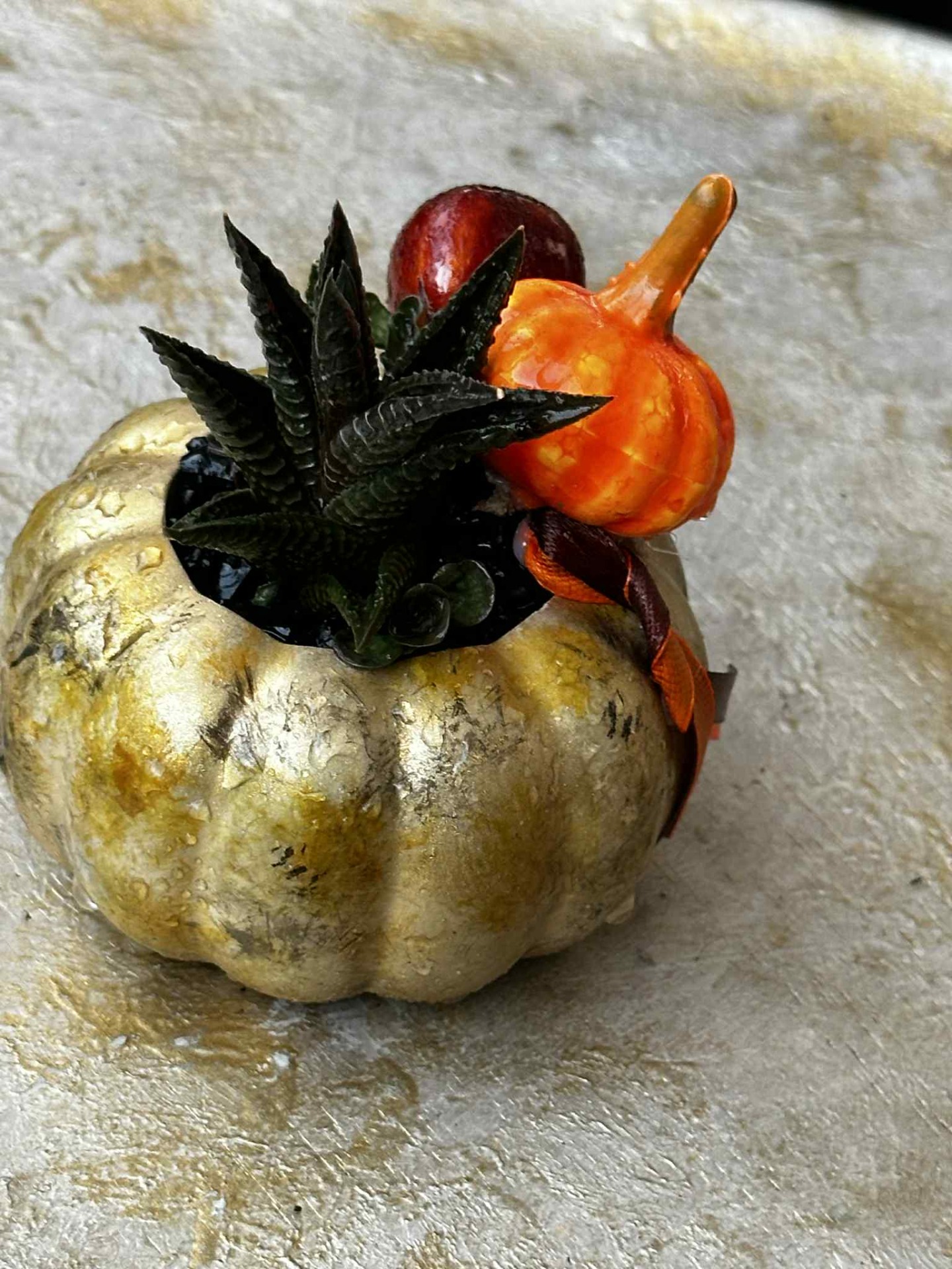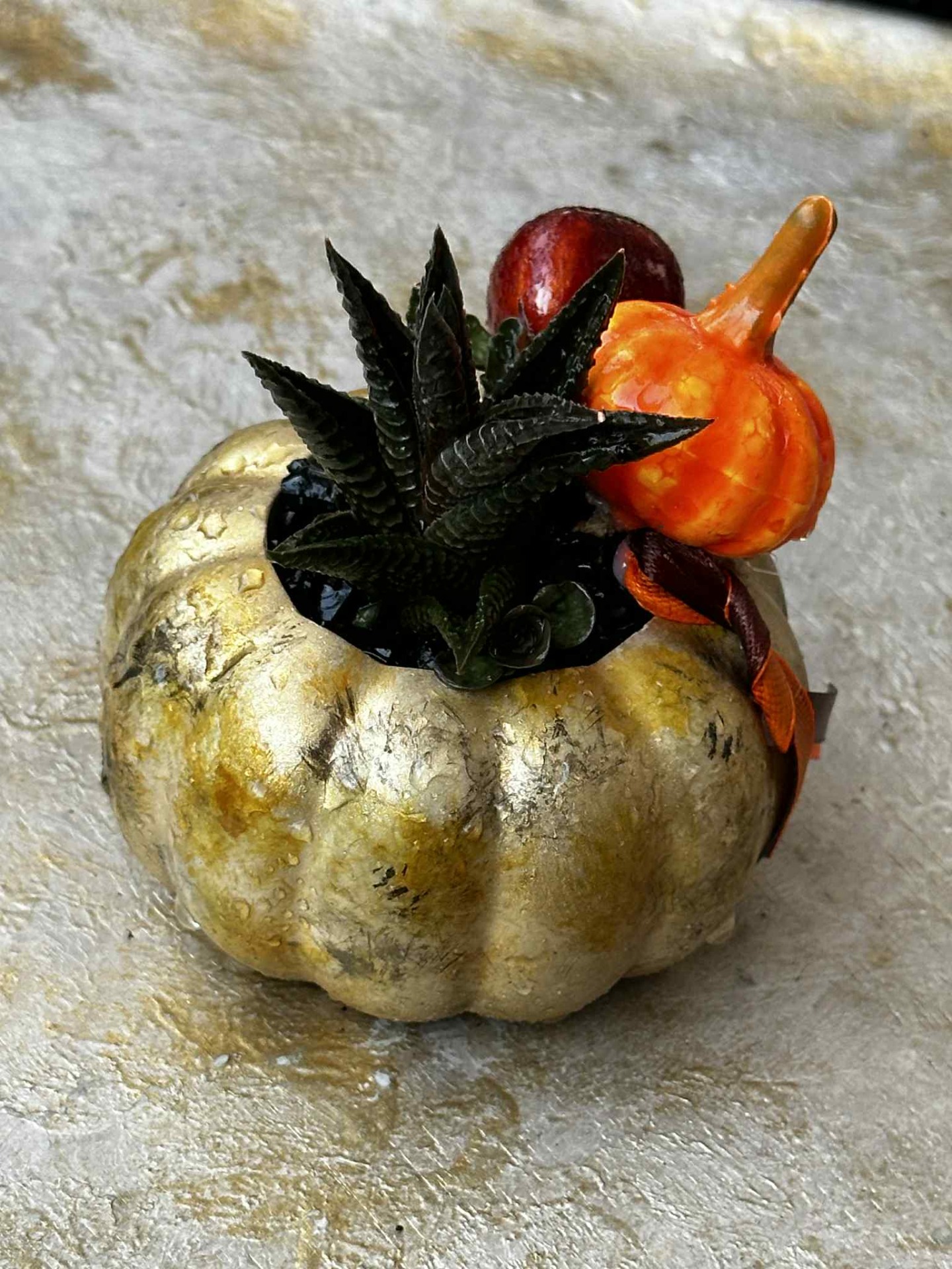 Őszi, halloween tök kaspó, élő pozsgással, arany, fekete, narancs, 5