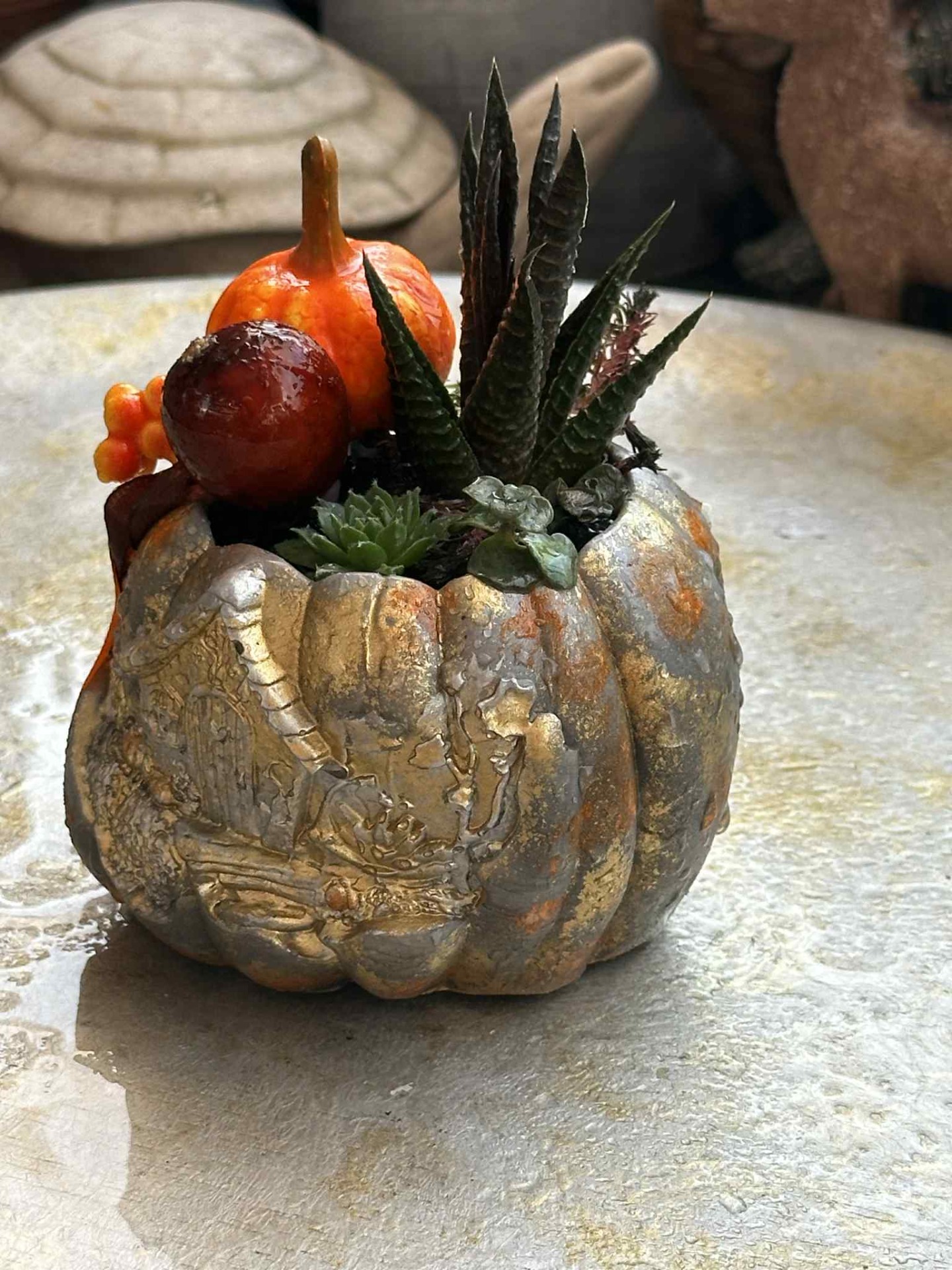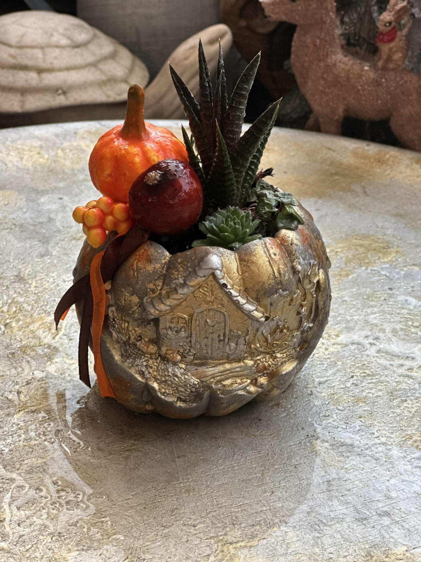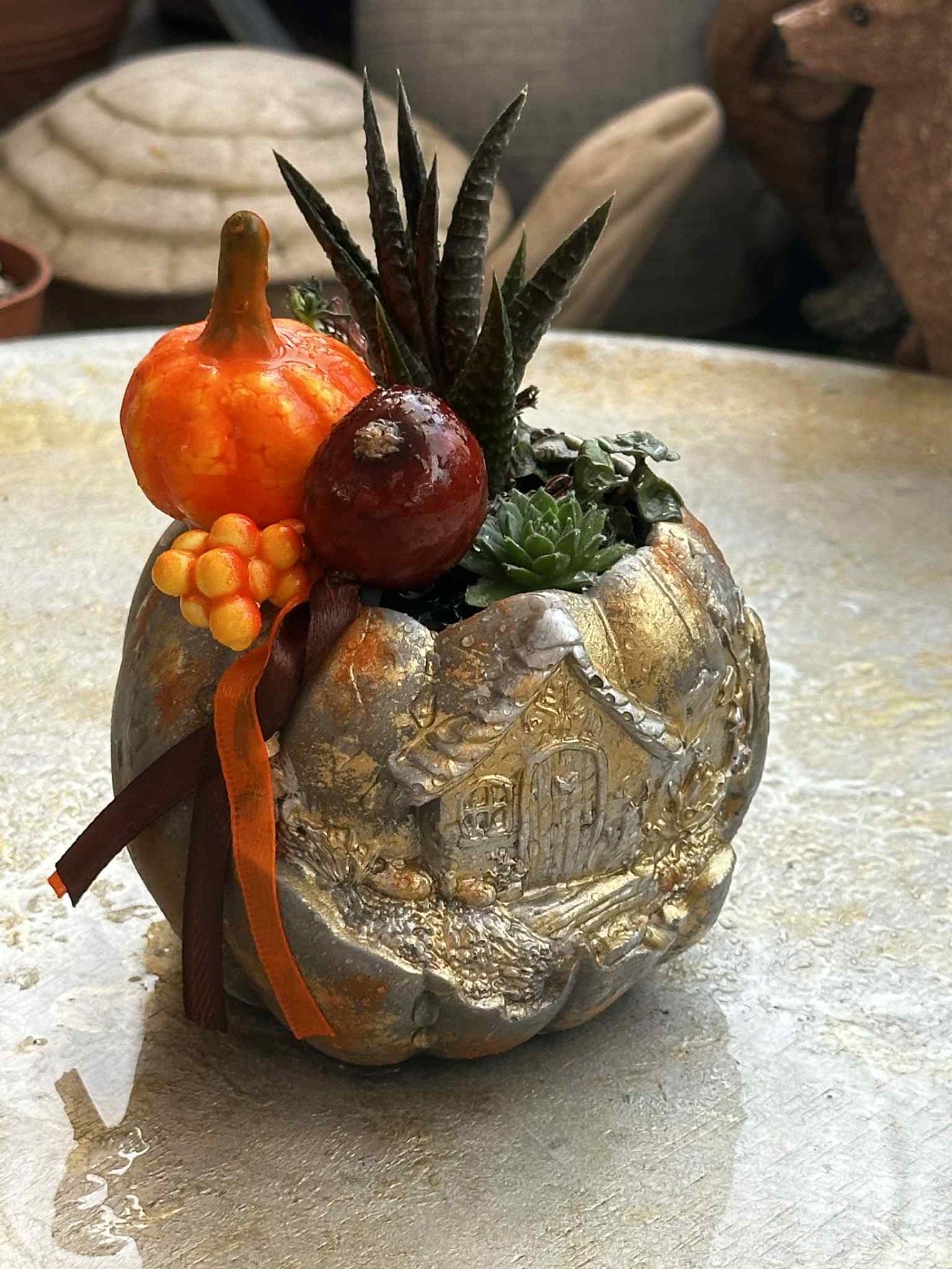 Fagyálló, őszi, halloween kaspó, élő pozsgásokkal beültetve, dekorációval, szalagokkal, fekete dekorkővel megszórva, ezüst, arany és narancs színösszeállítással.