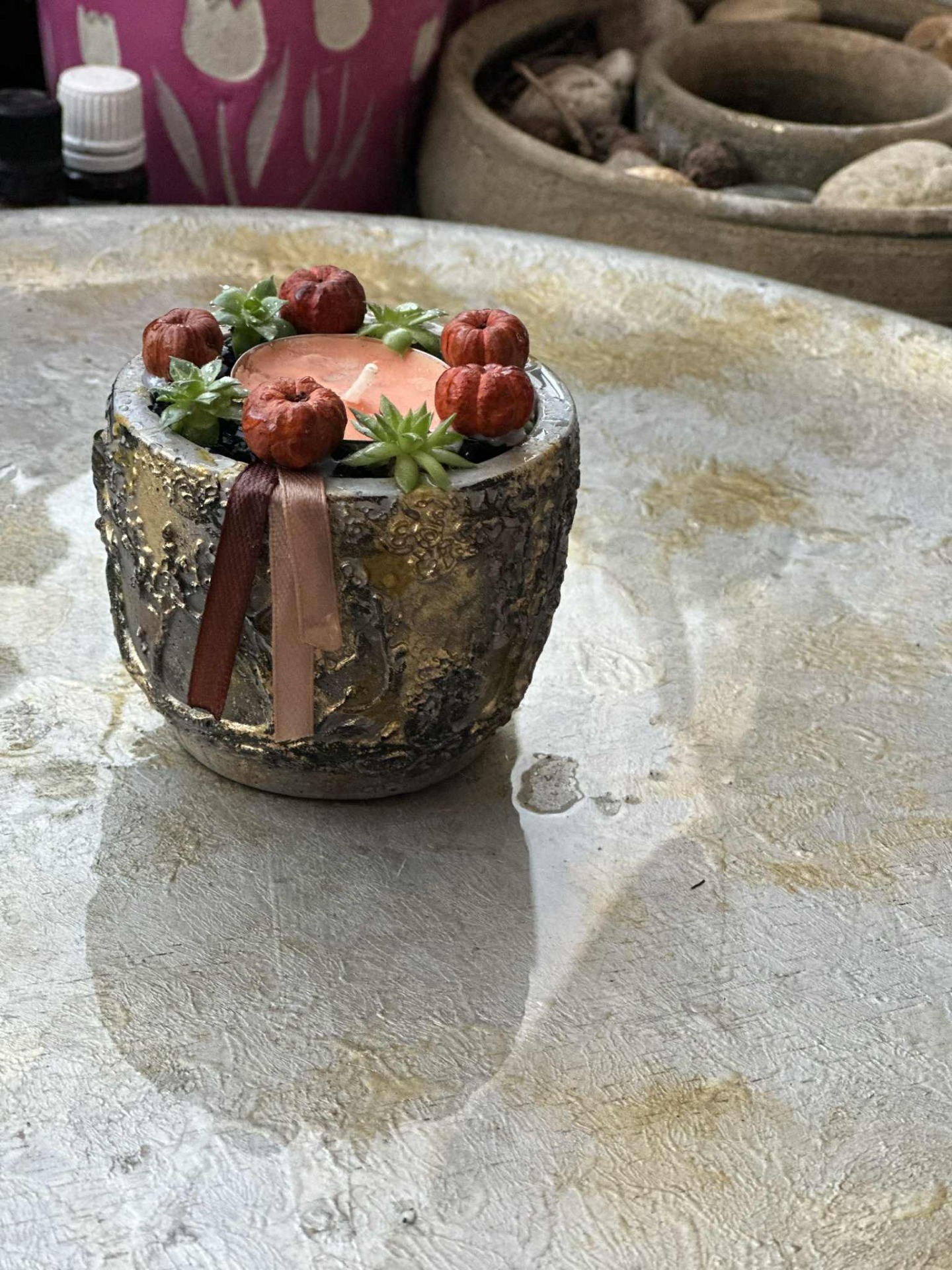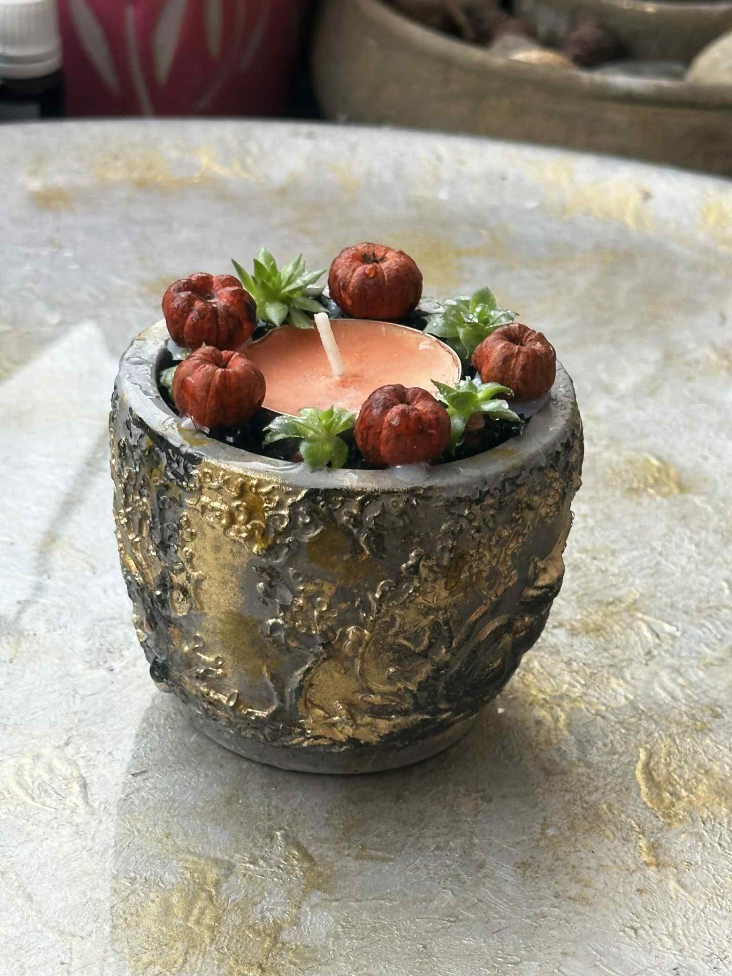 Fagyálló, őszi, boszorkány és fekete macska kaspó, élő pozsgással, teamécsessel, dekorációval, dekorkővel megszórva, szürke, arany, fekete színösszeállítással.