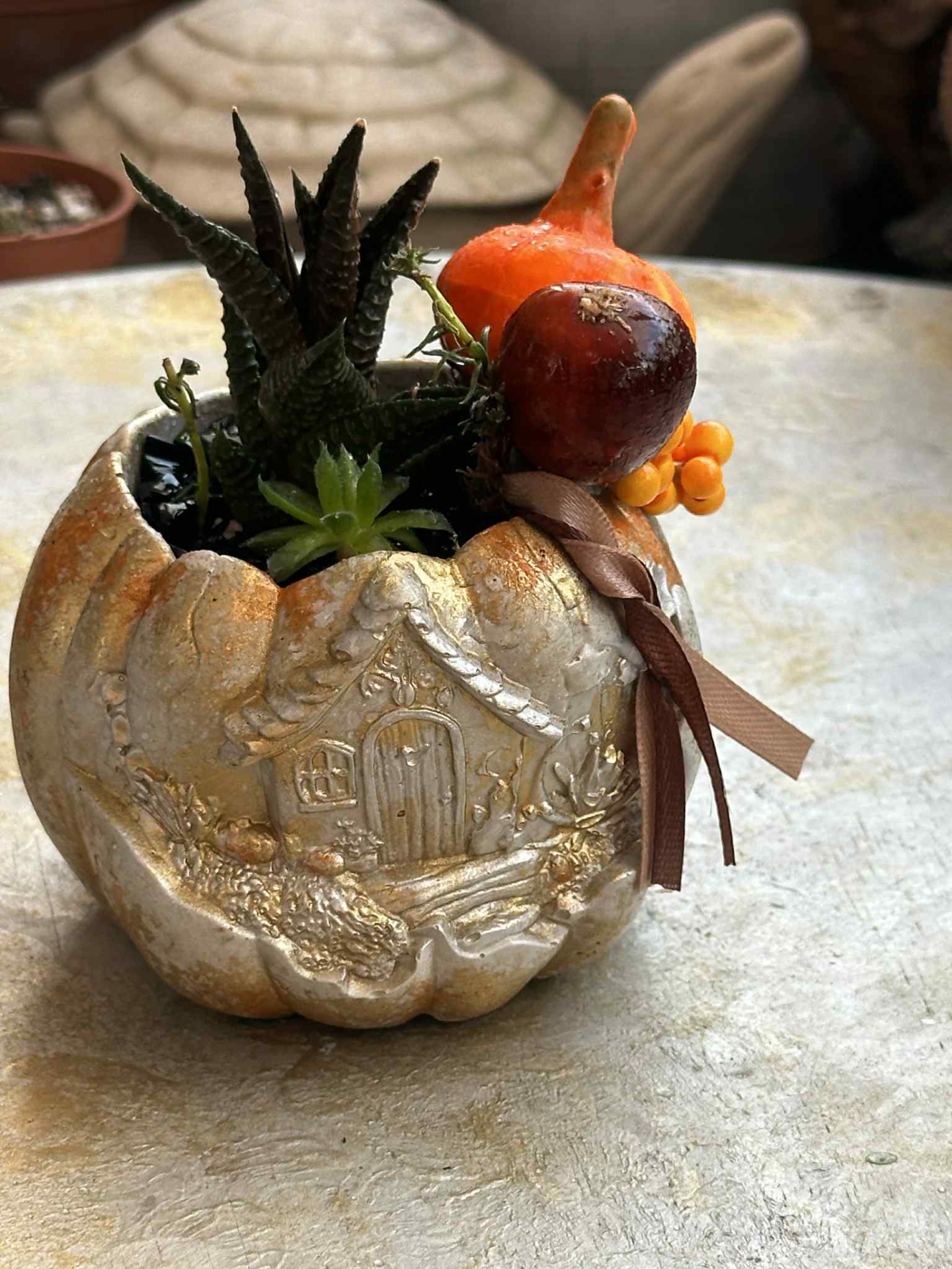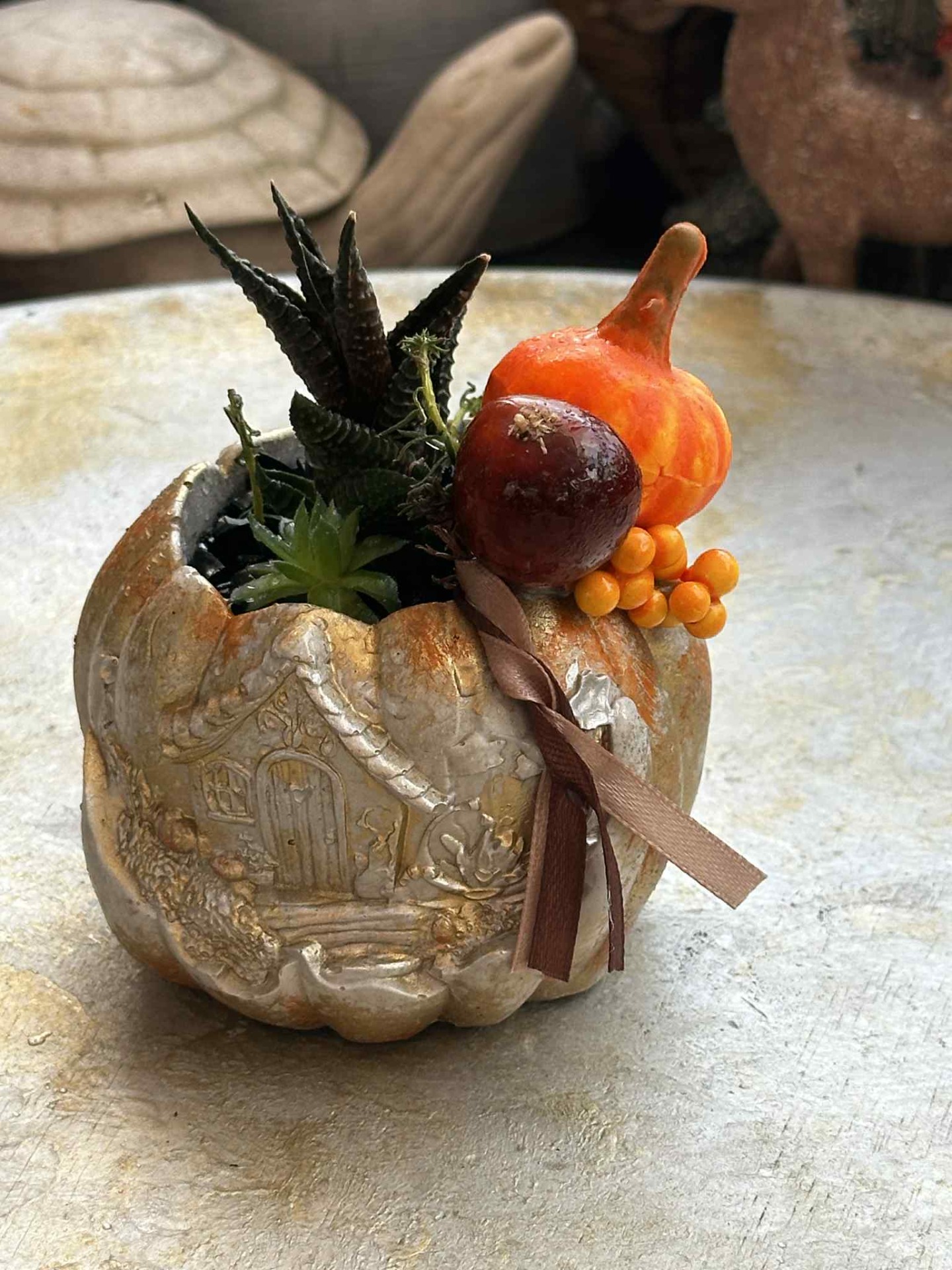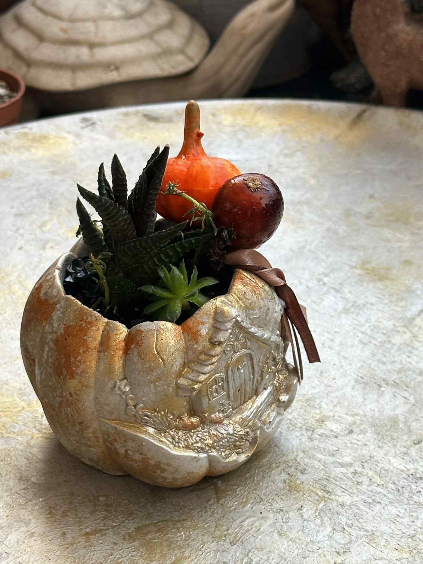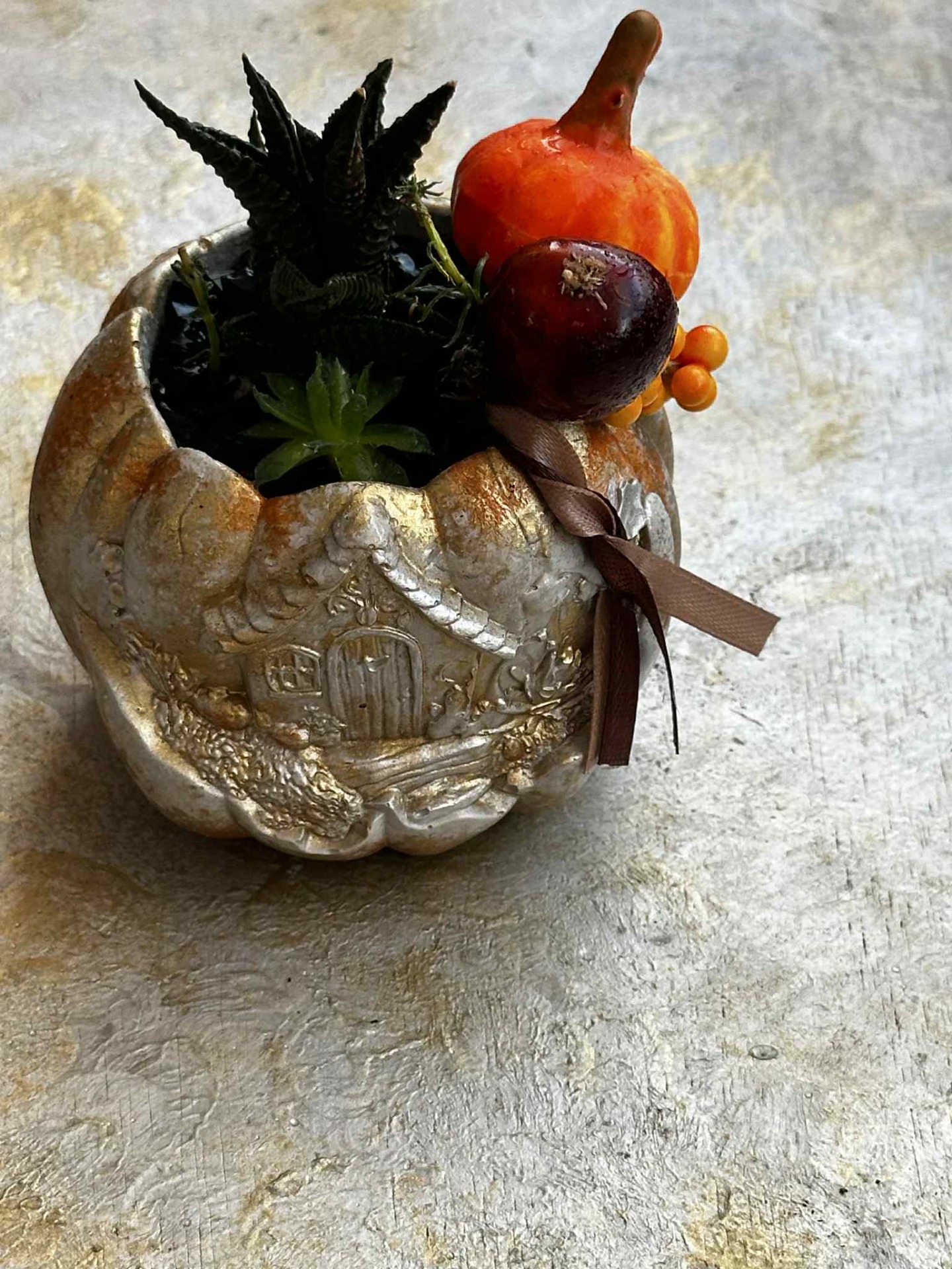 Őszi, halloween tök kaspó, élő pozsgással, narancs, arany, ezüst, 1