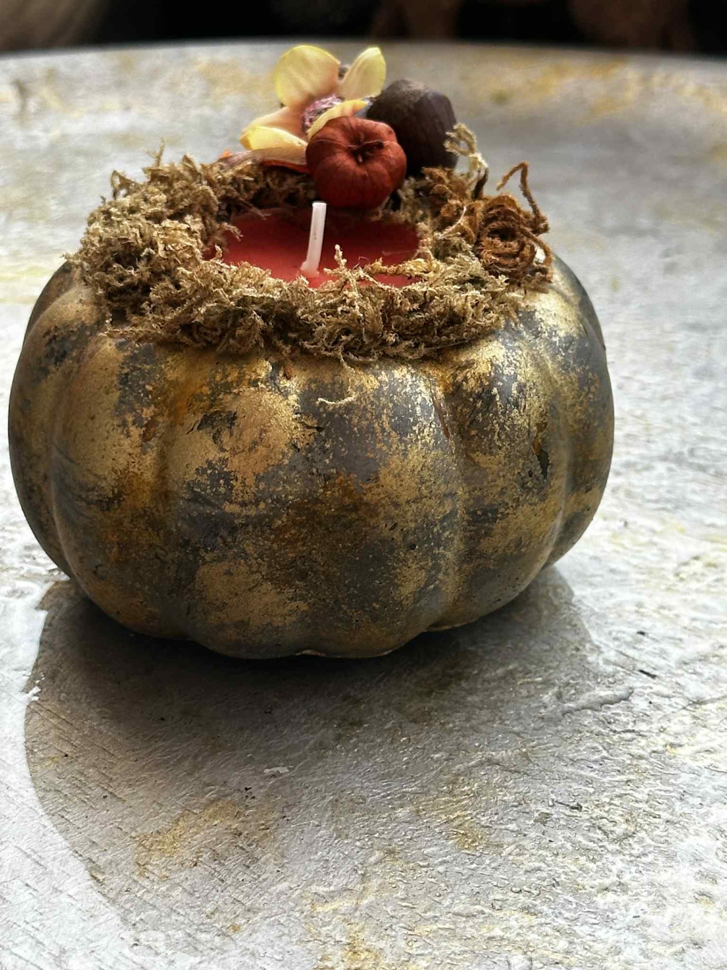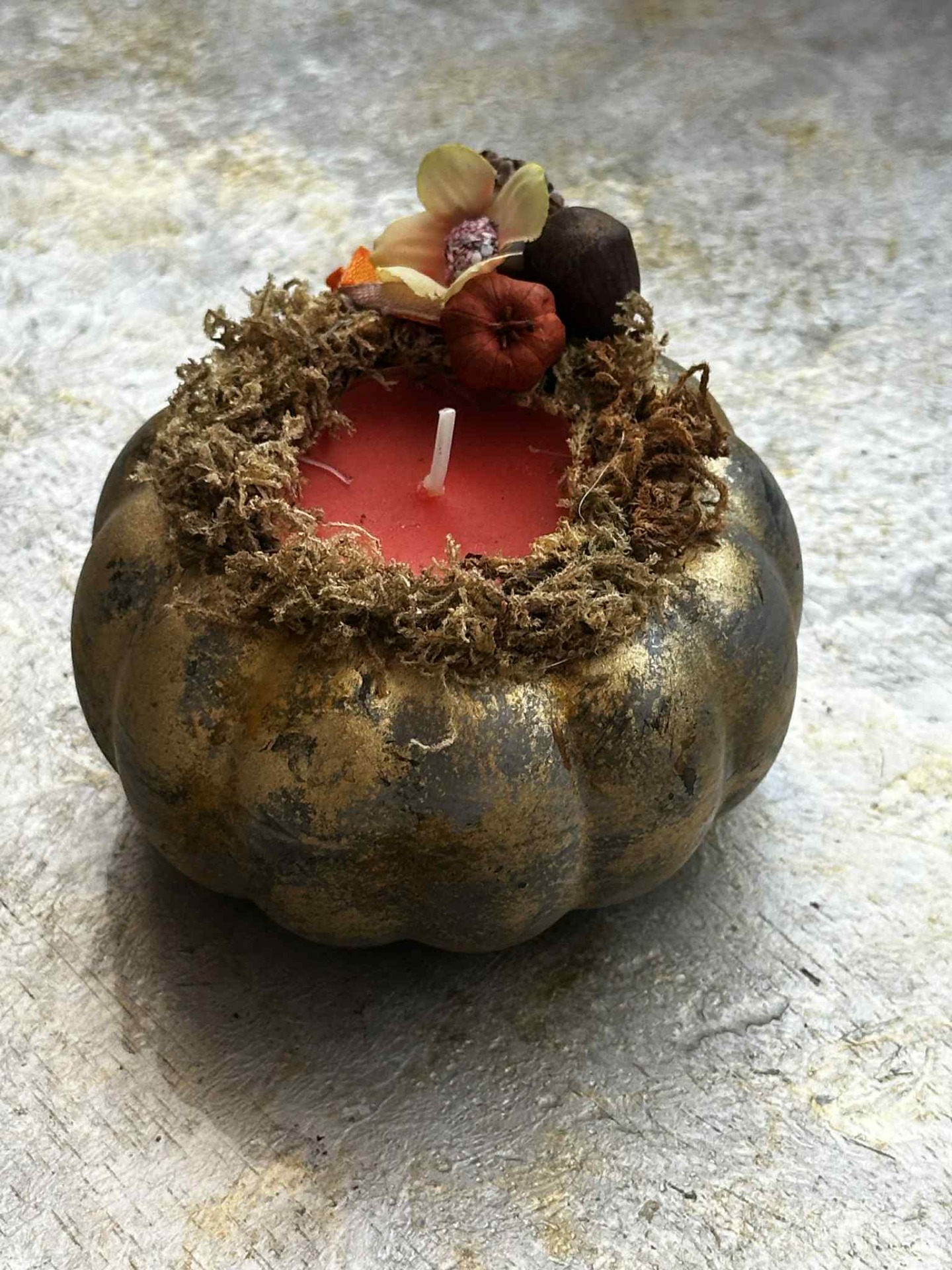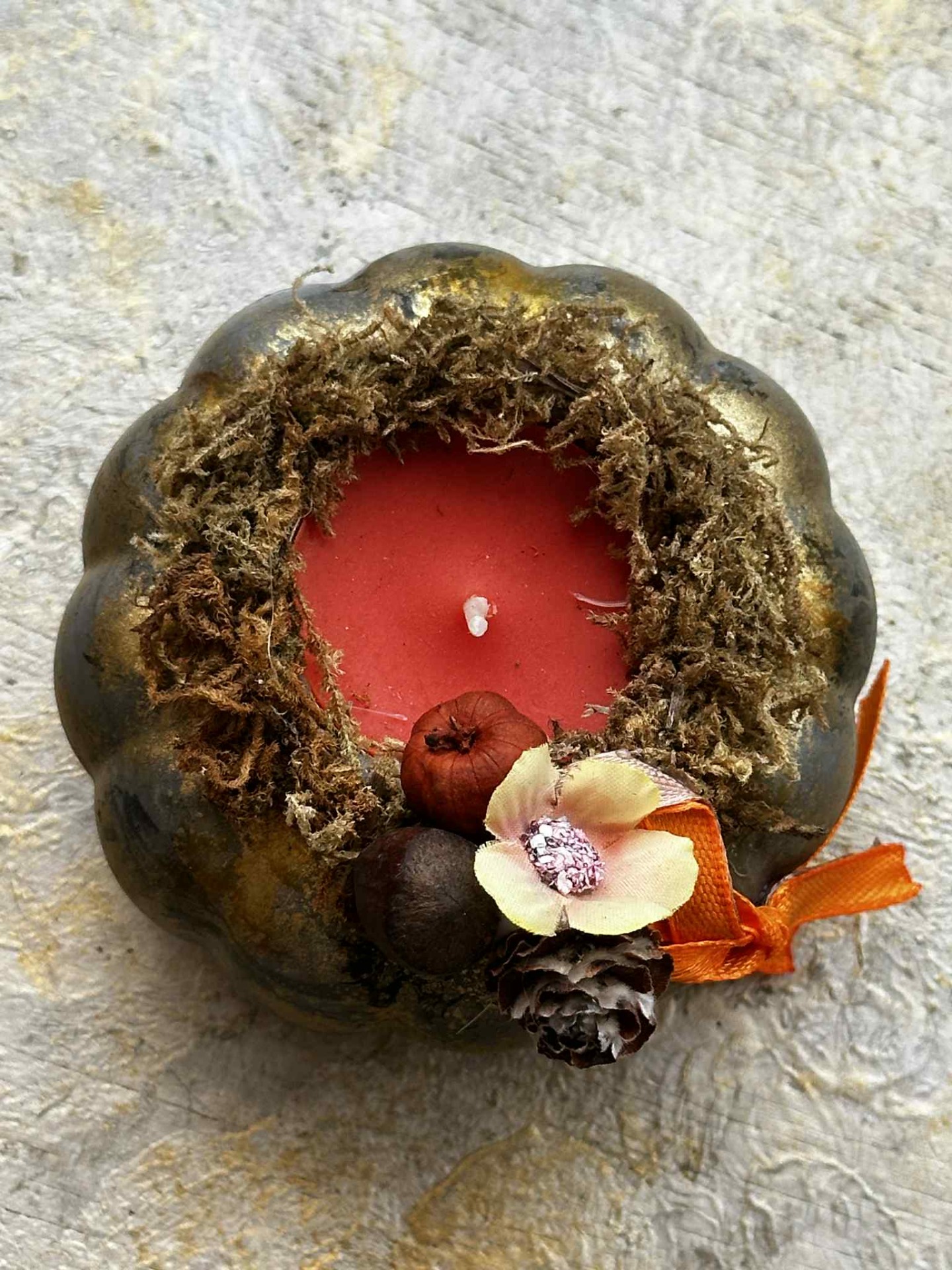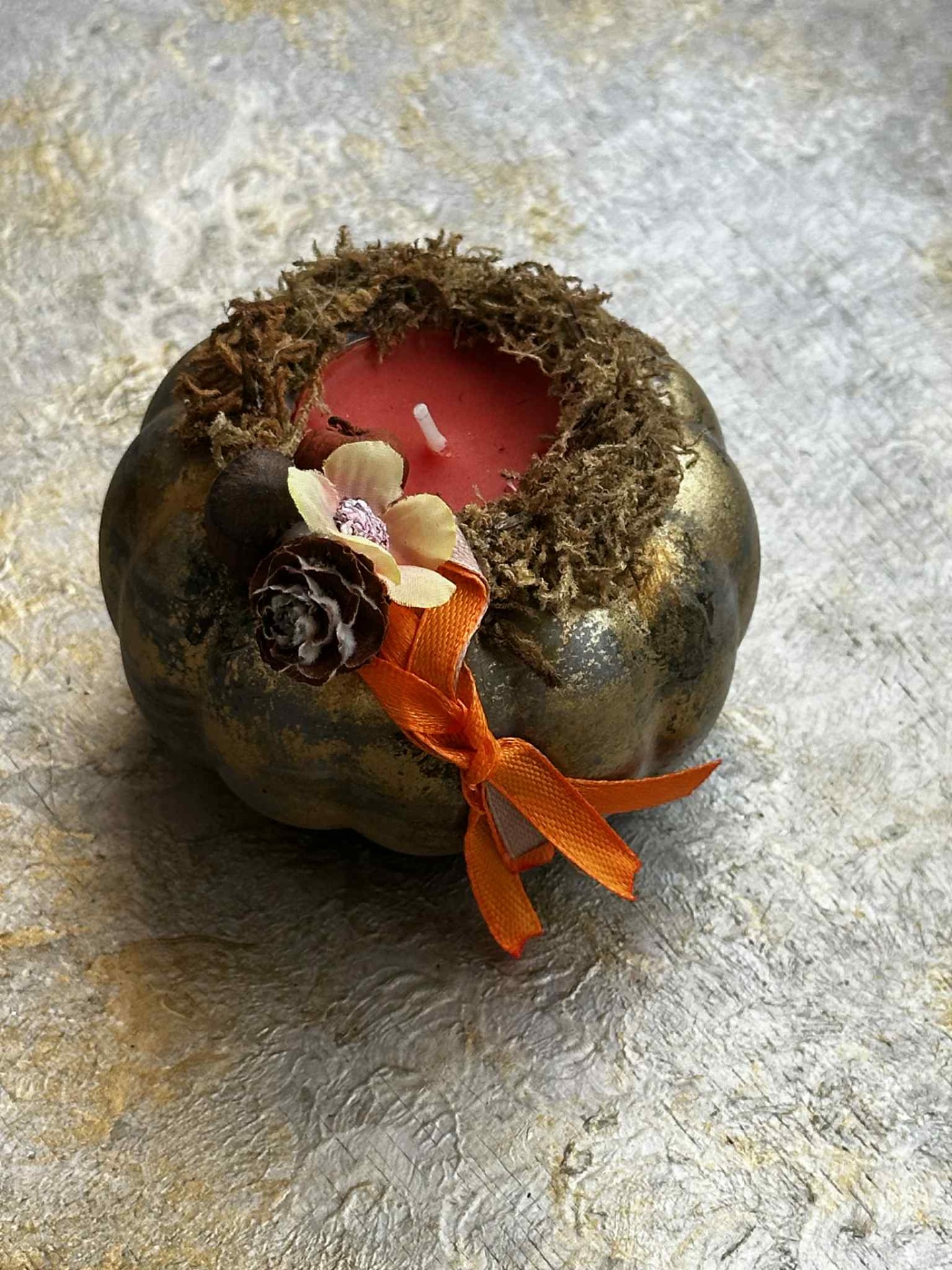 Őszi, fagyálló, halloween tök formájú kaspó szárazanyag dekorációval, teamécsessel.